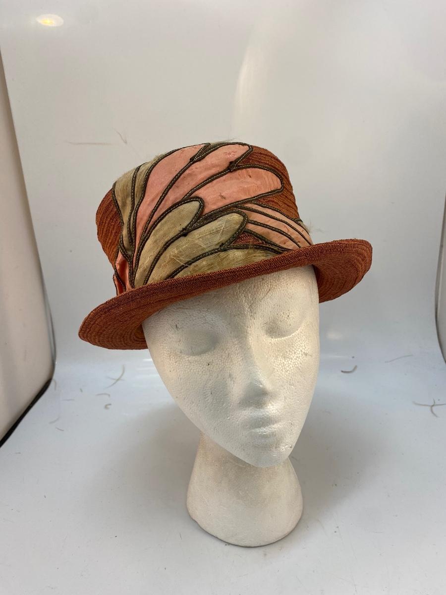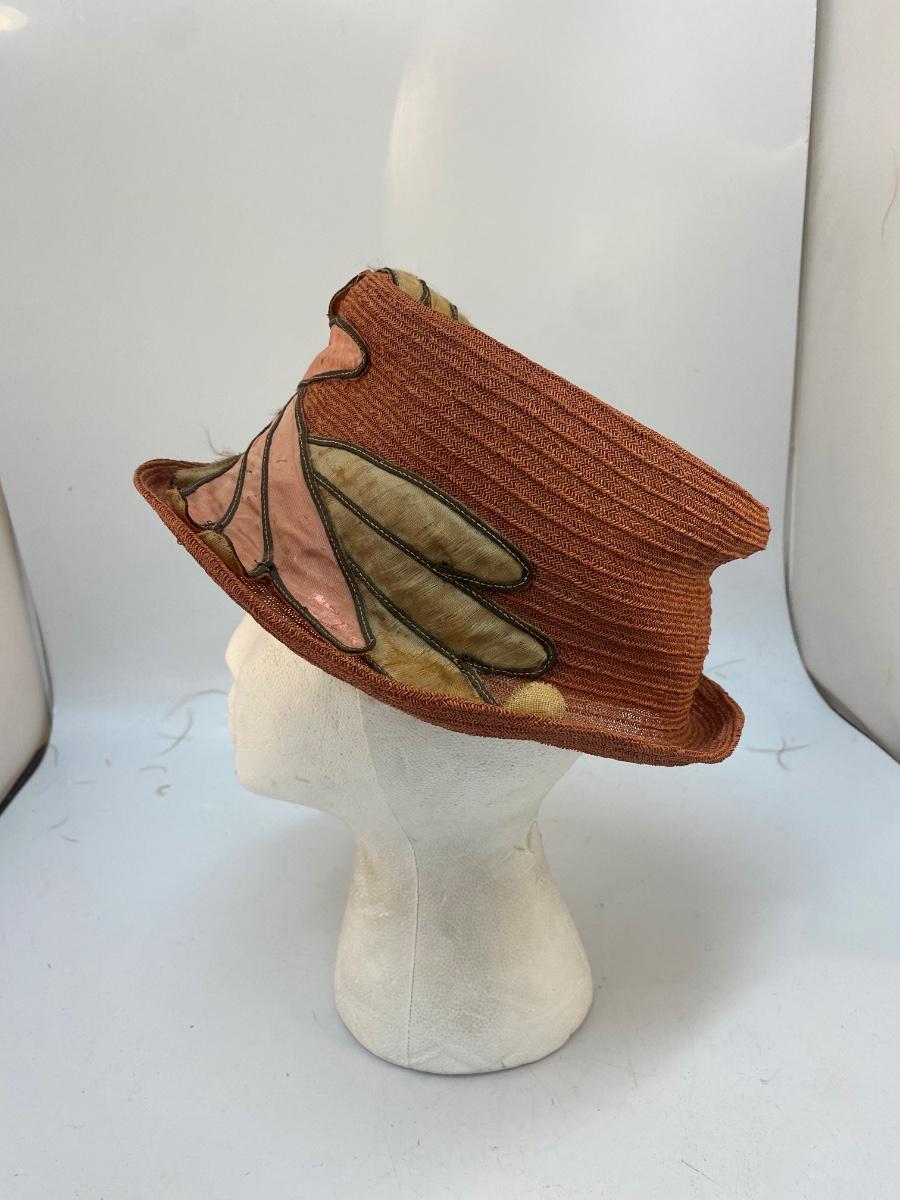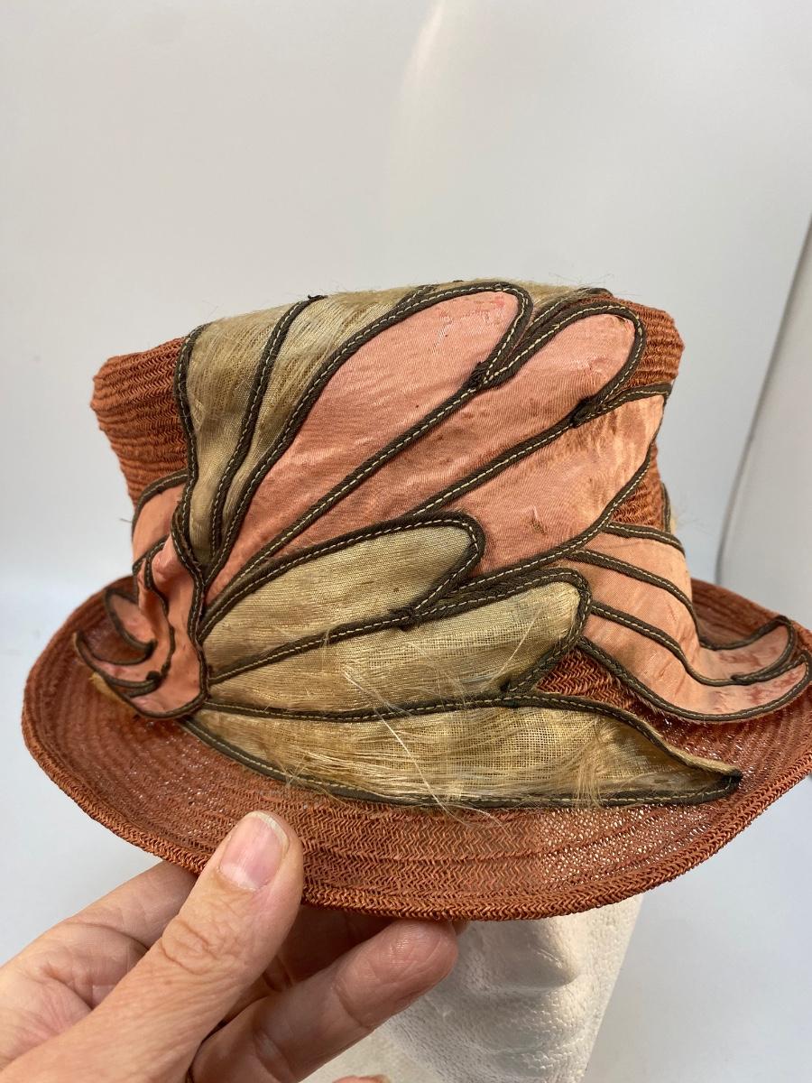Vintage Antique Straw Hat Fedora Cap Dark Dusty Rose Pink. In good vintage condition. No holes but discolor from age. The applique fabric does show signs of age.