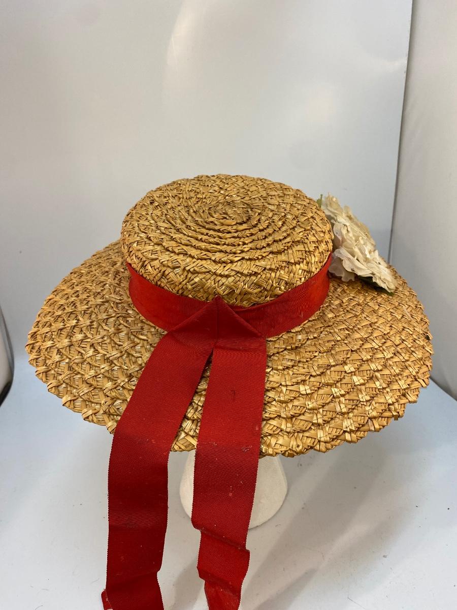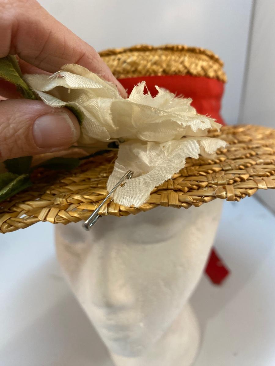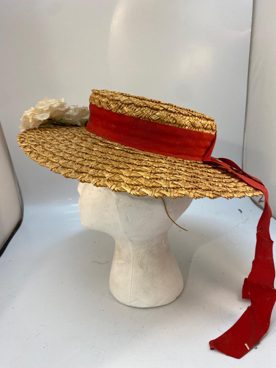 Vintage Victorian Thick Weave Straw Hat with Red Ribbon and White Flowers