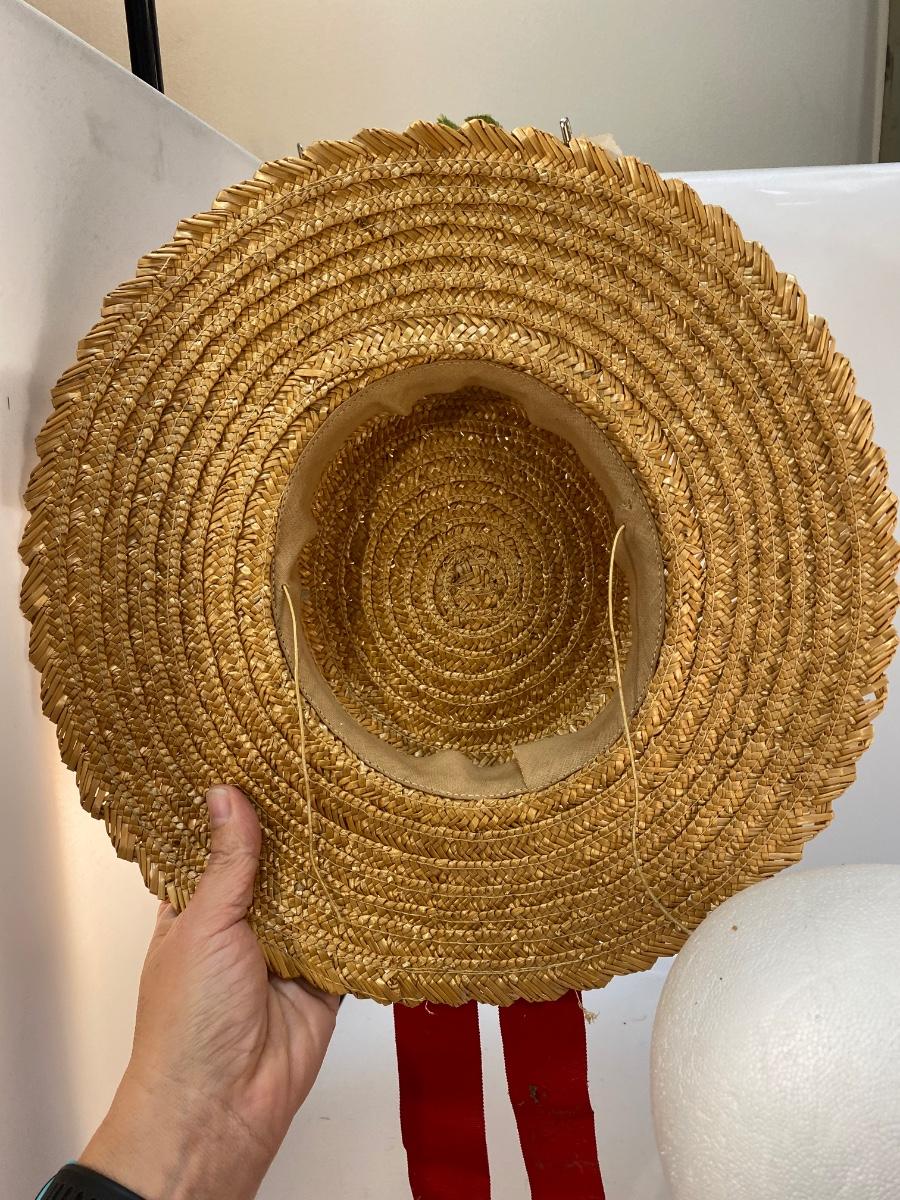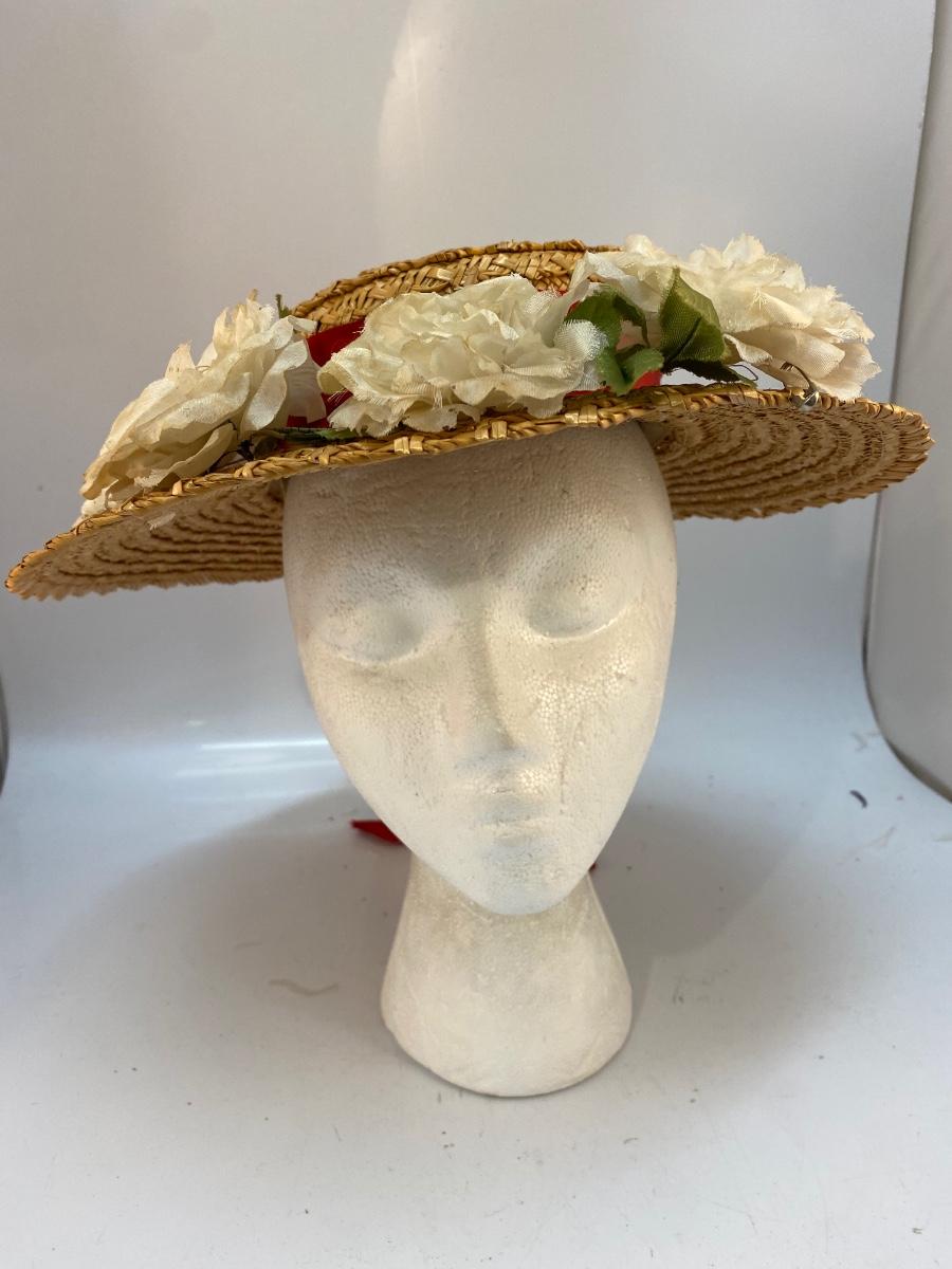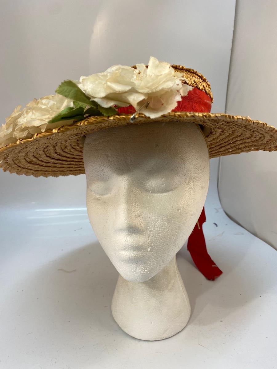Vintage Victorian Thick Weave Straw Hat with Red Ribbon and White Flowers
