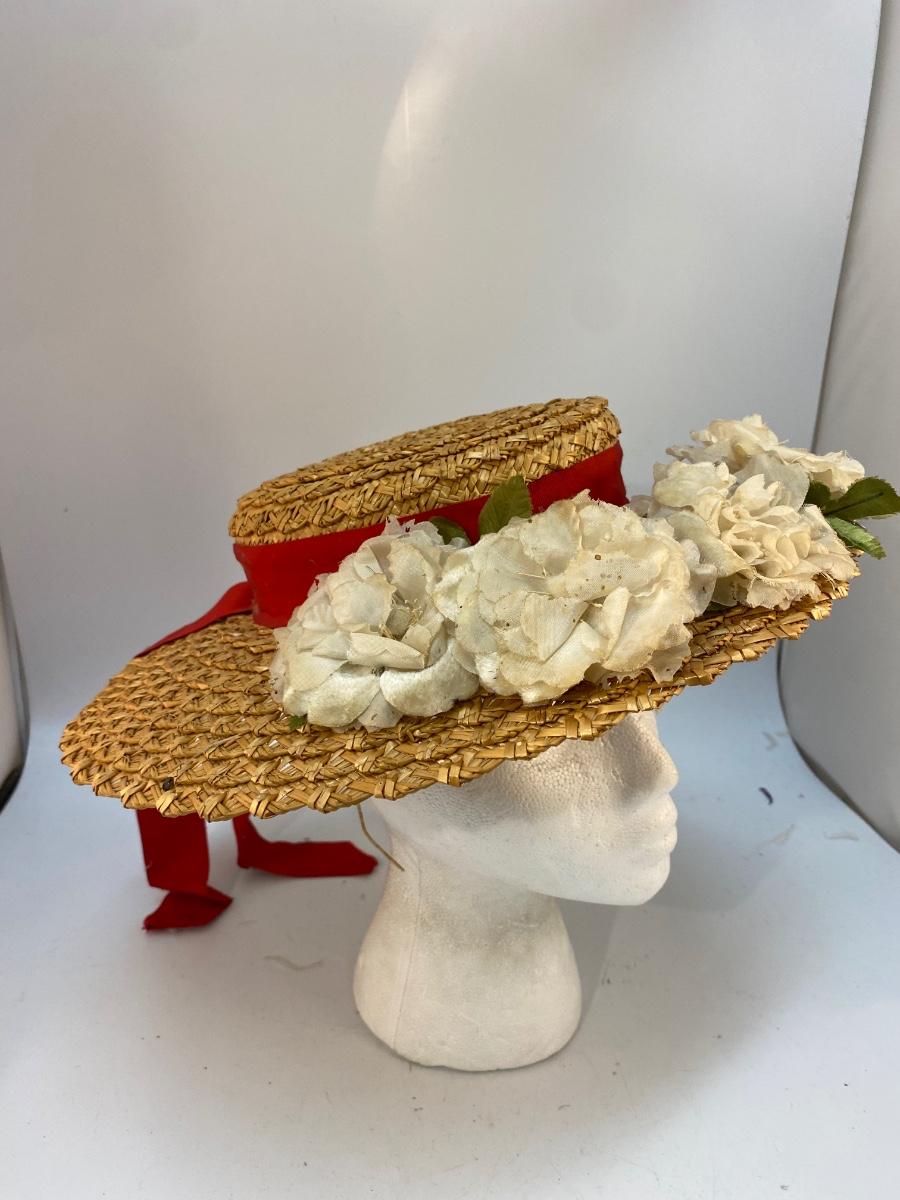 Vintage Victorian Thick Weave Straw Hat with Red Ribbon and White Flowers. In good vintage condition. The white flowers are pinned in one spot and quick stitched in another and can be easily removed.