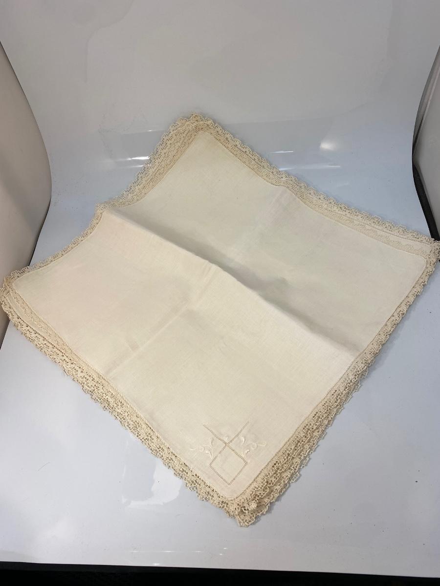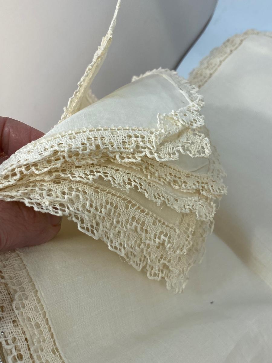 Vintage Lace Edge Embroidered Set of Off-White Ivory Linen Dinner Napkins. May have a light spot here or there but look to be in good vintage condition.