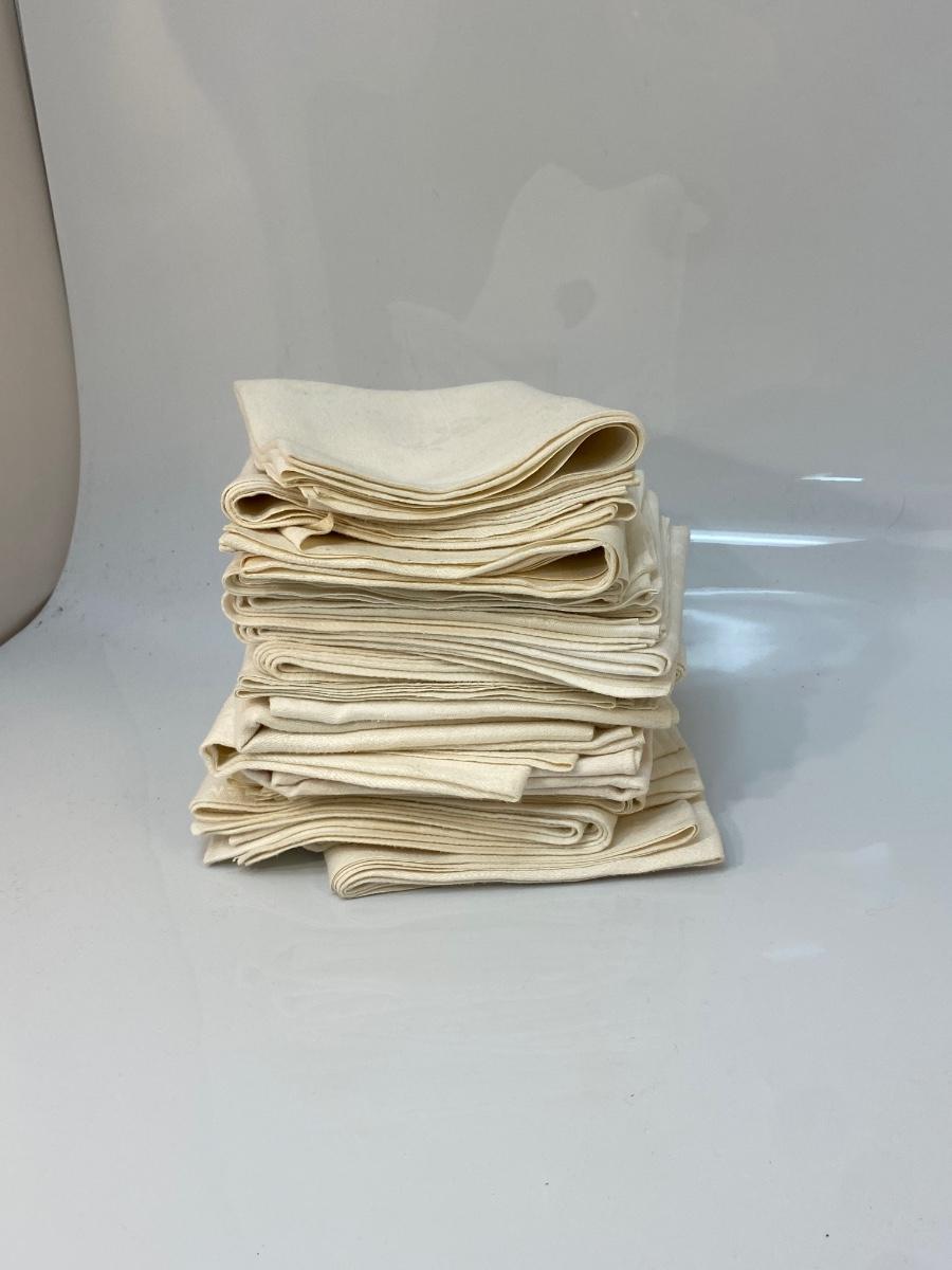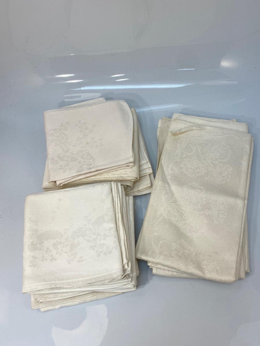 Large Lot of White on White Floral Damask Linen Dinner Napkins. May have spots or stains. Large lot.