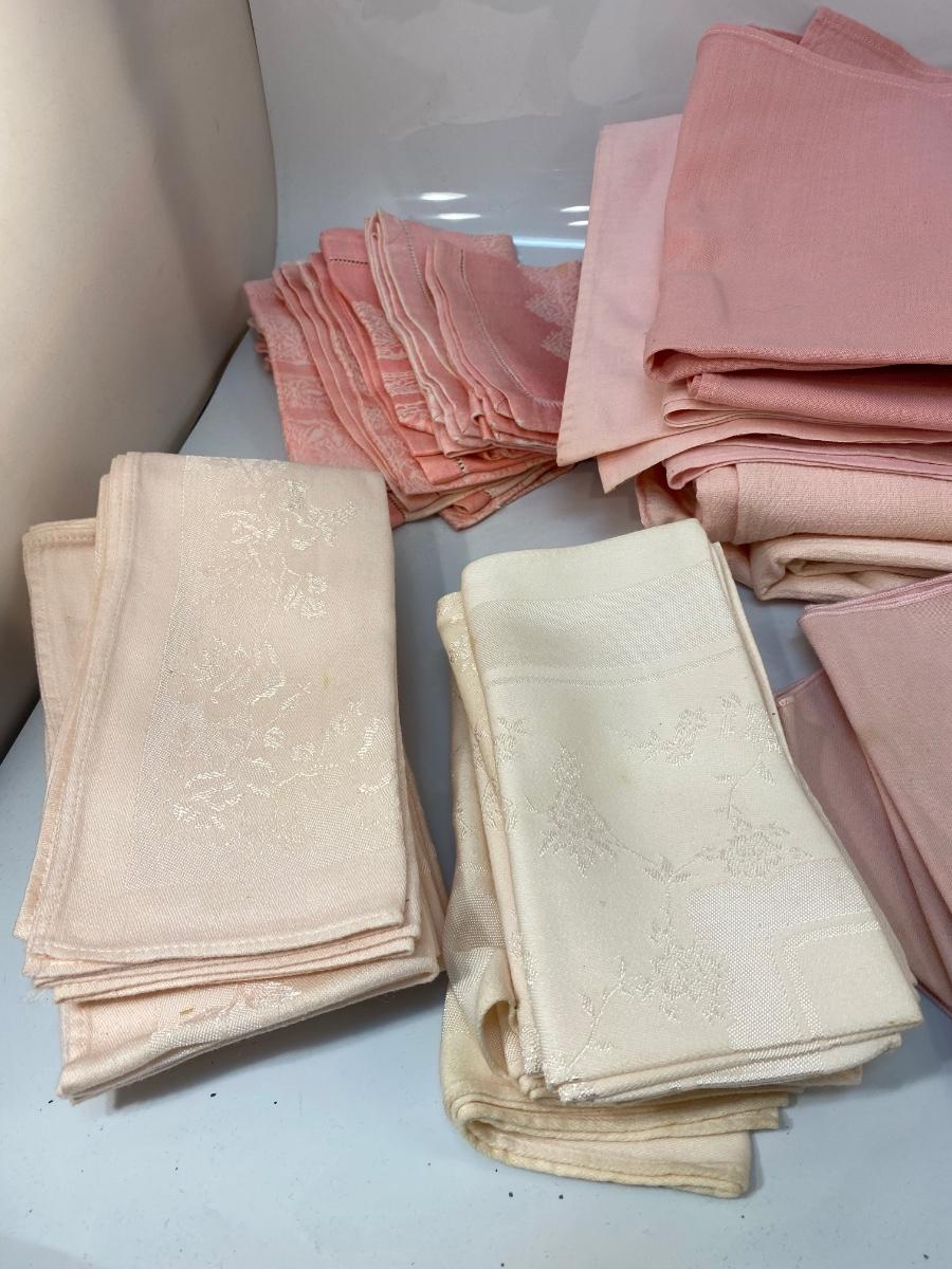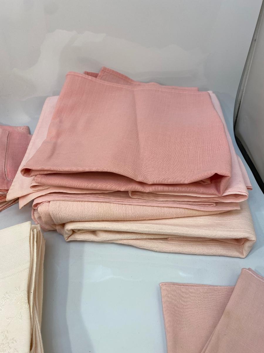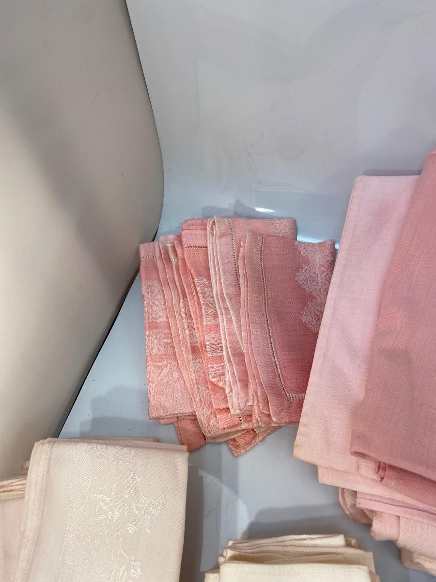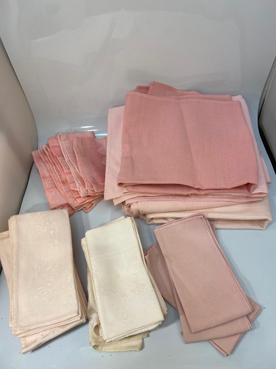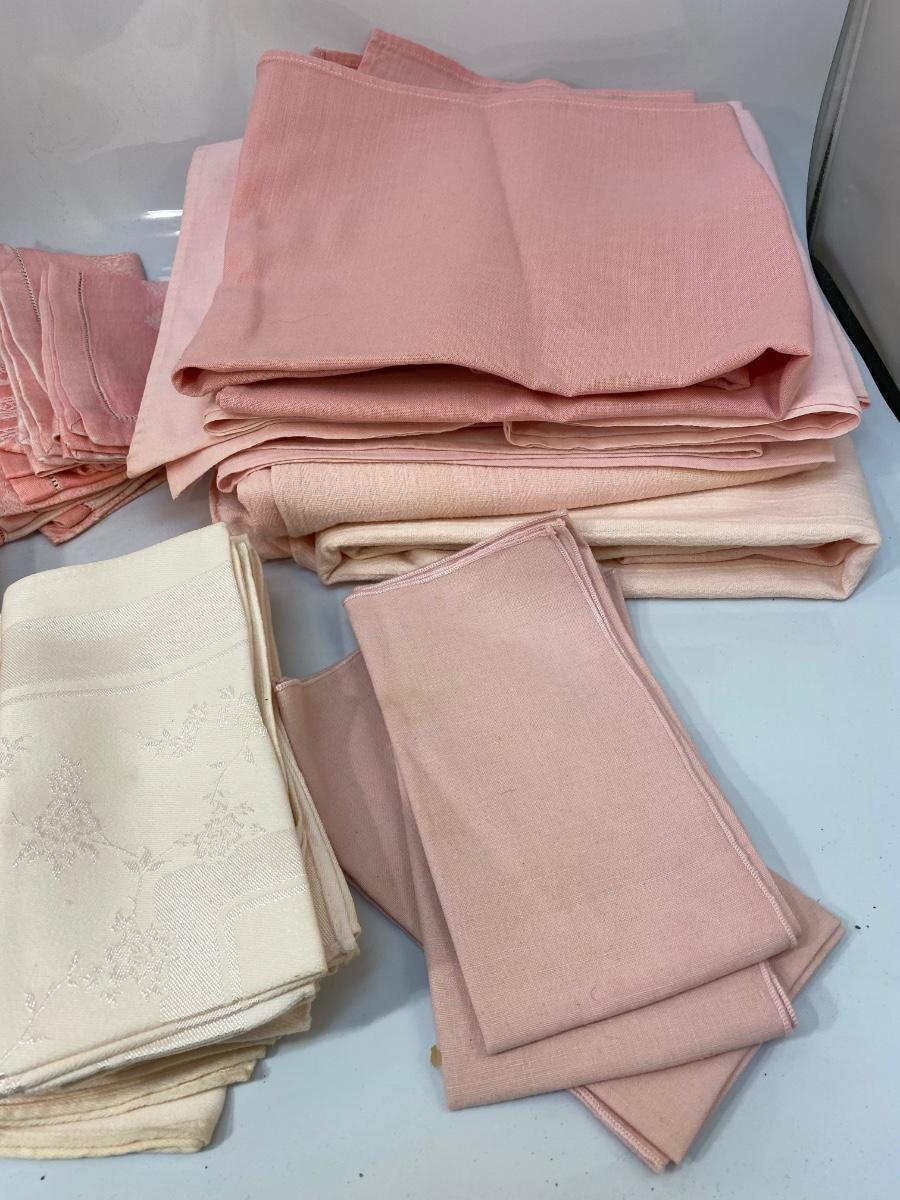 Mixed Lot of Pink Table Linens Cloths Napkins Various Shades. May have spots or stains. Large lot of mixed variety.