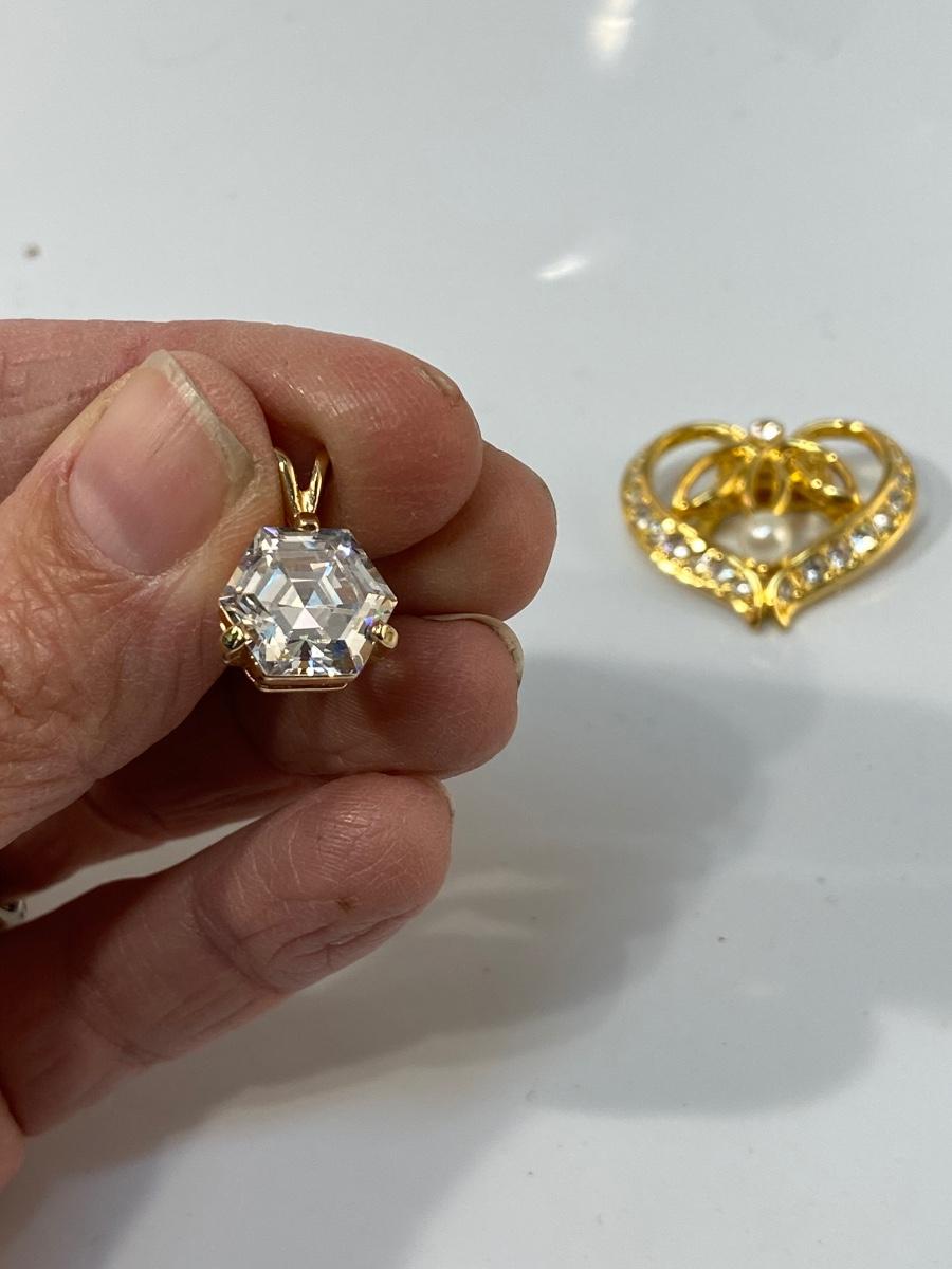Gold Tone Fashion Jewelry Lot Pins Pendant Locket. Two gold tone pins, one with an opening locket. Pendant is a large CZ rhinestone solitaire. All gold tone pieces, unmarked, no gold marks found.