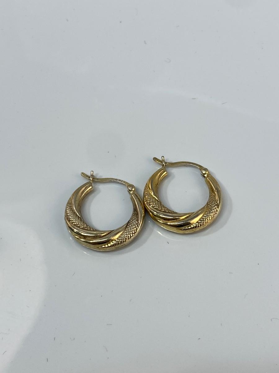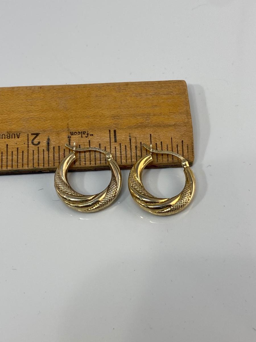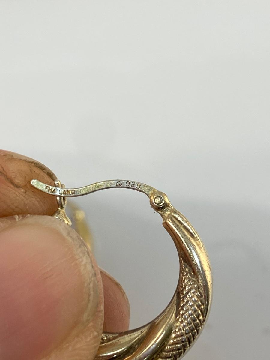 Pair of Lightweight Gold Tone Sterling Silver Stamped Design Hoop Earrings. In good condition. Small, lightweight hoops marked 925 on post.
