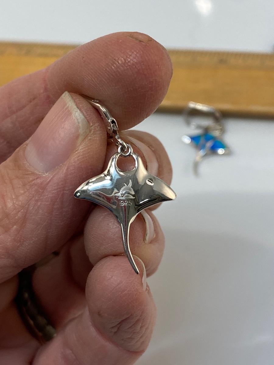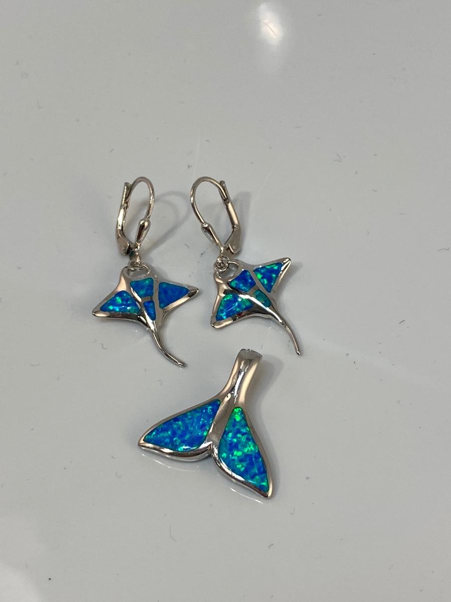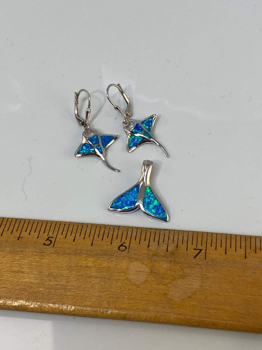 Sterling Silver & Opalescent Stone Manta Ray Earrings & Whale Tail Pendant