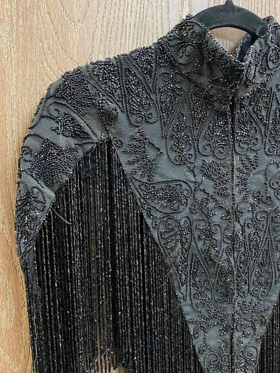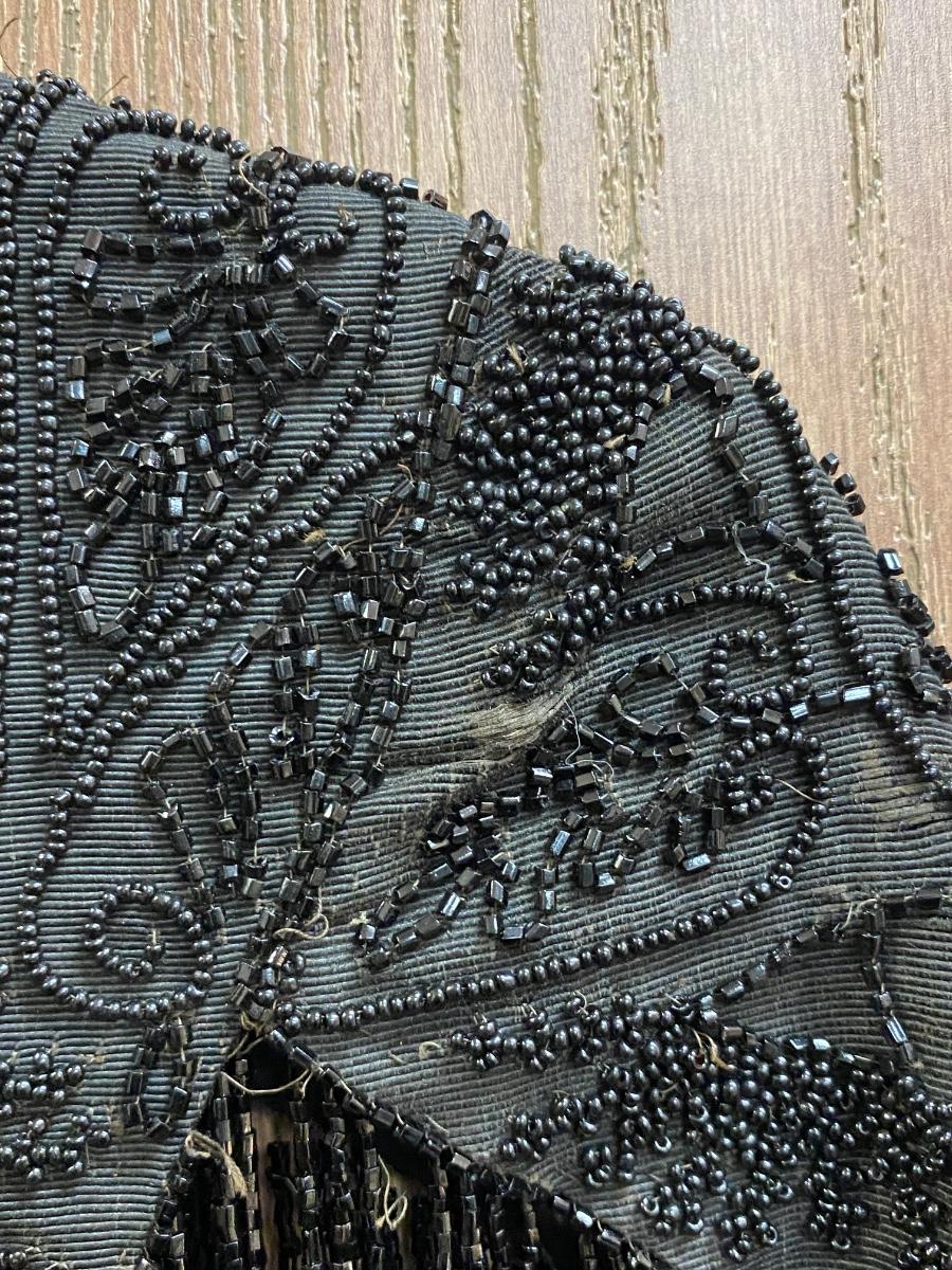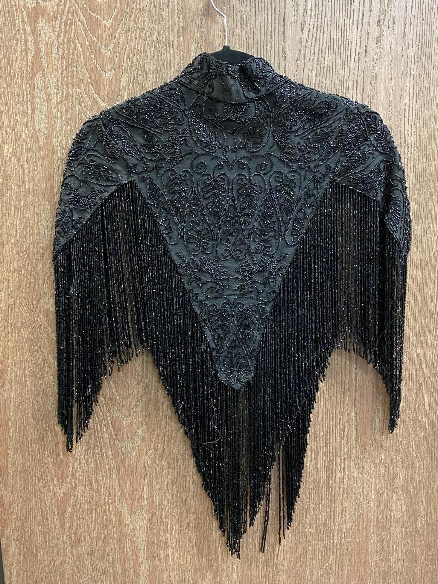 Vintage Antique Victorian Art Deco Black Beaded Fringed Cape Shoulder Wrap. In good antique condition. There are a few spots where the bead work has come out and missing fringe but not noticeable unless looked at up closely. Hook and eye closure needs a couple replaced. A few thin spots in material but nothing bad. This item is more than likely wearable if handled with care. Snug on hanger, size medium or smaller.