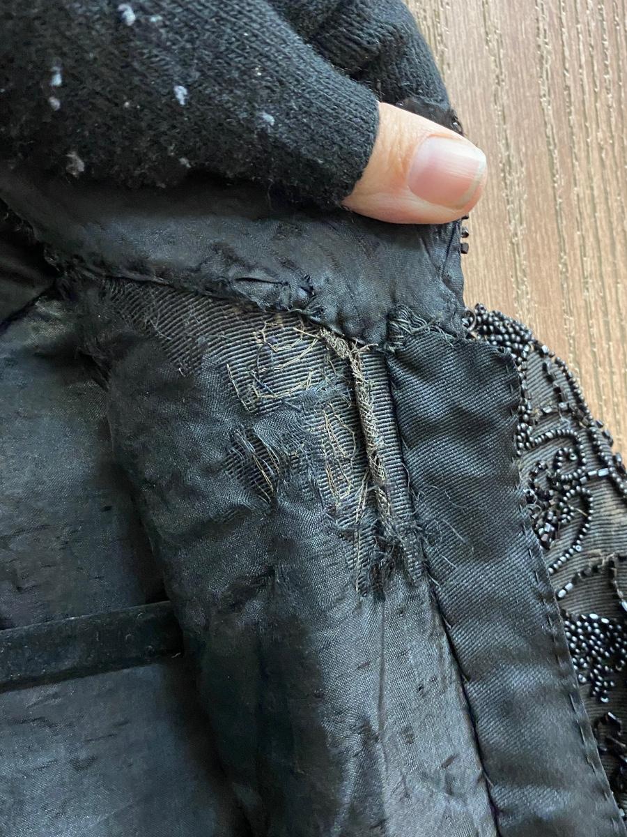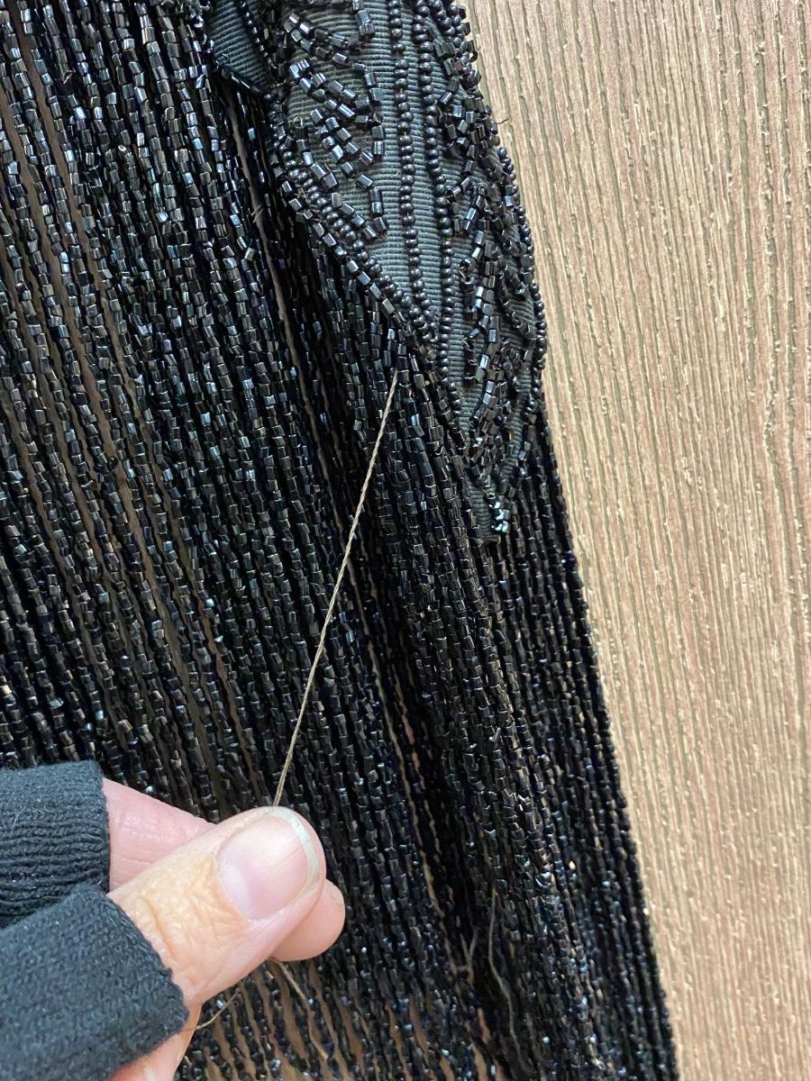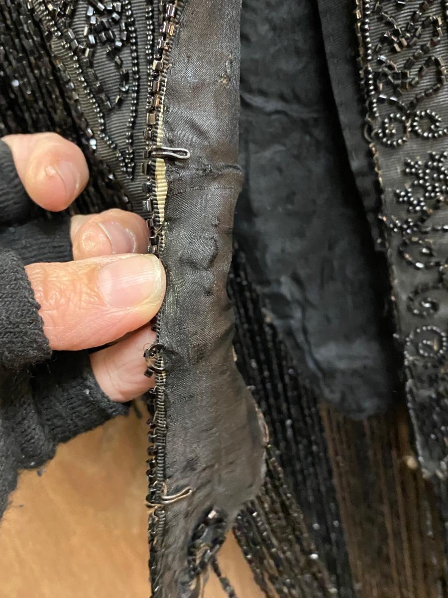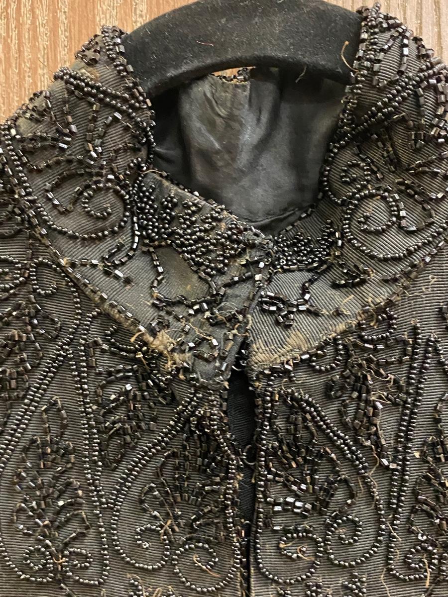 Vintage Antique Victorian Art Deco Black Beaded Fringed Cape Shoulder Wrap. In good antique condition. There are a few spots where the bead work has come out and missing fringe but not noticeable unless looked at up closely. Hook and eye closure needs a couple replaced. A few thin spots in material but nothing bad. This item is more than likely wearable if handled with care. Snug on hanger, size medium or smaller.