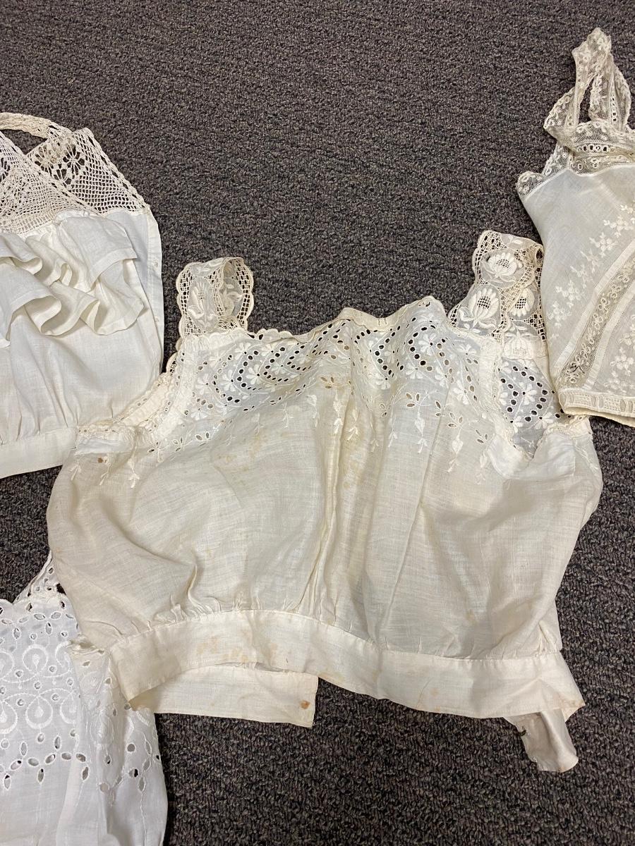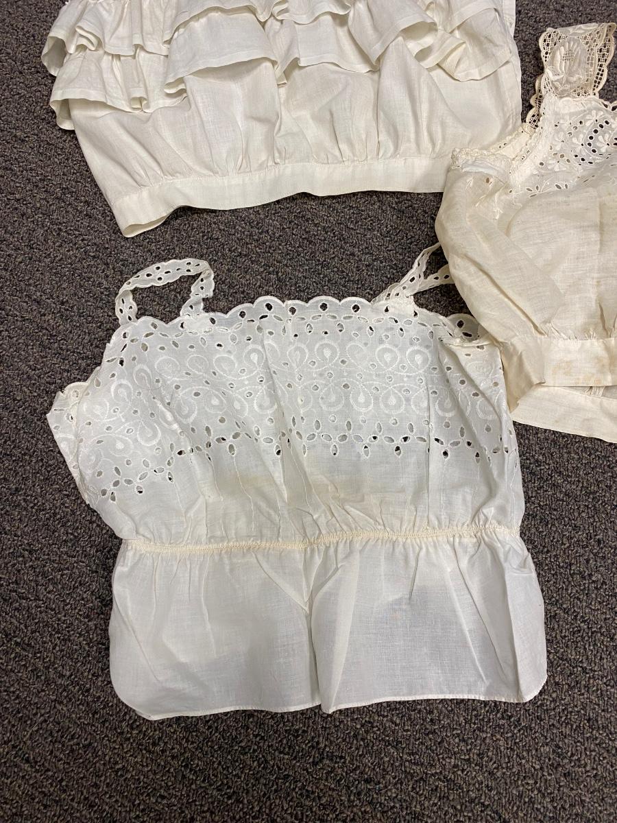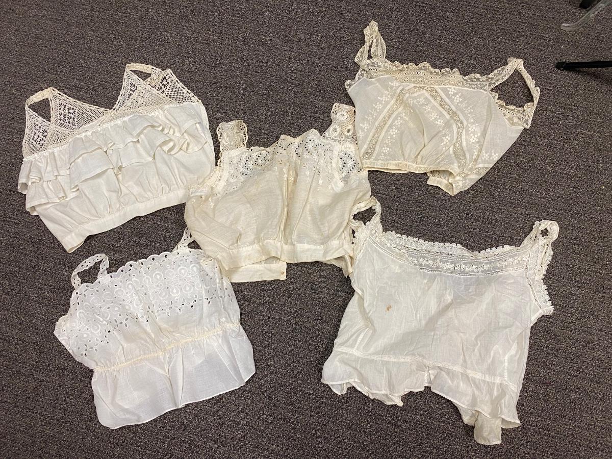 Lot of 5 Vintage Victorian White Cotton Lace Sleeveless Tank Gibson Girl Undergarment Top. Various styles, each one different. There is discolor and maybe a light spot or two but no major damage or holes. A couple of the tops need sometime of closure added.