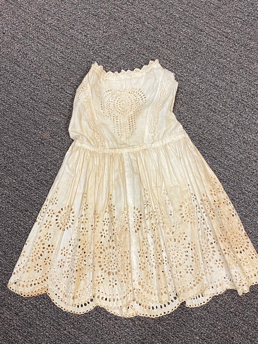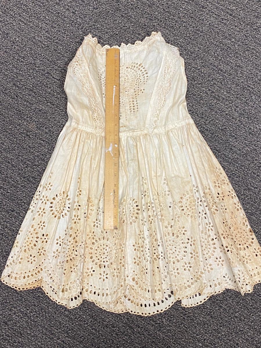 Vintage Victorian White Eyelet Cotton Small Child's Dress with Cape. Adorable sleeveless cotton dress with cape. There is discolor from age but no holes.