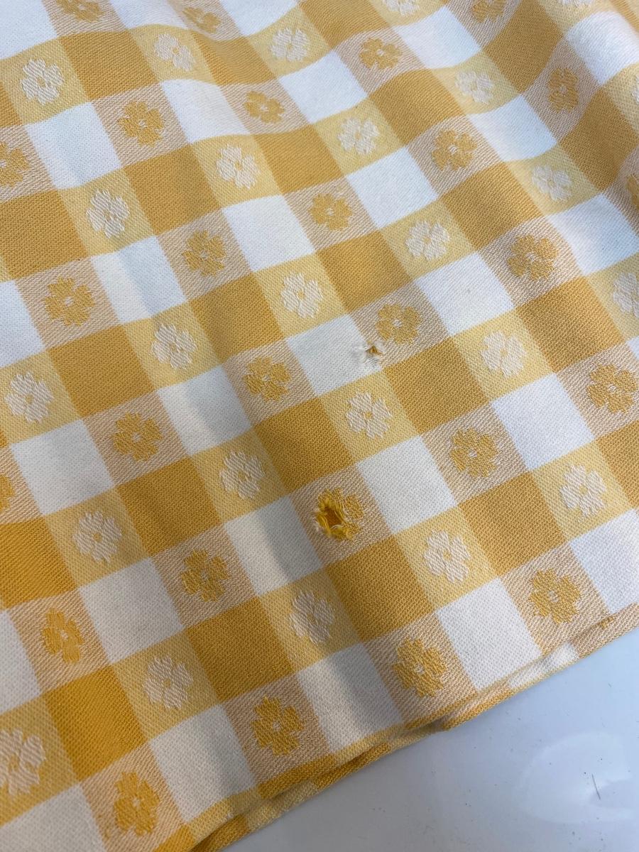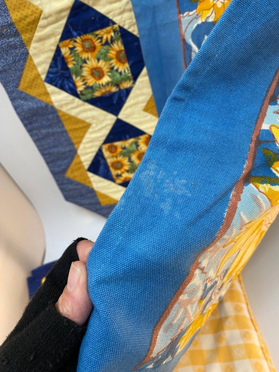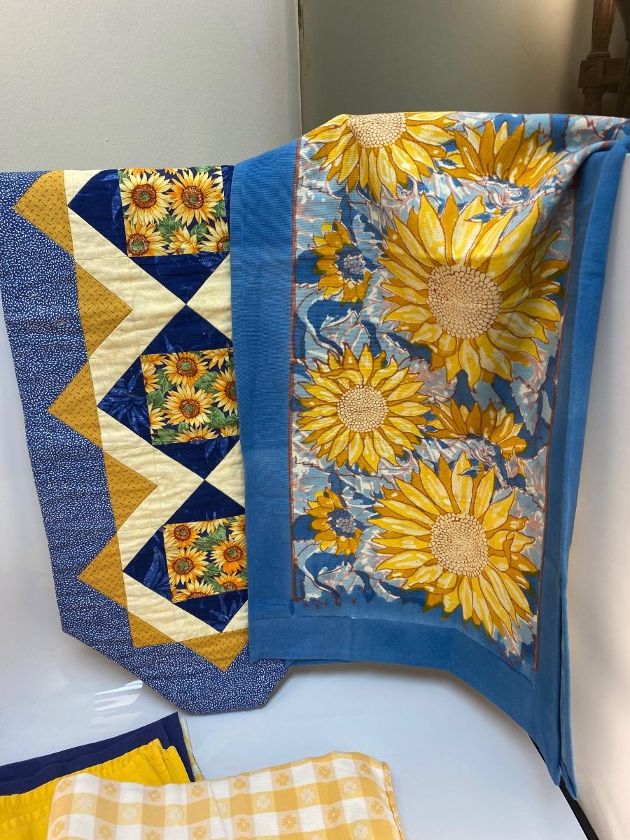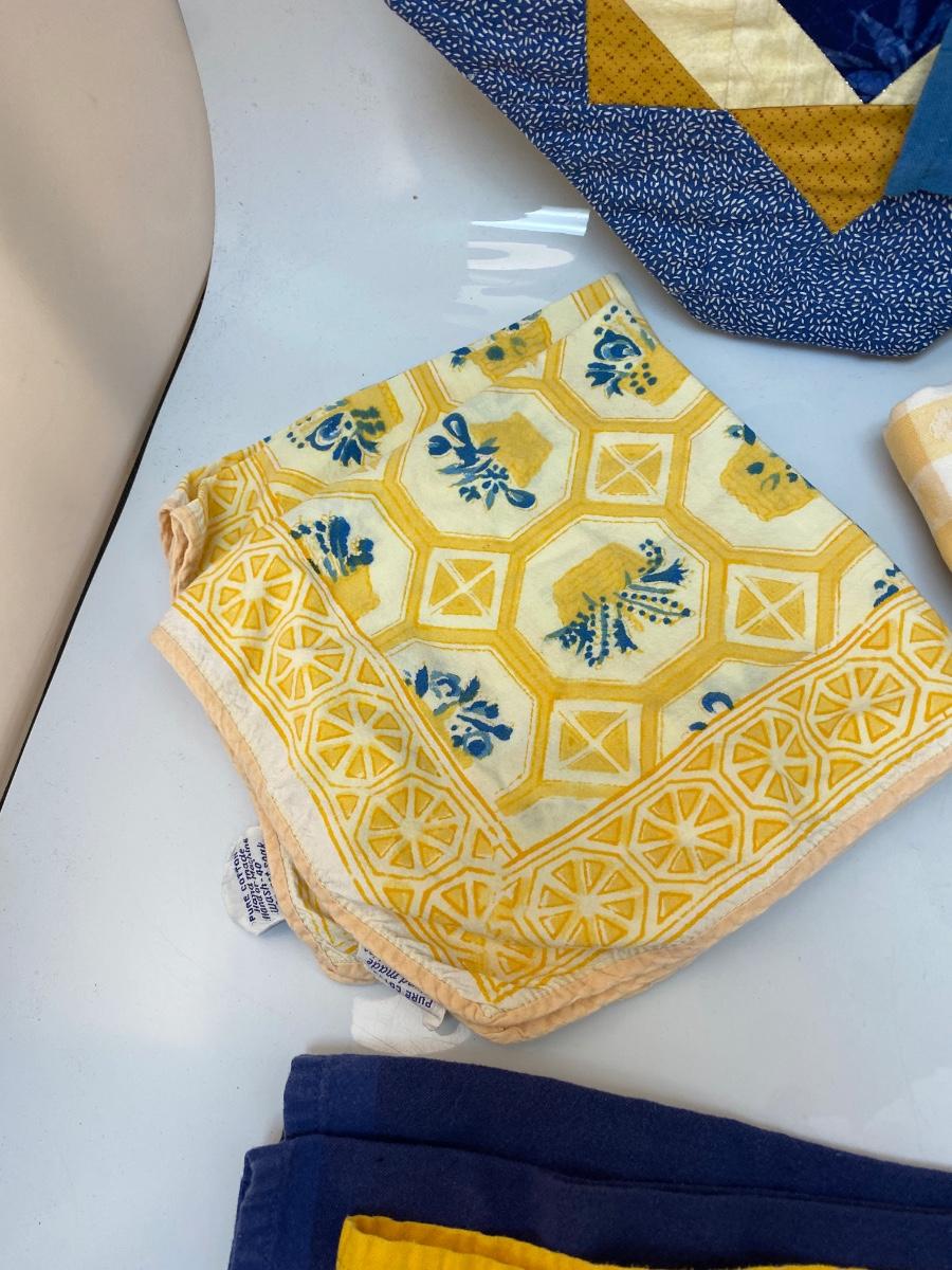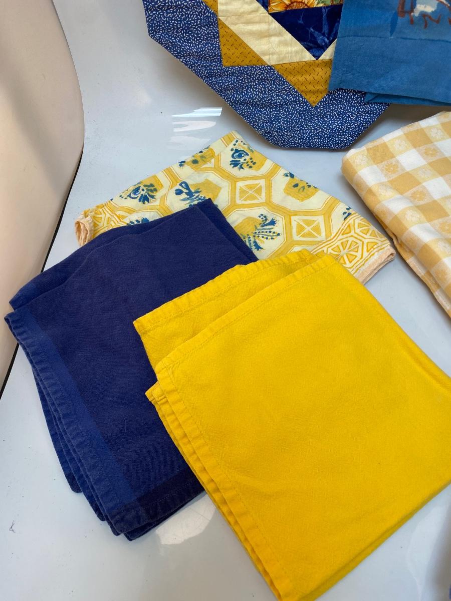 Yellow & Blue Country Sunflower Decor Table Linens. Dinner napkins, two tablecloths and two table runners. Noticed a few spots here and there and a small hole in yellow tablecloth.