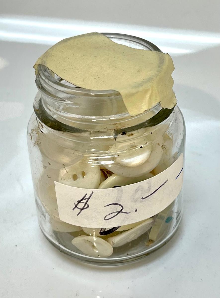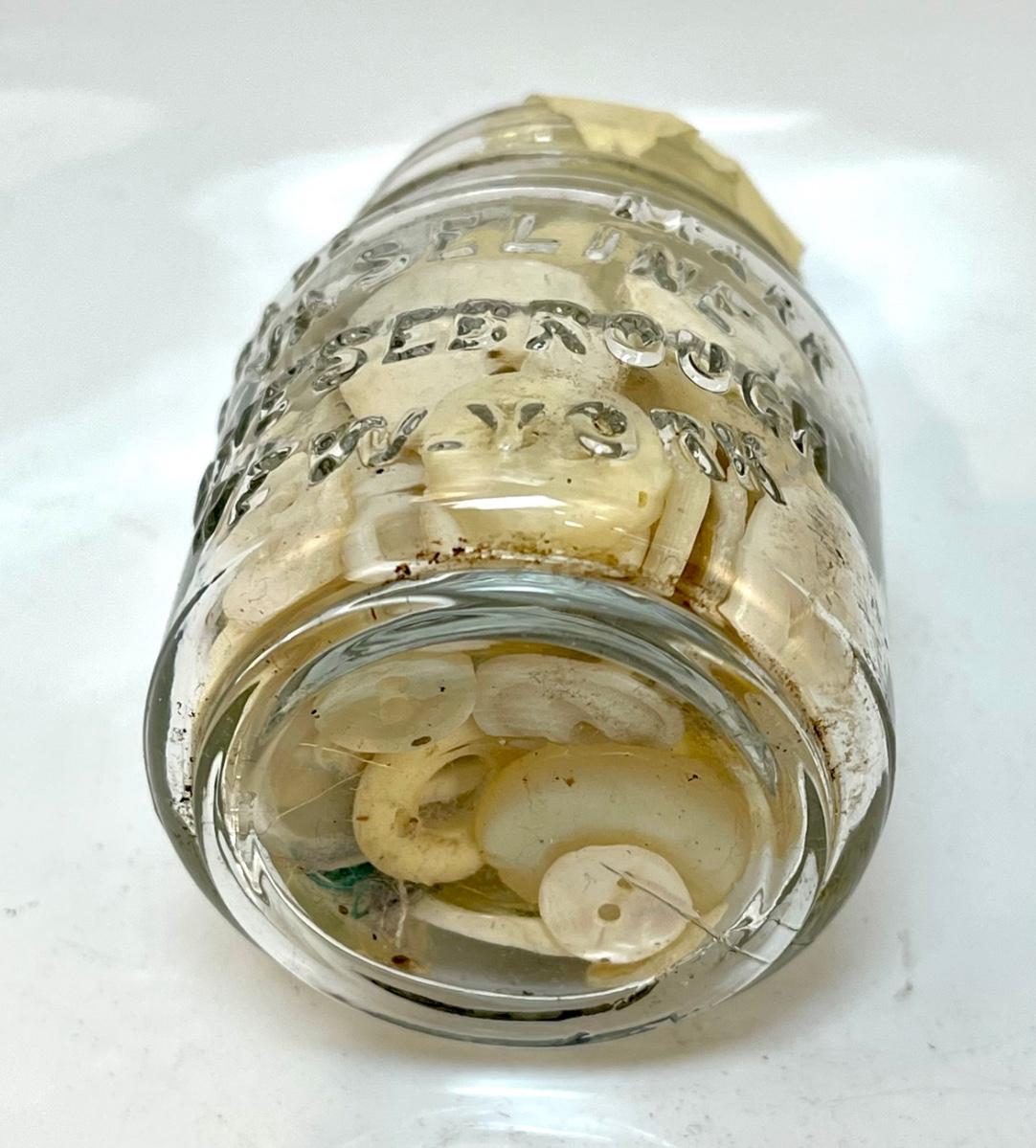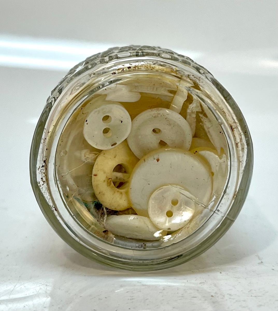 Small Vintage Glass Ink Baby Food Jar with Random Buttons