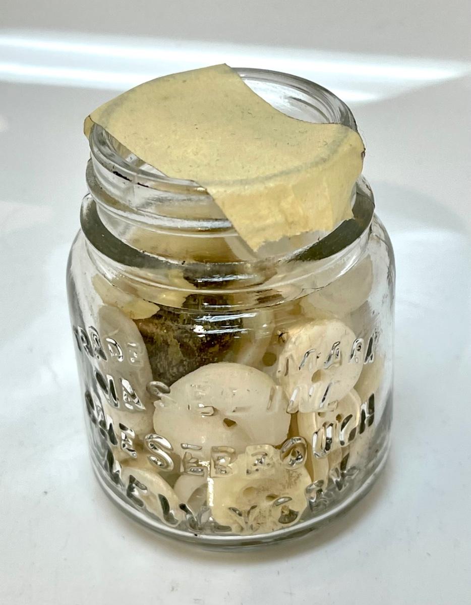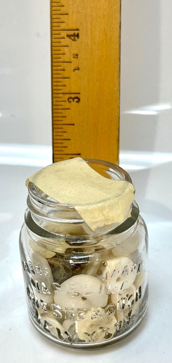 Small Vintage Glass Ink Baby Food Jar with Random Buttons. Very small mini jar.