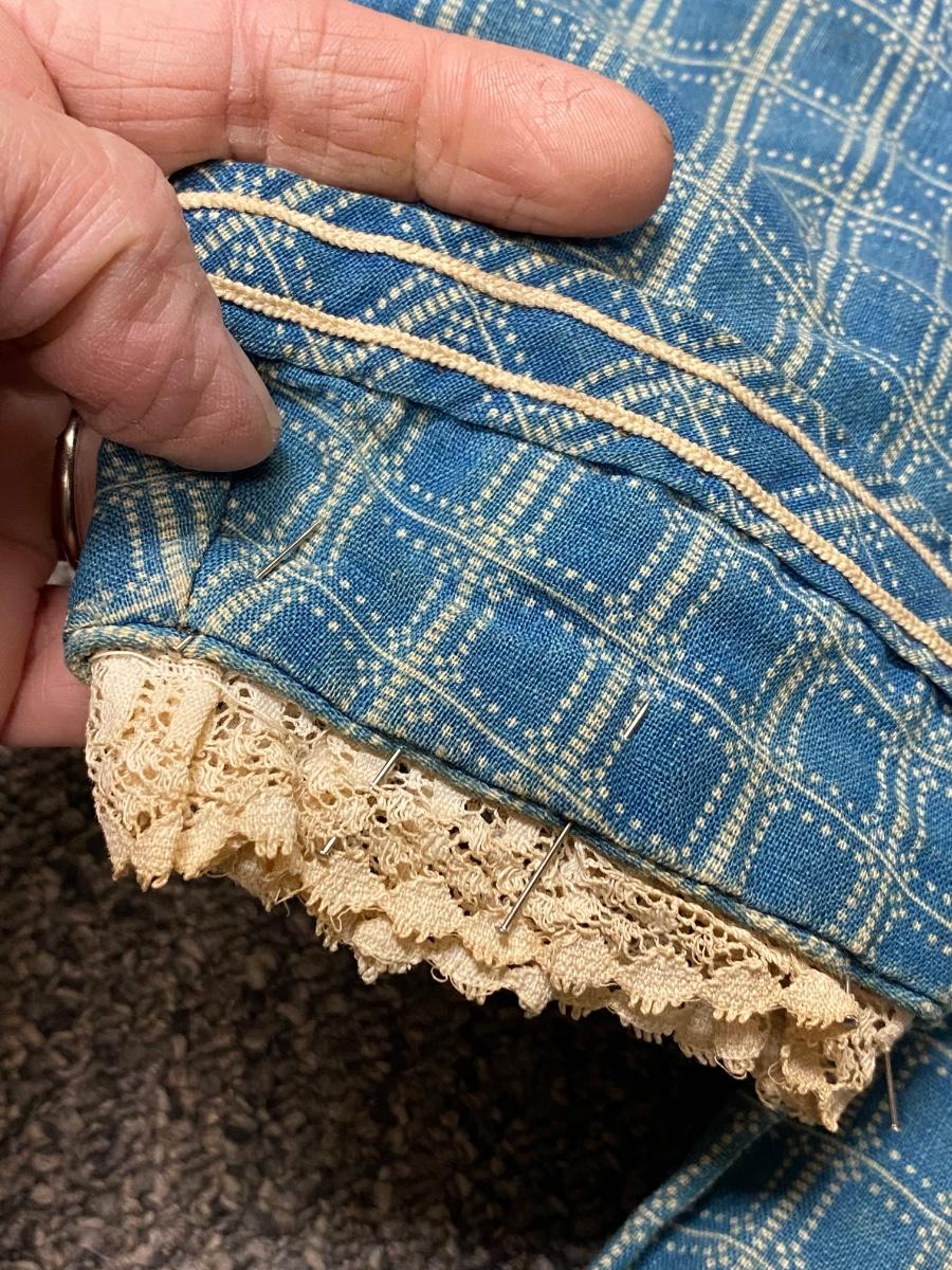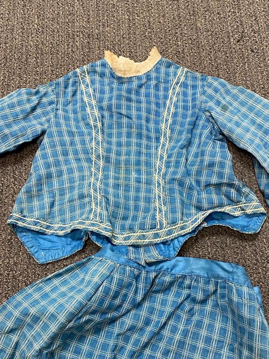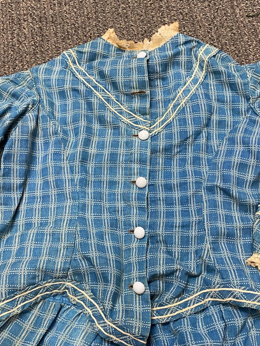 Vintage Antique Small Girls Childs Two Piece Blue Plaid Prairie Dress Skirt Top. There is discoloration but no holes. The lace at the right wrist is pinned and needs to be restitched. Needs some closures attached at back of skirt.