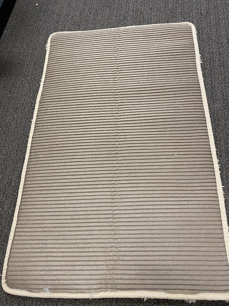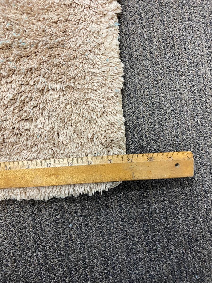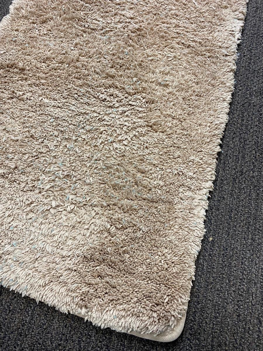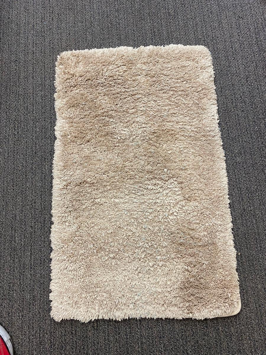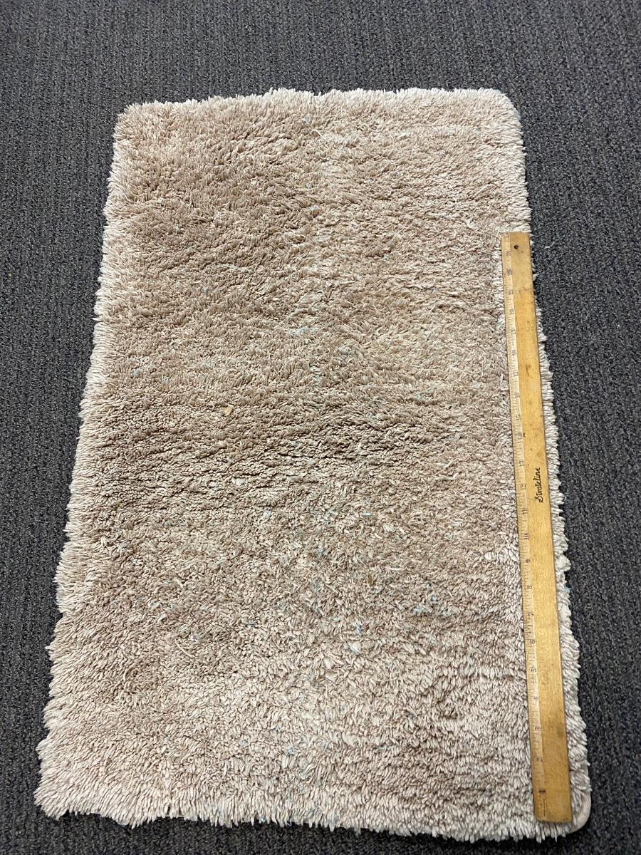 Plush Light Beige Tan Bathmat Doormat Rug. In good condition. Has some pale green flecks in it, hard to see in photos, unsure if it is fuzz transfer or supposed to be that way, looks more like it was made that way. No stains.
