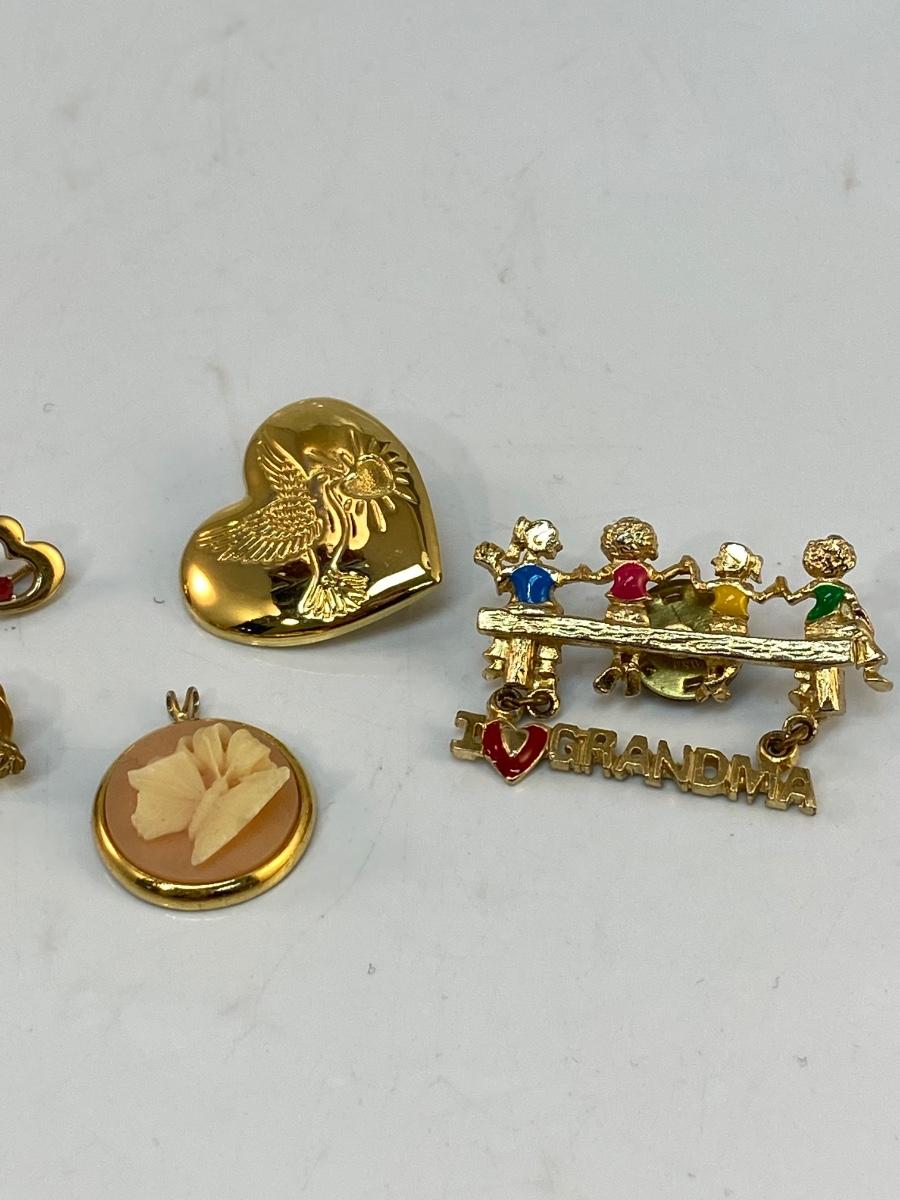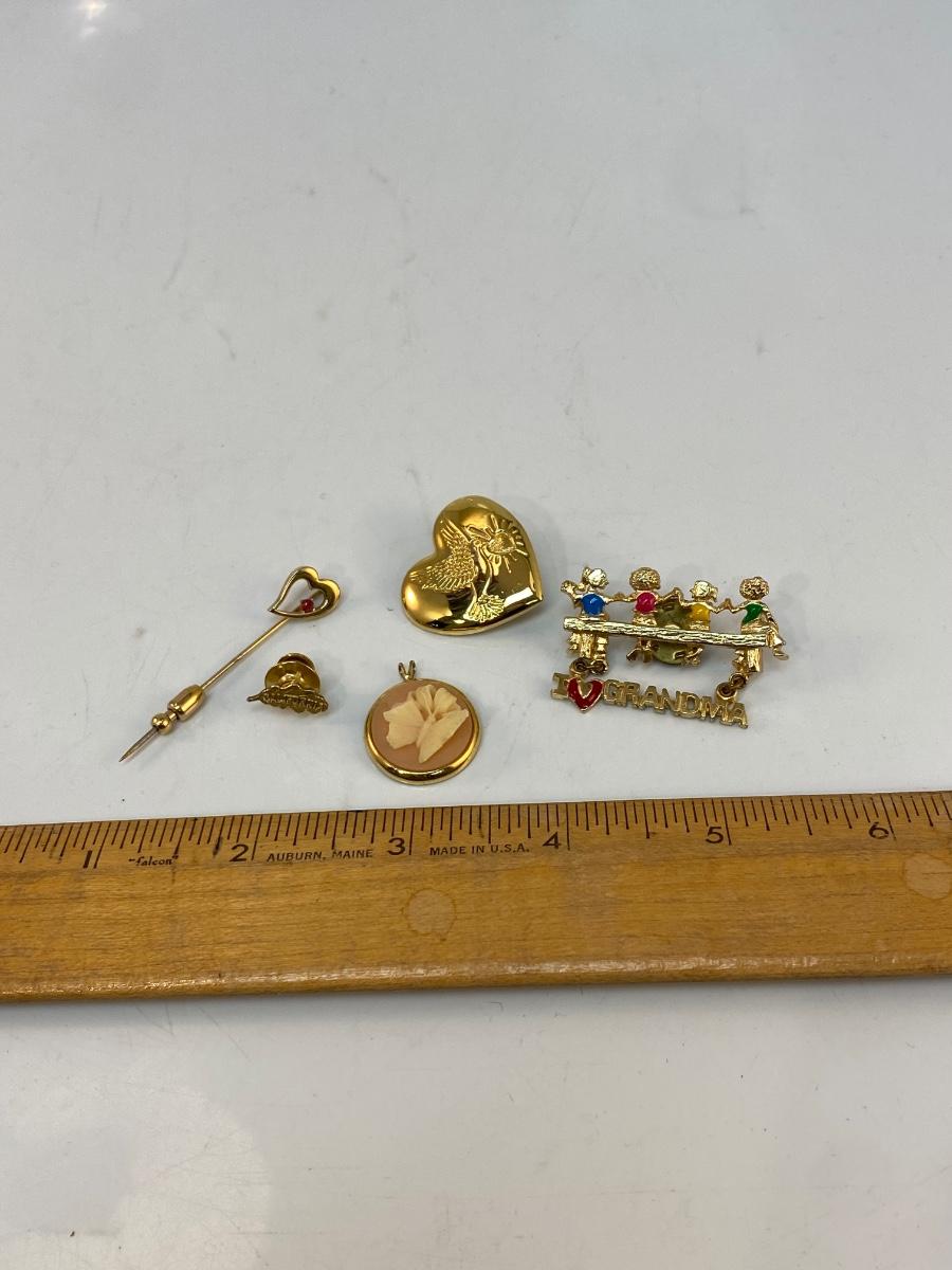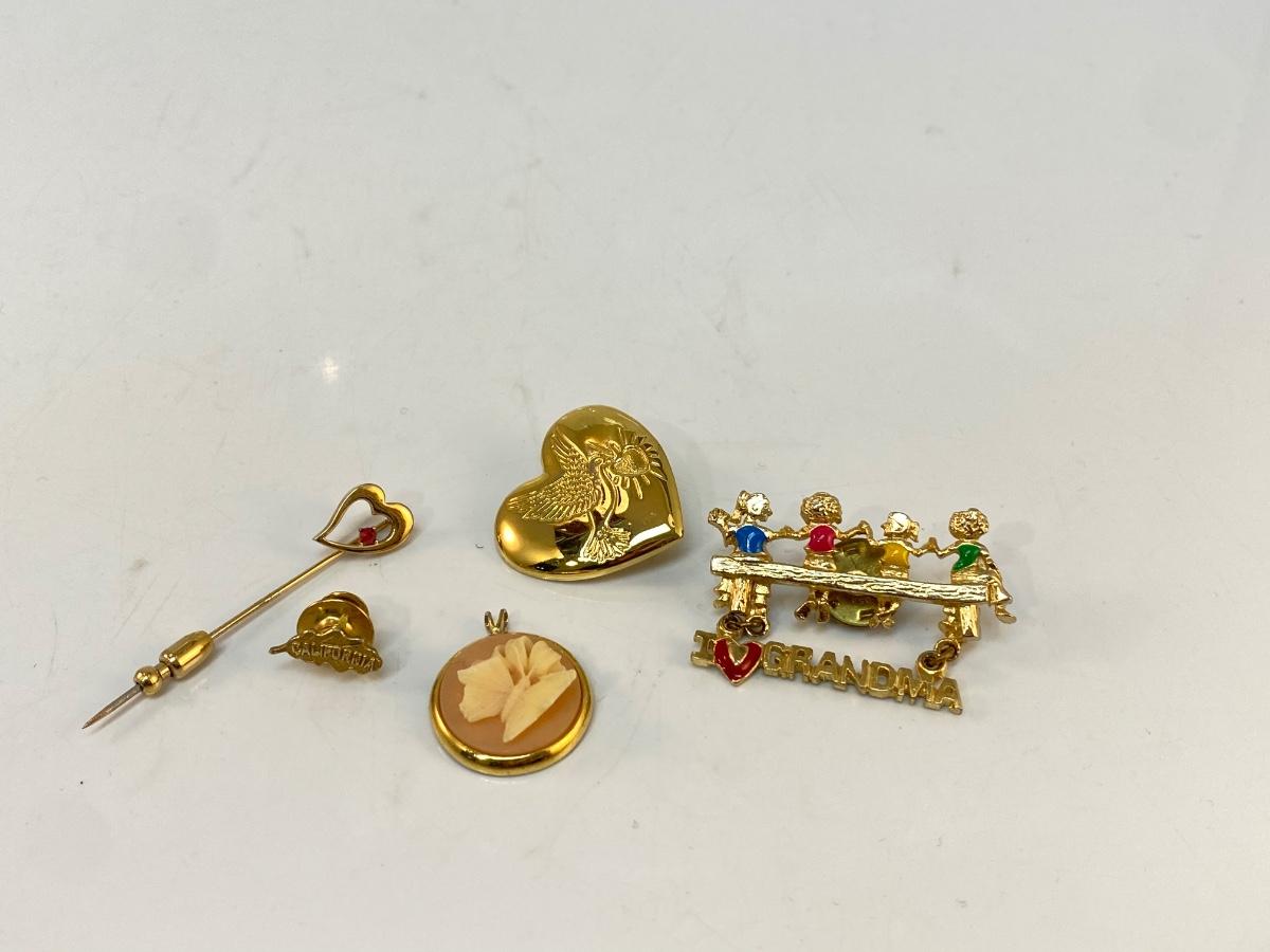 Mixed Lot of Pins & One Pendant Charm. Gold tone metals. Butterfly cameo does have a broken wing tip, not too noticeable at a glance.