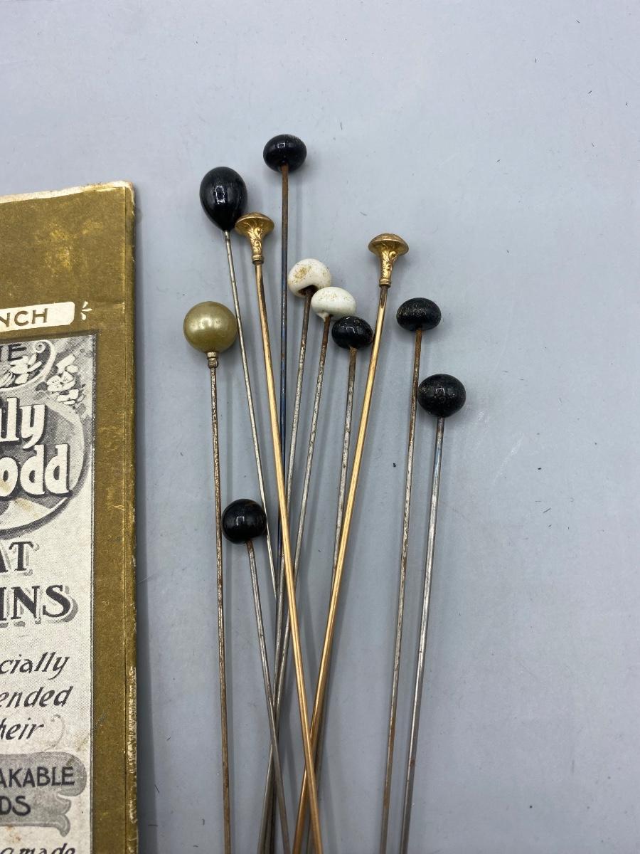 Lot of Vintage Antique 9" Emily Dodd Hat Pins. Includes the hat pin holder board. No gold marks on the two with gold-colored heads. In vintage conditions.