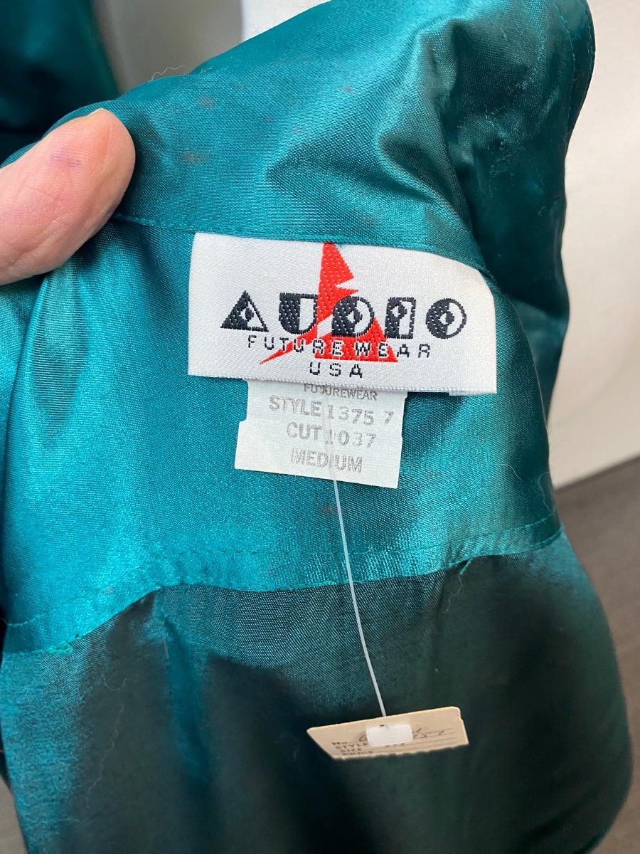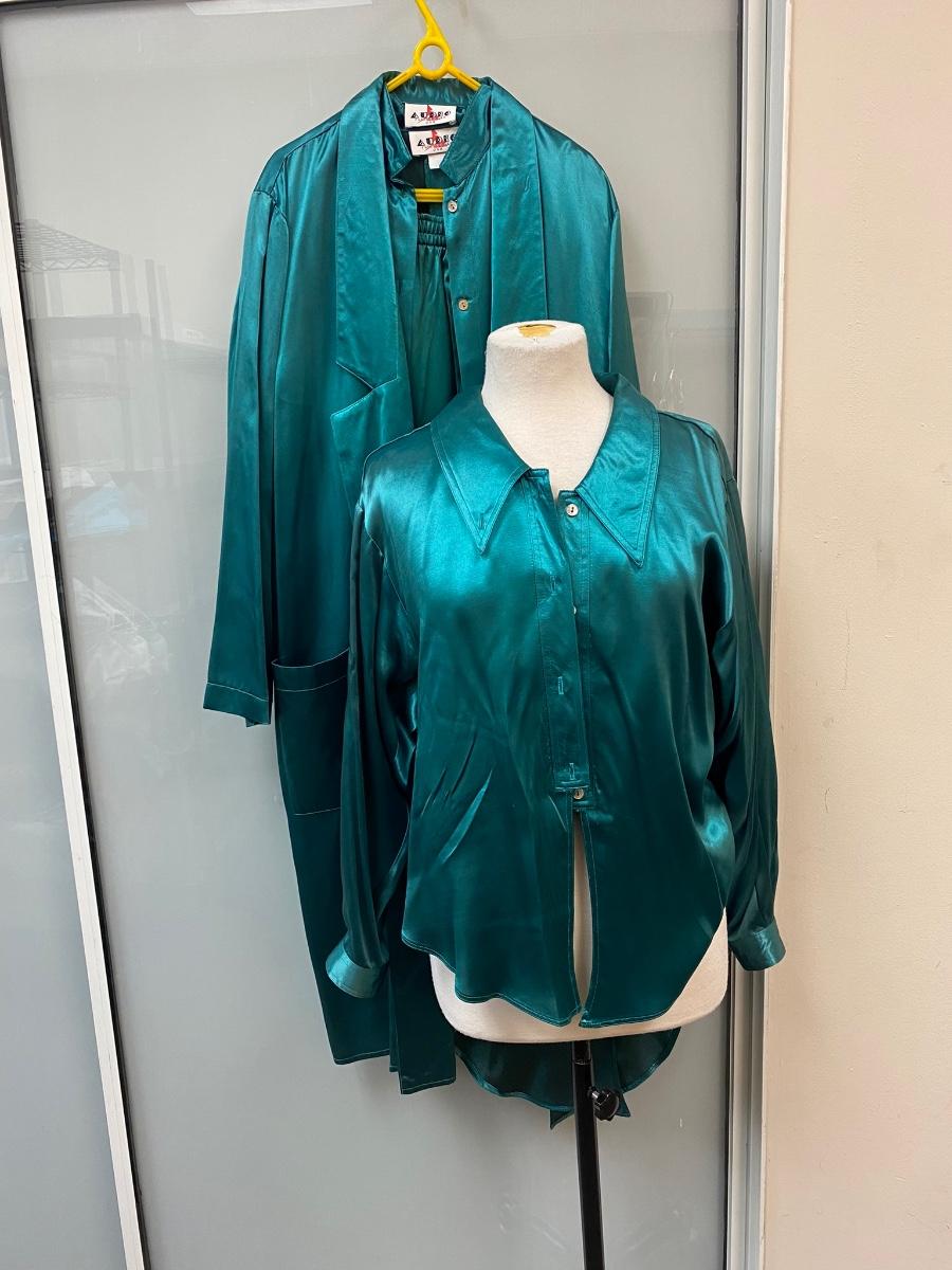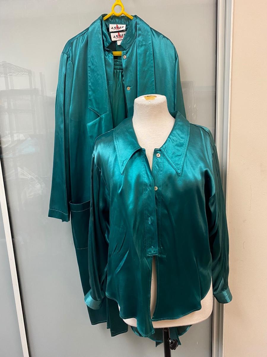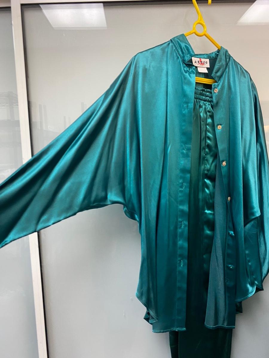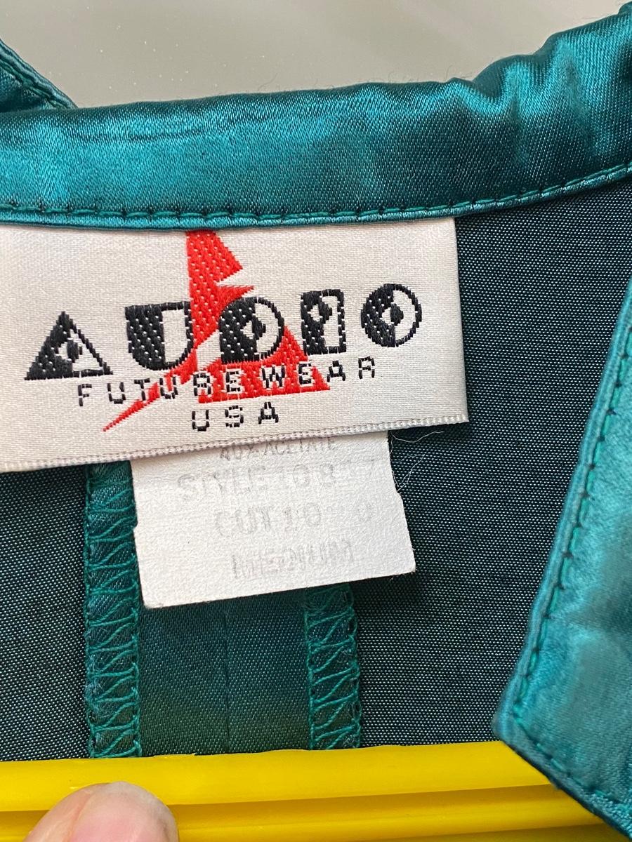 Vintage Retro 4 Piece Audio Future Wear USA Green Satin Rayon Outfit Pants Suit. Includes a pair of elastic waist pants, two different button front blouses, and a kimono jacket like blouse. Mix and match. All pieces are size medium except the kimono top is a small. See photos for blouse styles.