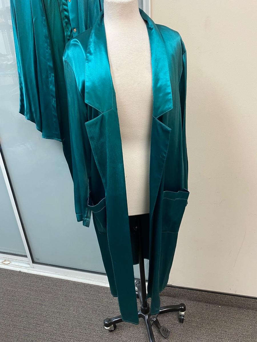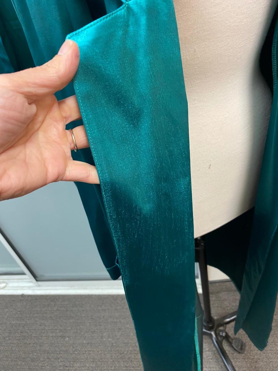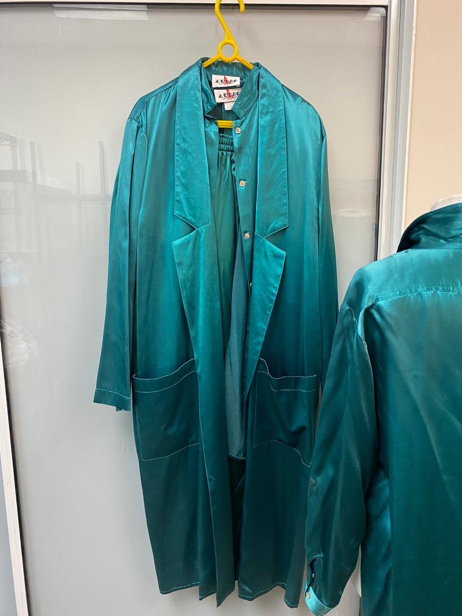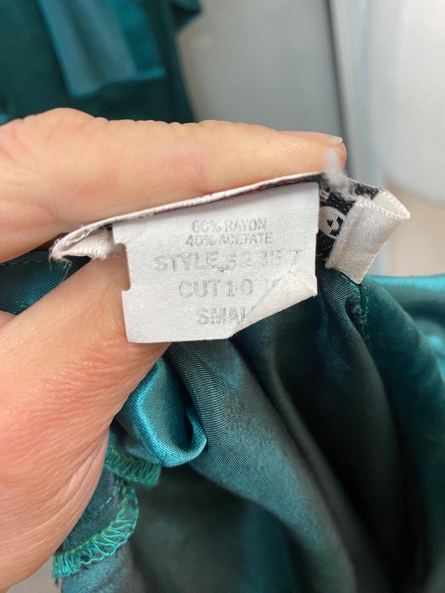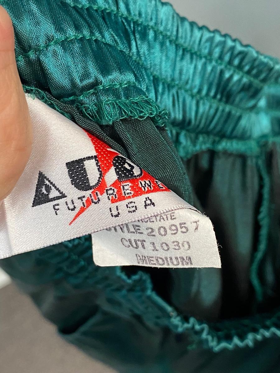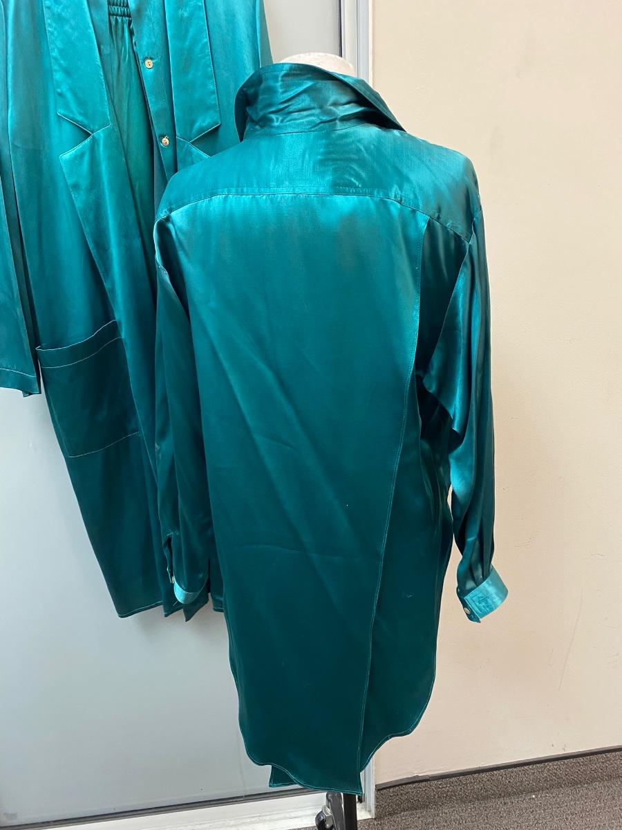 Vintage Retro 4 Piece Audio Future Wear USA Green Satin Rayon Outfit Pants Suit. Includes a pair of elastic waist pants, two different button front blouses, and a kimono jacket like blouse. Mix and match. All pieces are size medium except the kimono top is a small. See photos for blouse styles.
