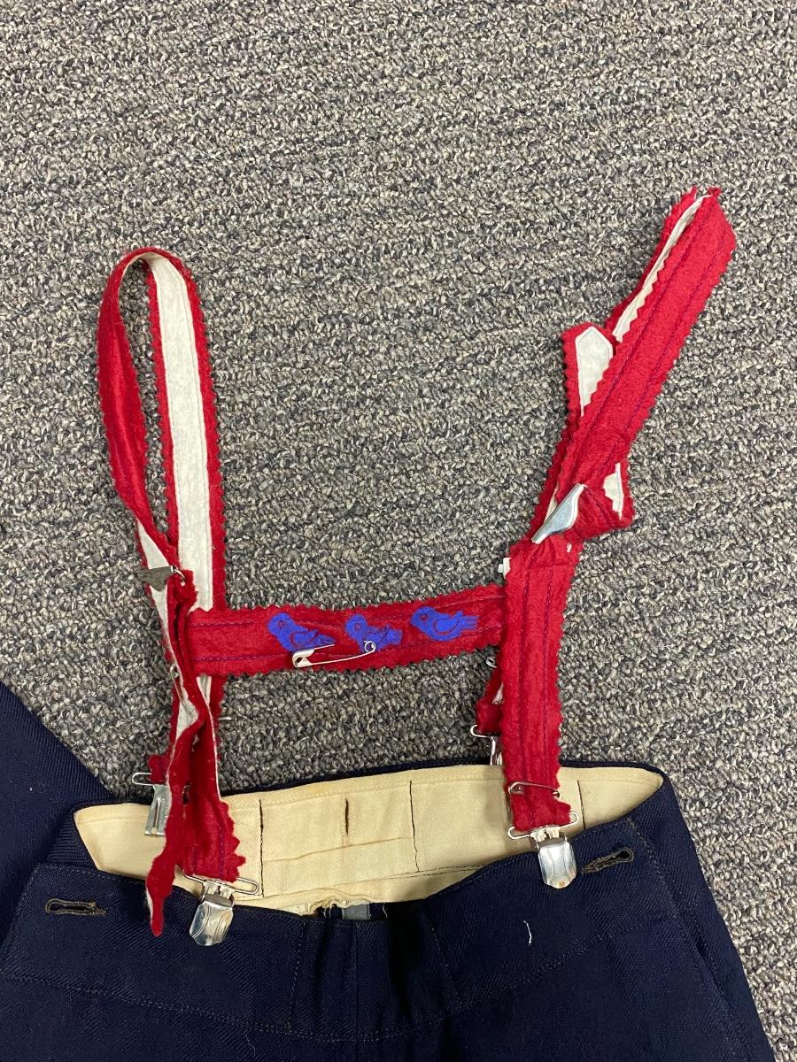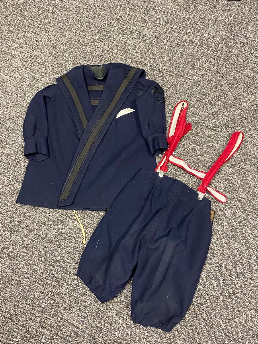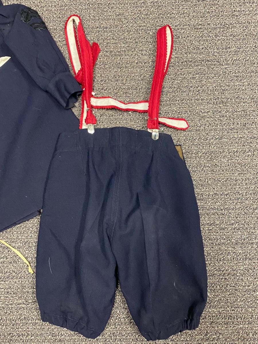 Vintage Antique Little Boys Two Piece Navy Blue Sailor Suit with Red Suspenders. In vintage condition. No stains but light discoloration and moth holes. Great for life size dolls, costume, or pattern.
