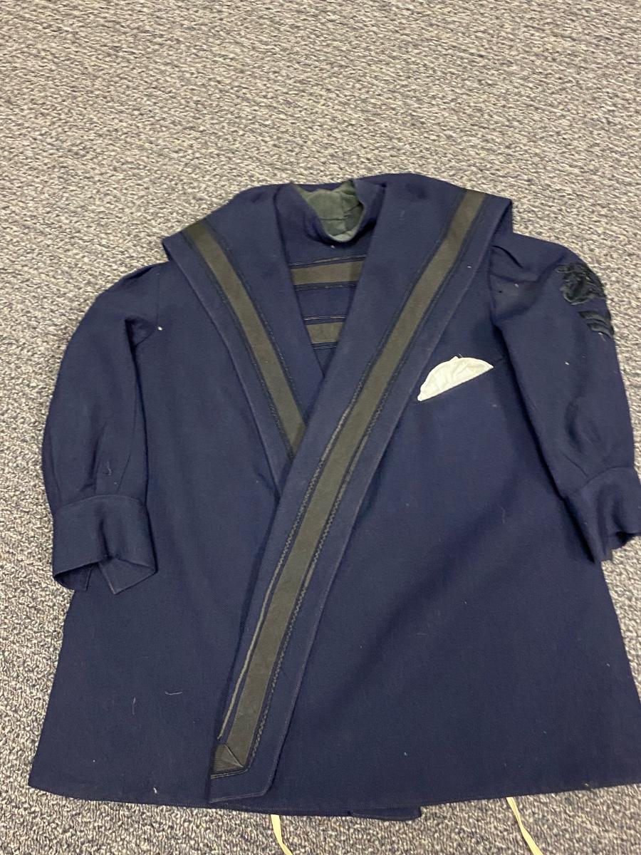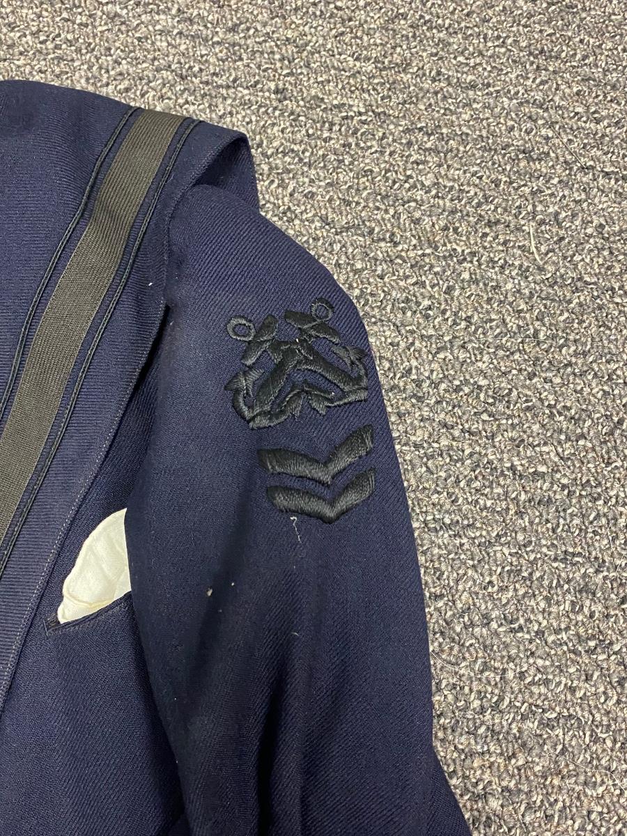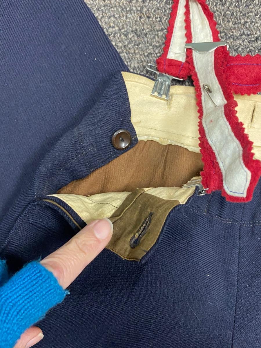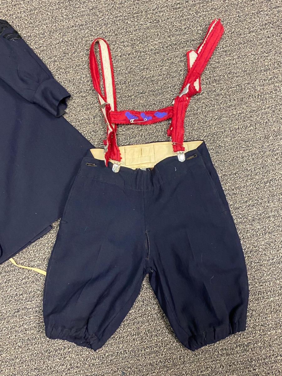 Vintage Antique Little Boys Two Piece Navy Blue Sailor Suit with Red Suspenders. In vintage condition. No stains but light discoloration and moth holes. Great for life size dolls, costume, or pattern.