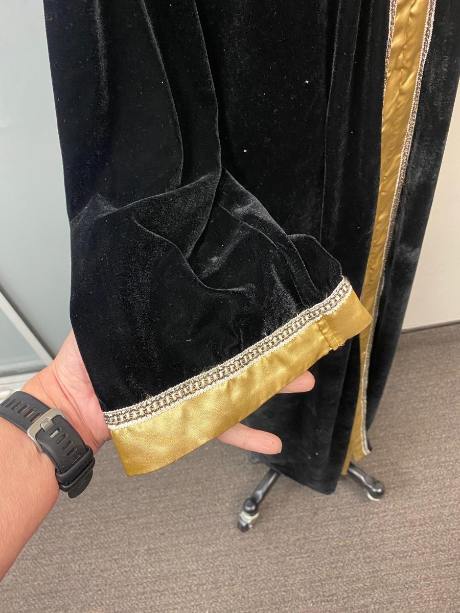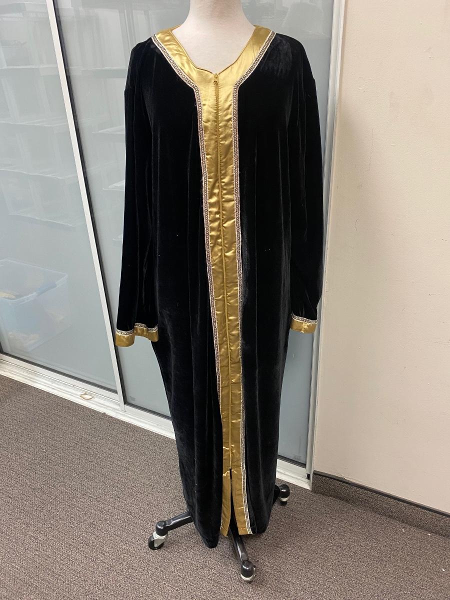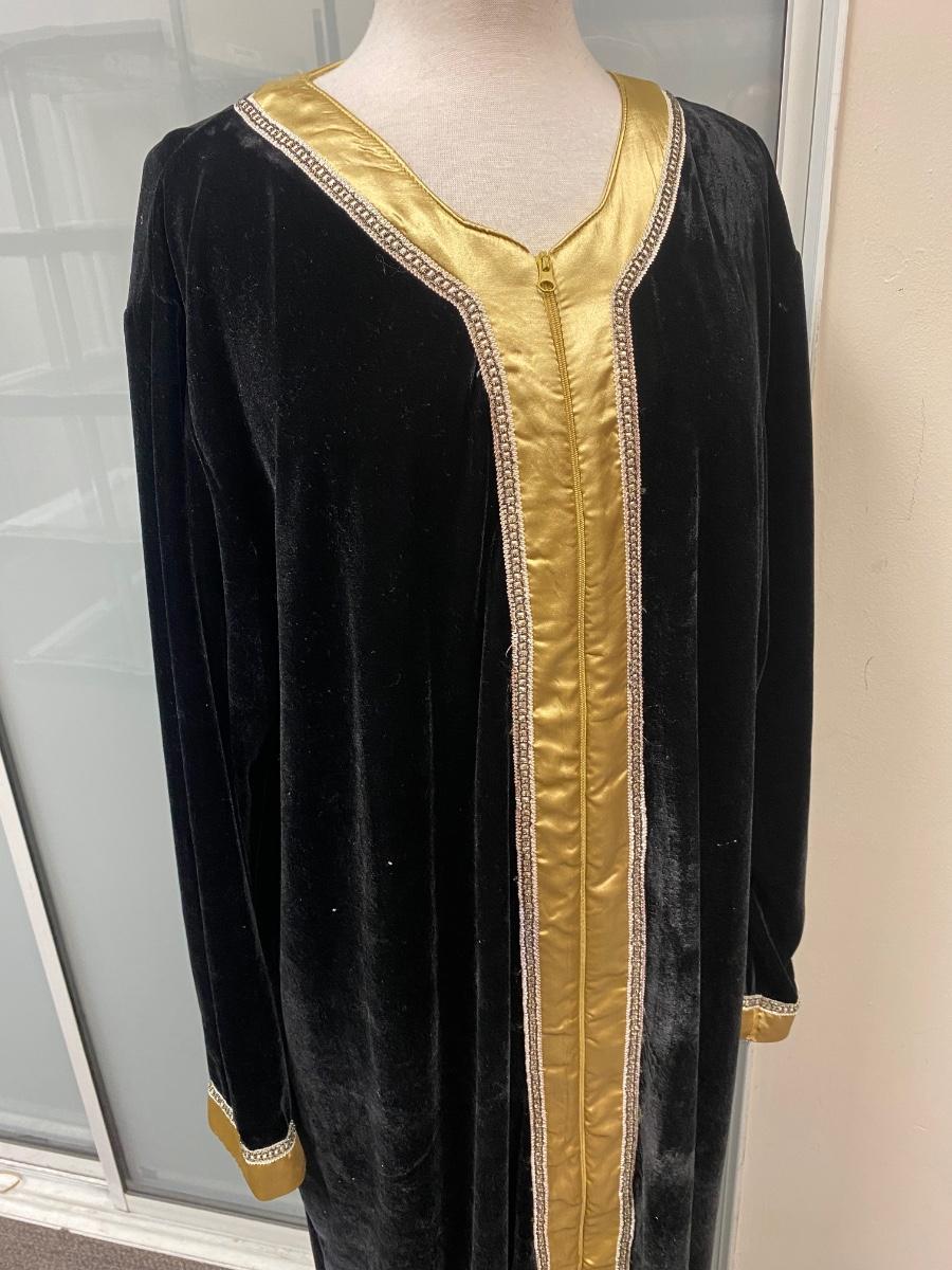 Retro Vintage Black Velvet Velour with Gold Trim Kaftan Loungewear Zip Front Robe Dressing Gown