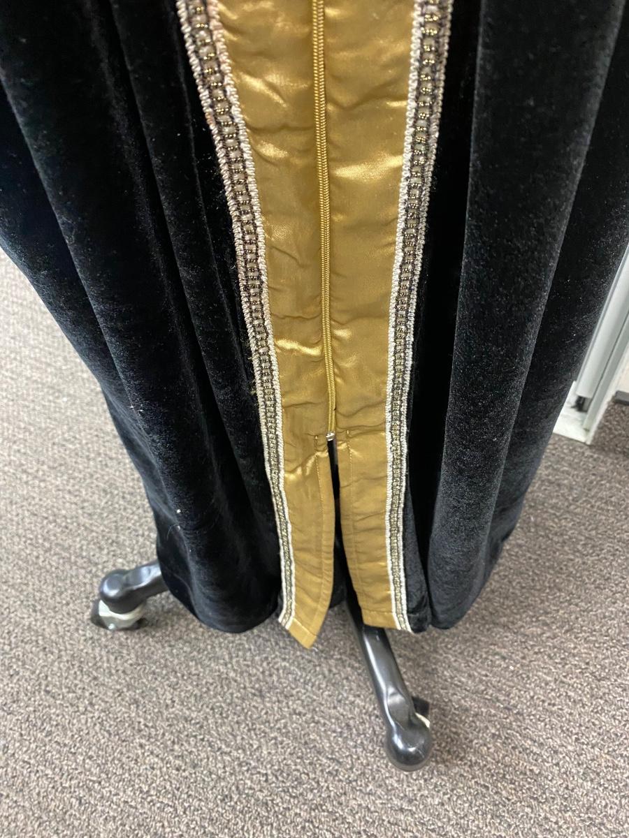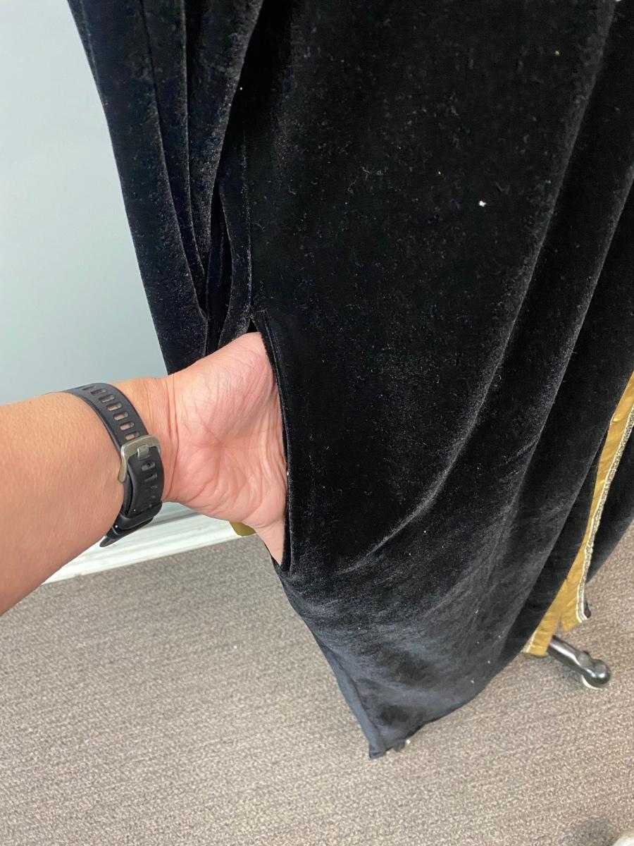 Retro Vintage Black Velvet Velour with Gold Trim Kaftan Loungewear Zip Front Robe Dressing Gown. In good condition. Zips all the way down., has side pockets. Made by Sante, size large.