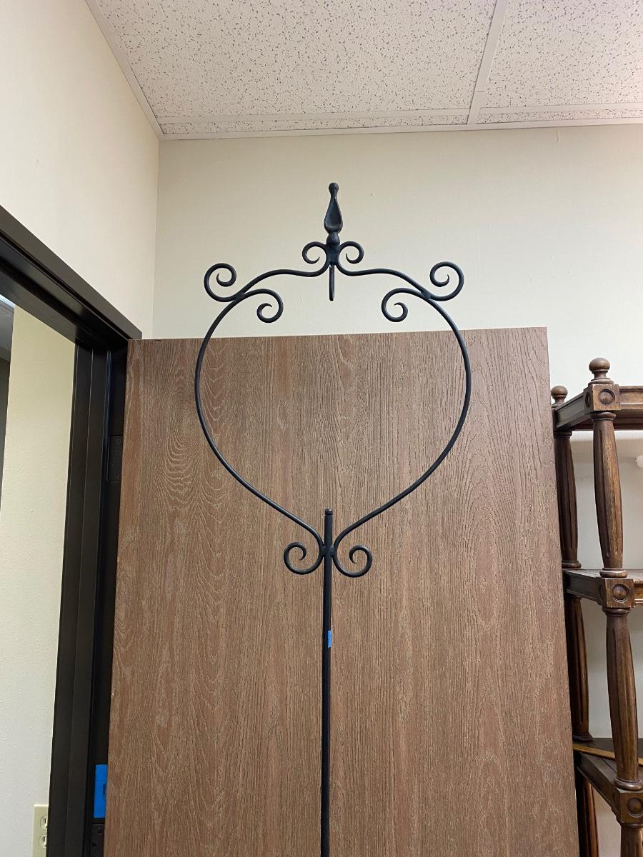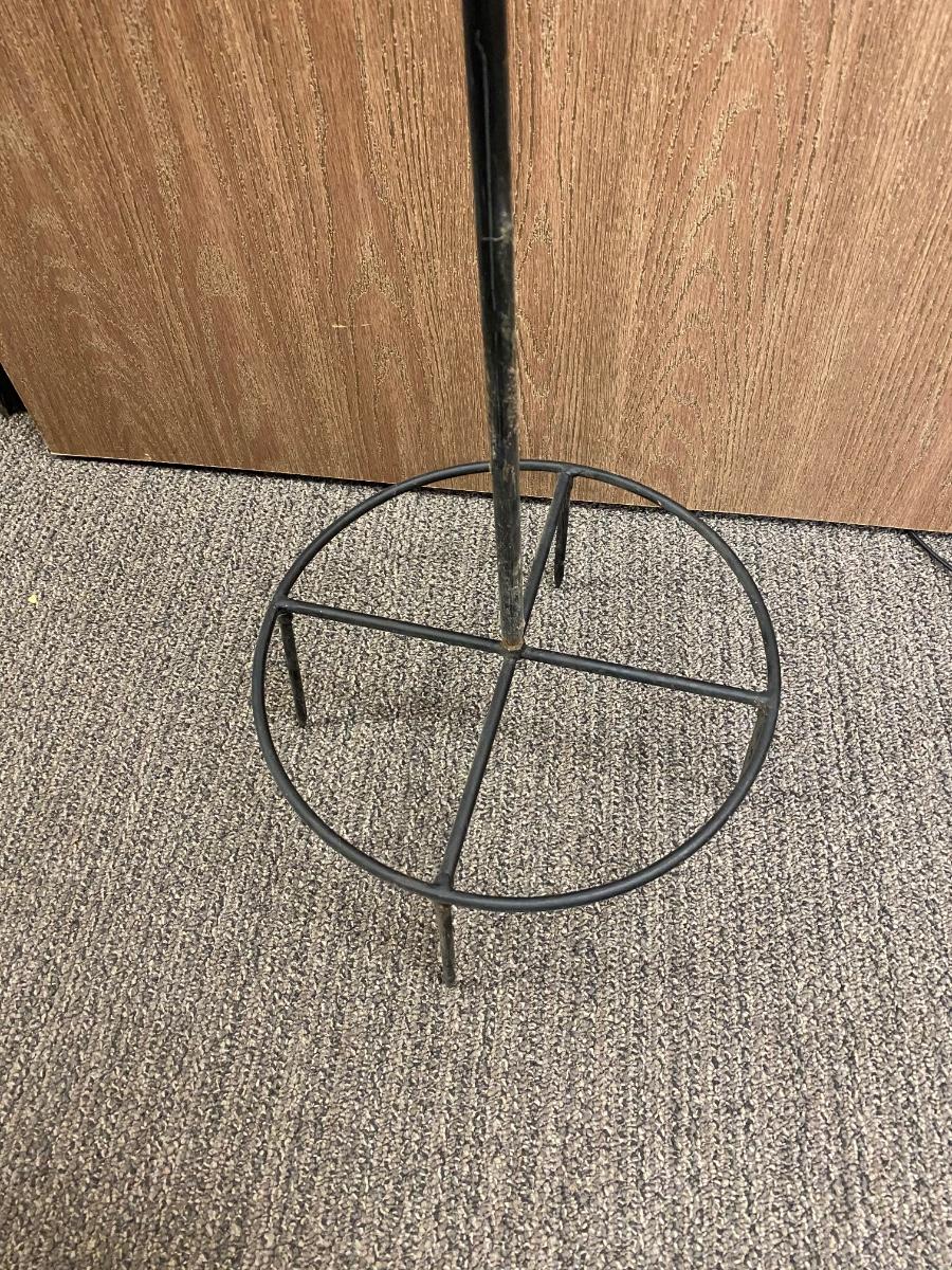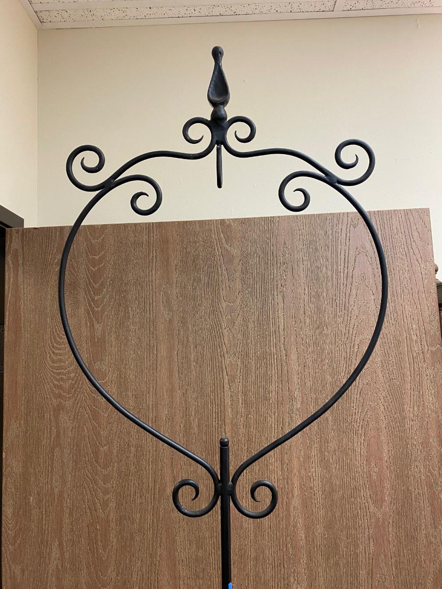 Blask Wrought Iron Metal Garden Hook with Ground Anchor. In good condition. Has a spiked base for secure placement. About 85" height.