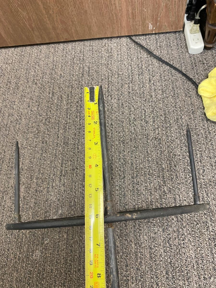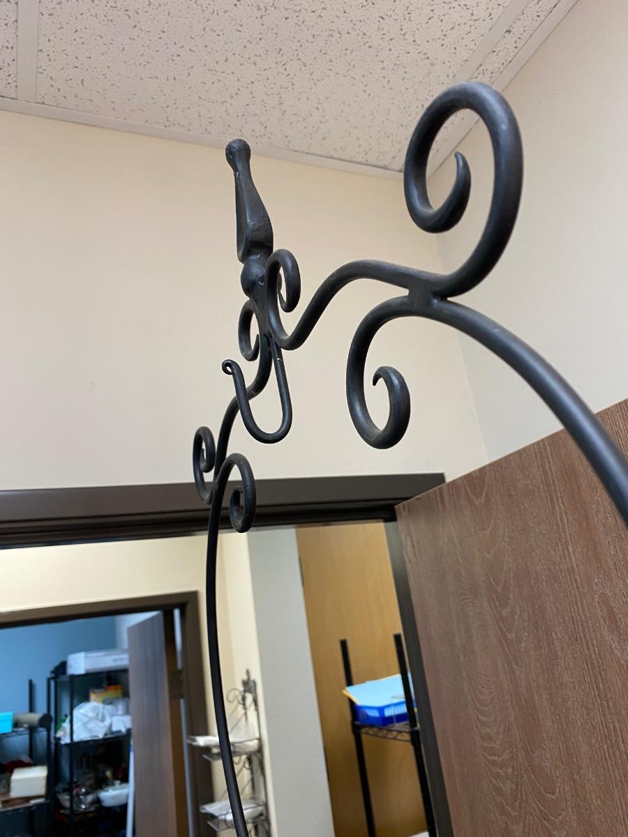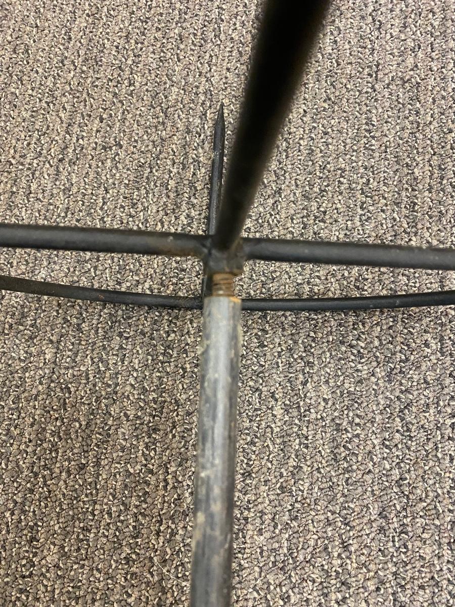 Blask Wrought Iron Metal Garden Hook with Ground Anchor. In good condition. Has a spiked base for secure placement. About 85" height.