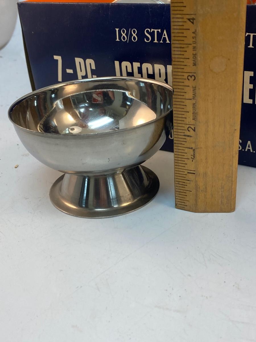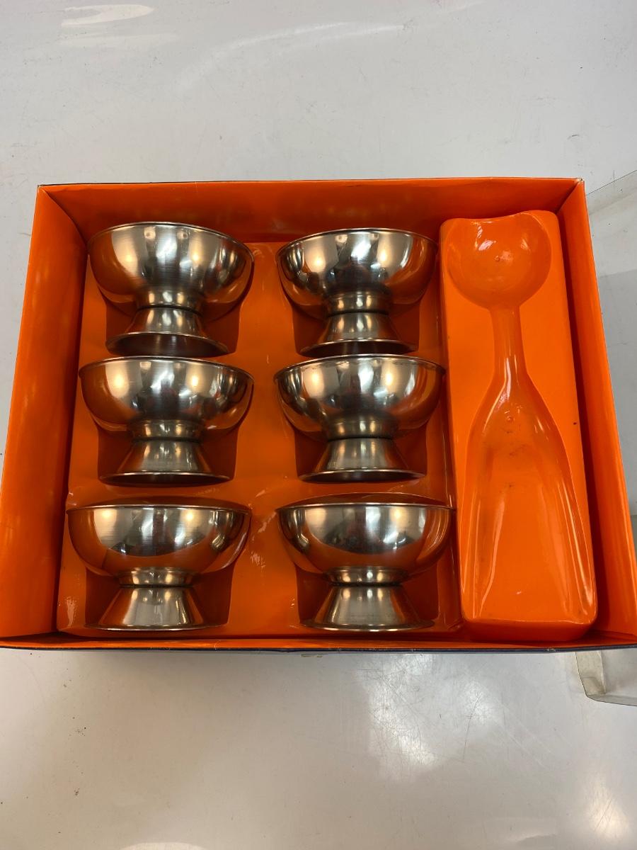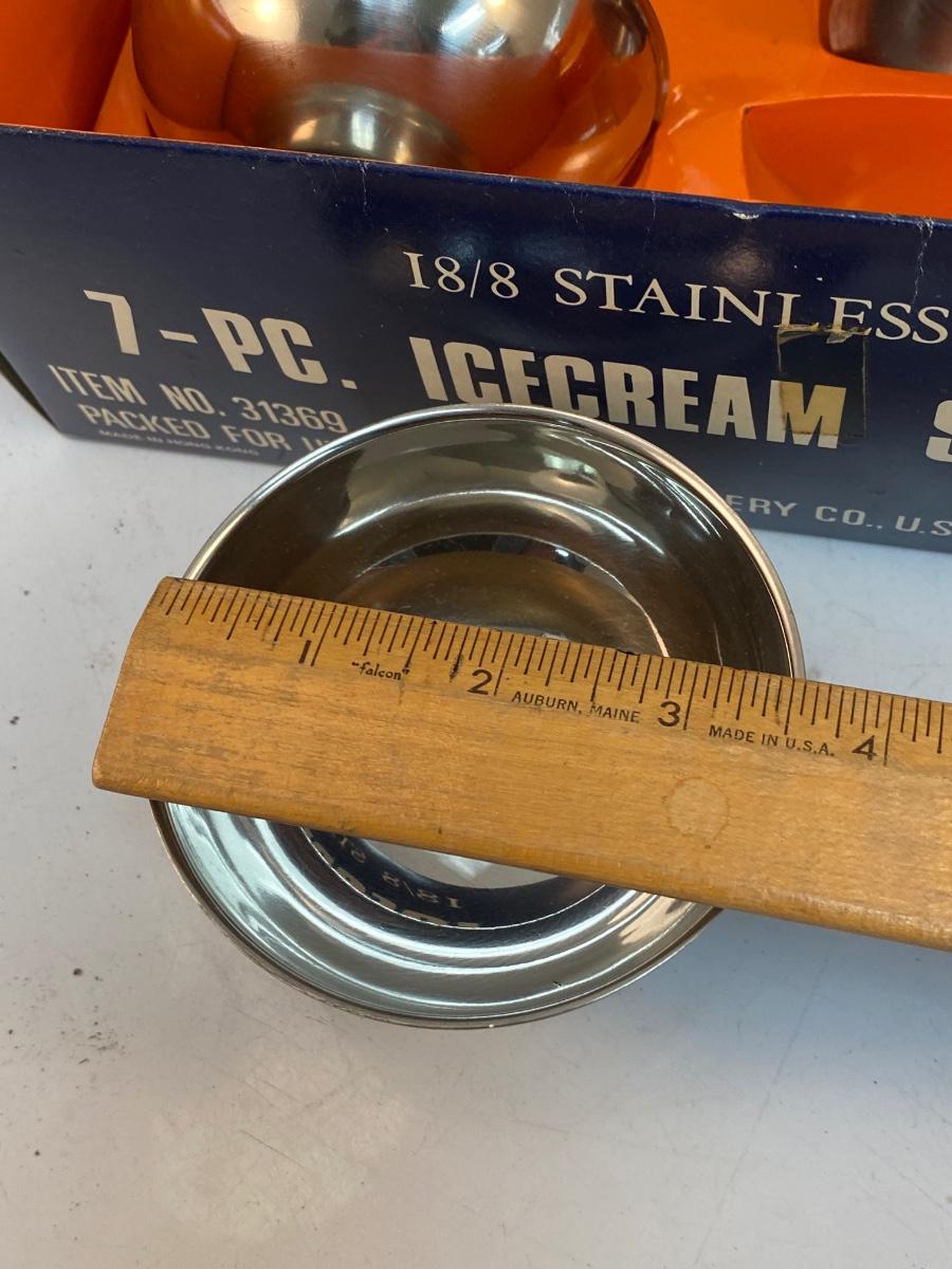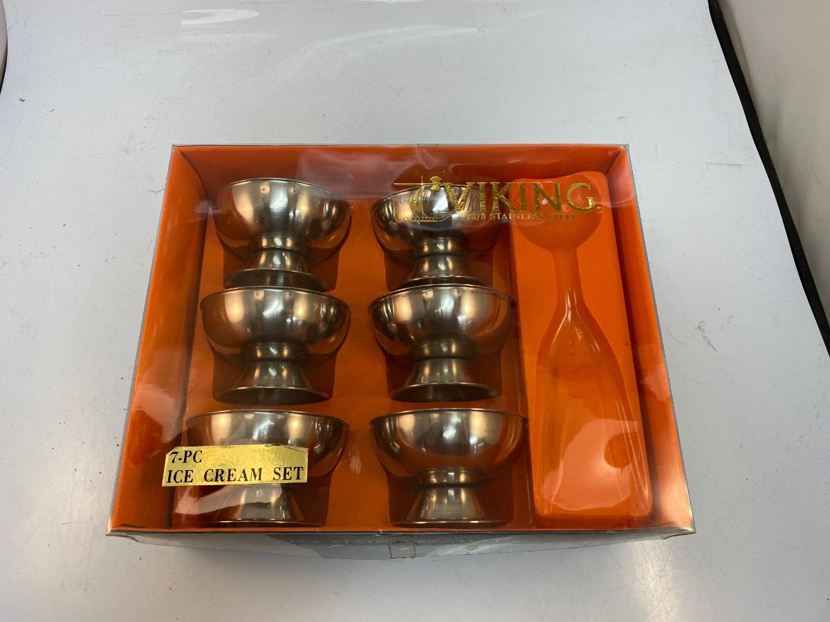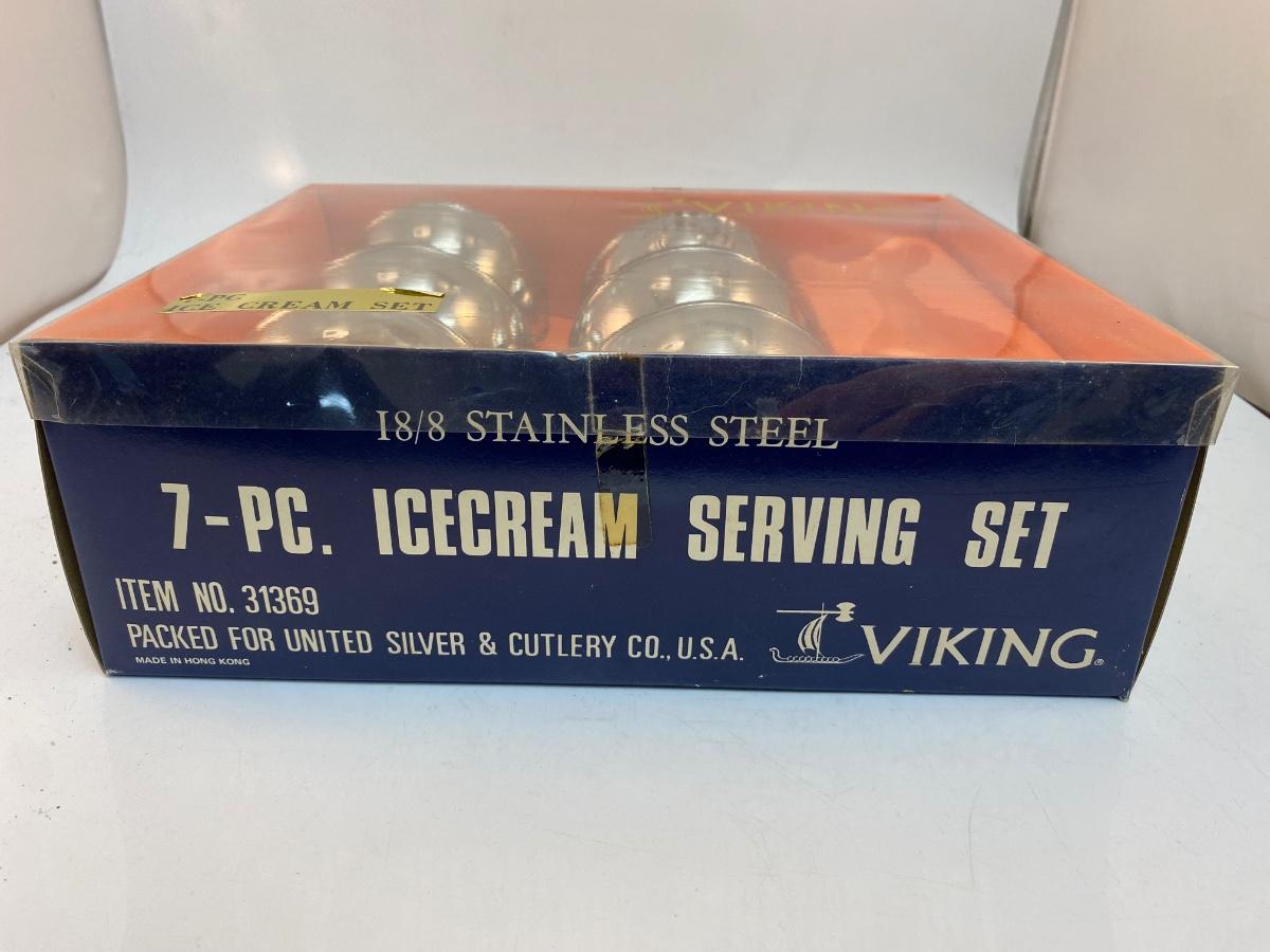 Vintage Viking Stainless Steel Ice Cream Cup Bowl Dish Set with Box *Missing Scooper*. Bowl are in great condition, possibly unused. Unfortunately, missing the ice cream scooper.