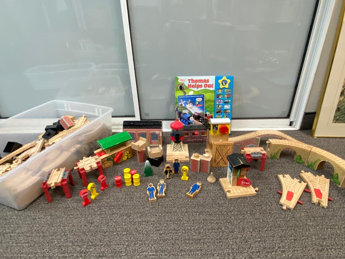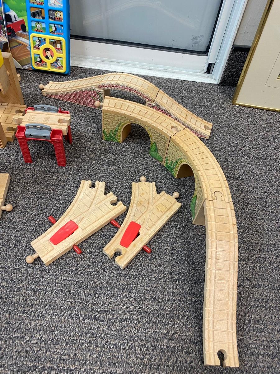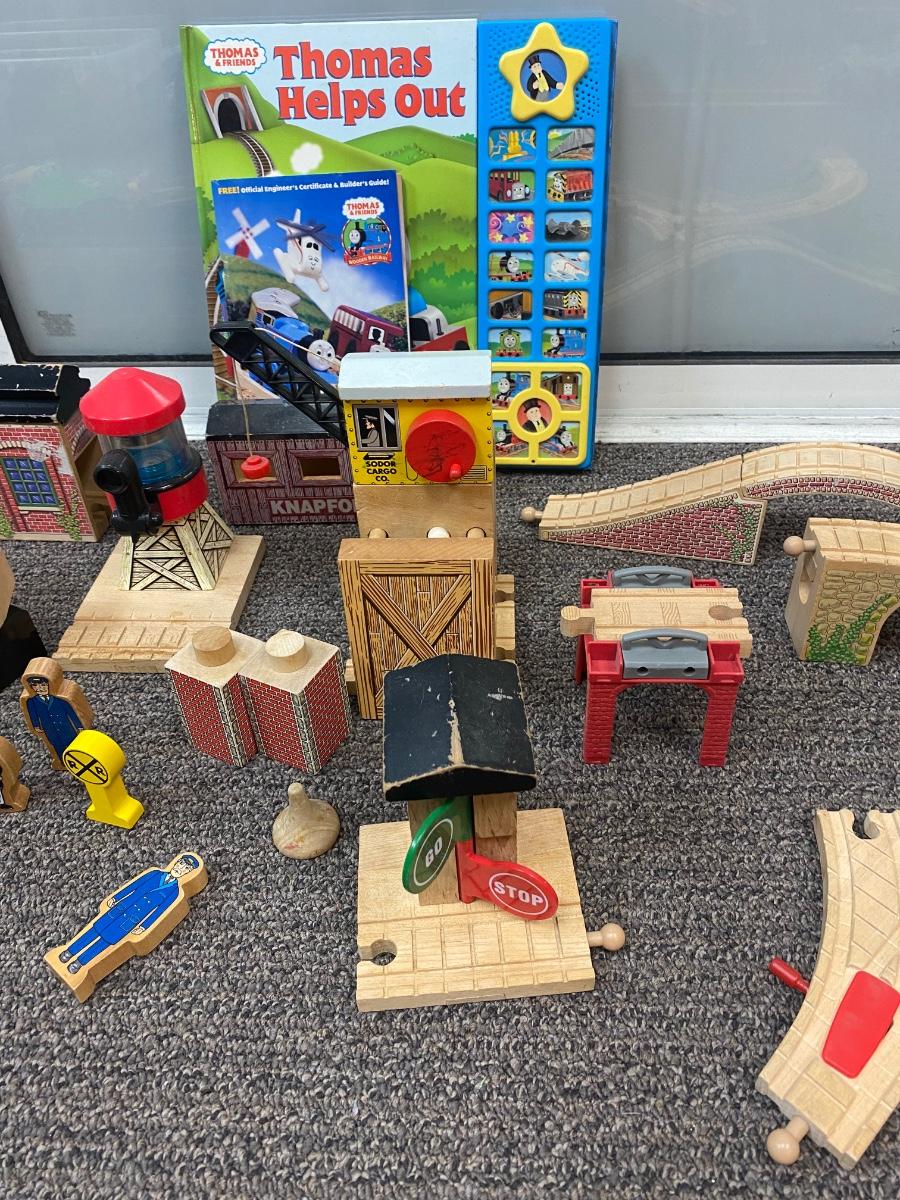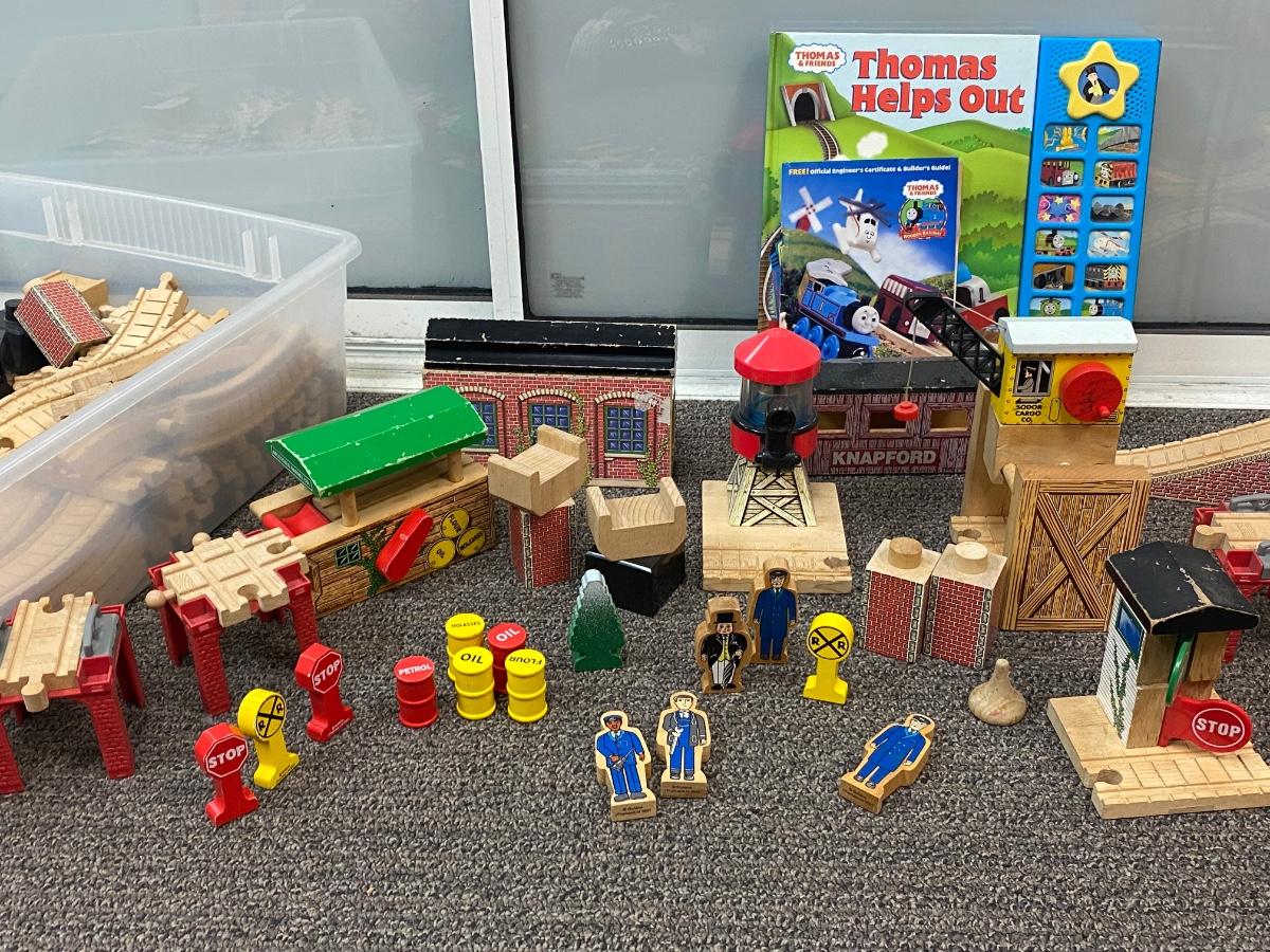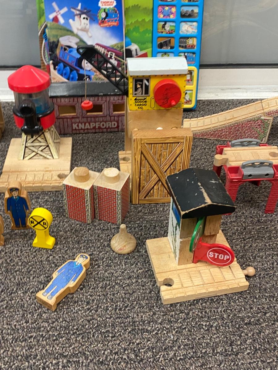 Thomas the Tank Engine & Friends Wooden Train Track Set with Railway Accessories. Includes Sir Topham Hatt. Tons of track pieces. Booklet included with different track set ups and illustration of pieces needed. See Photos.