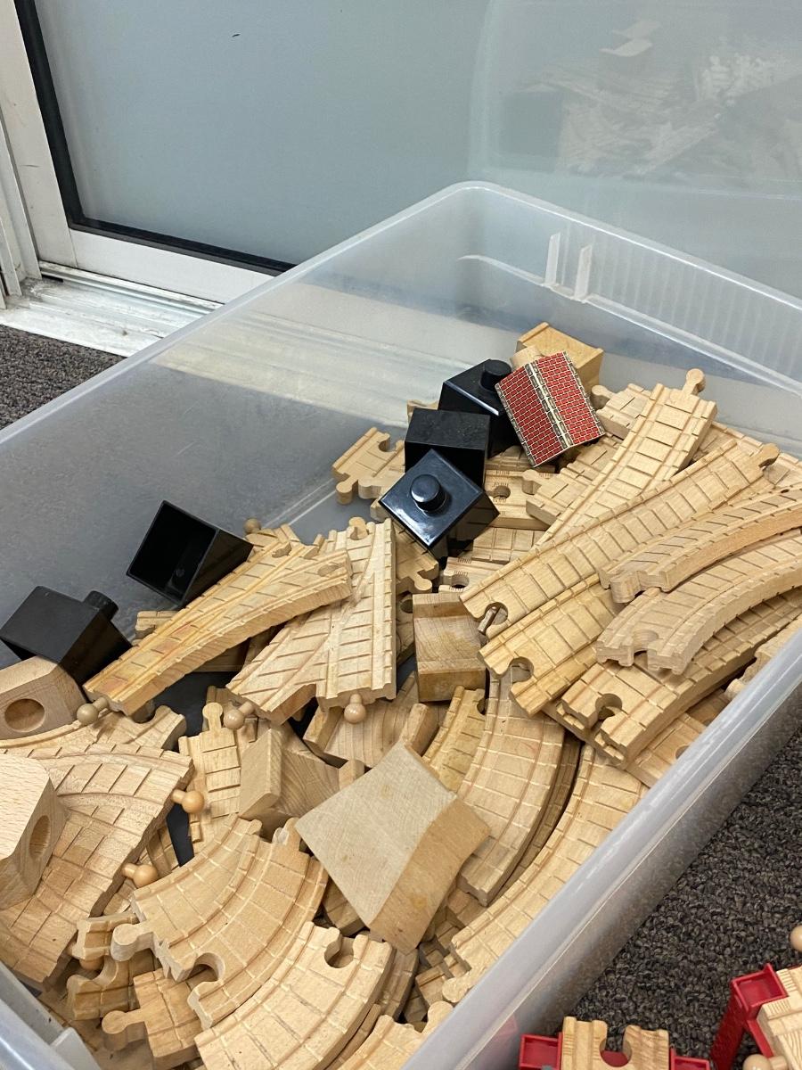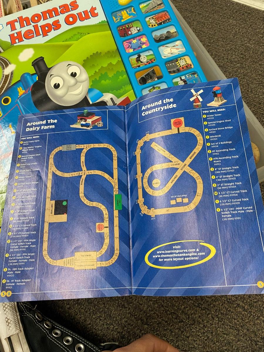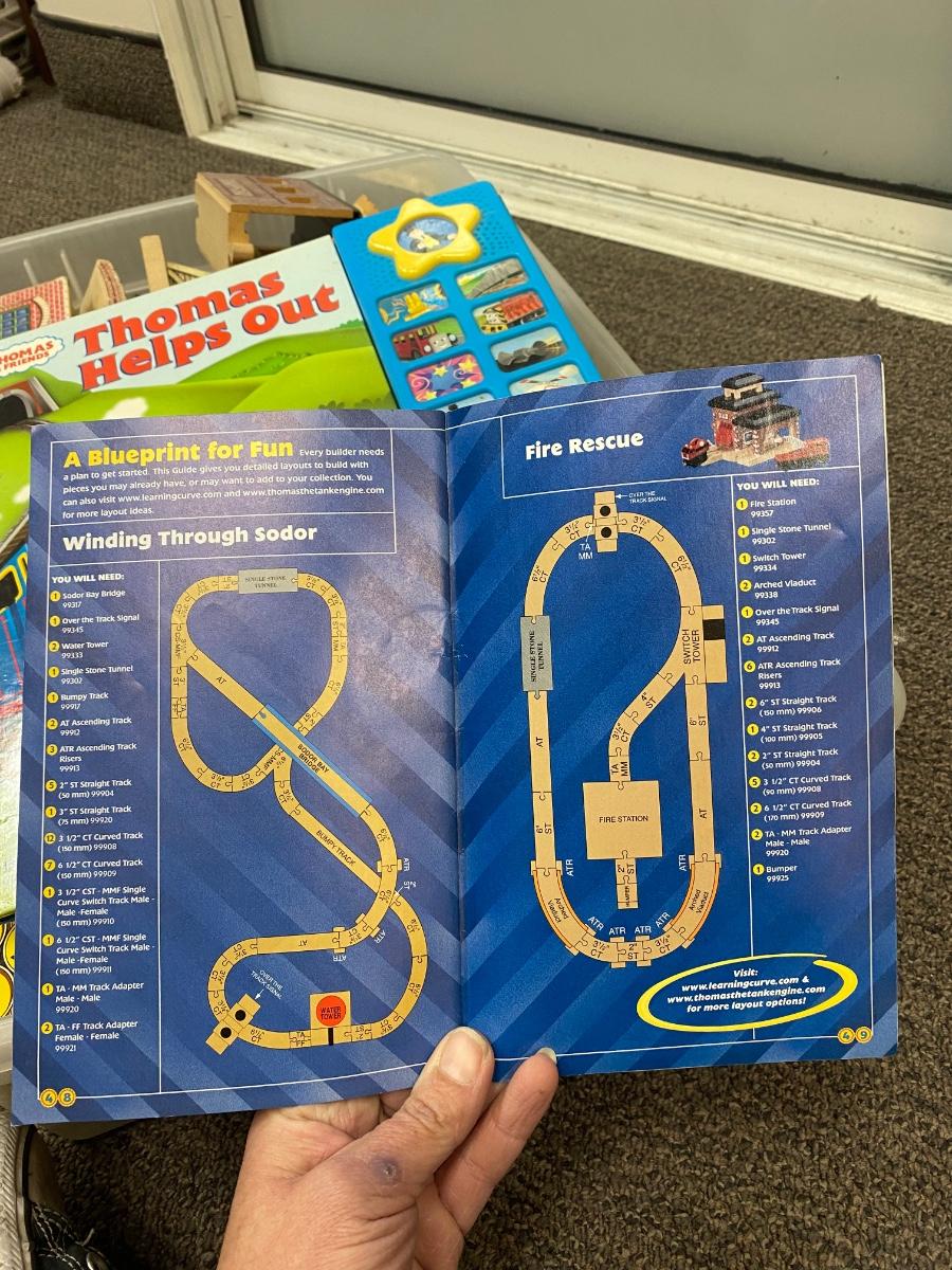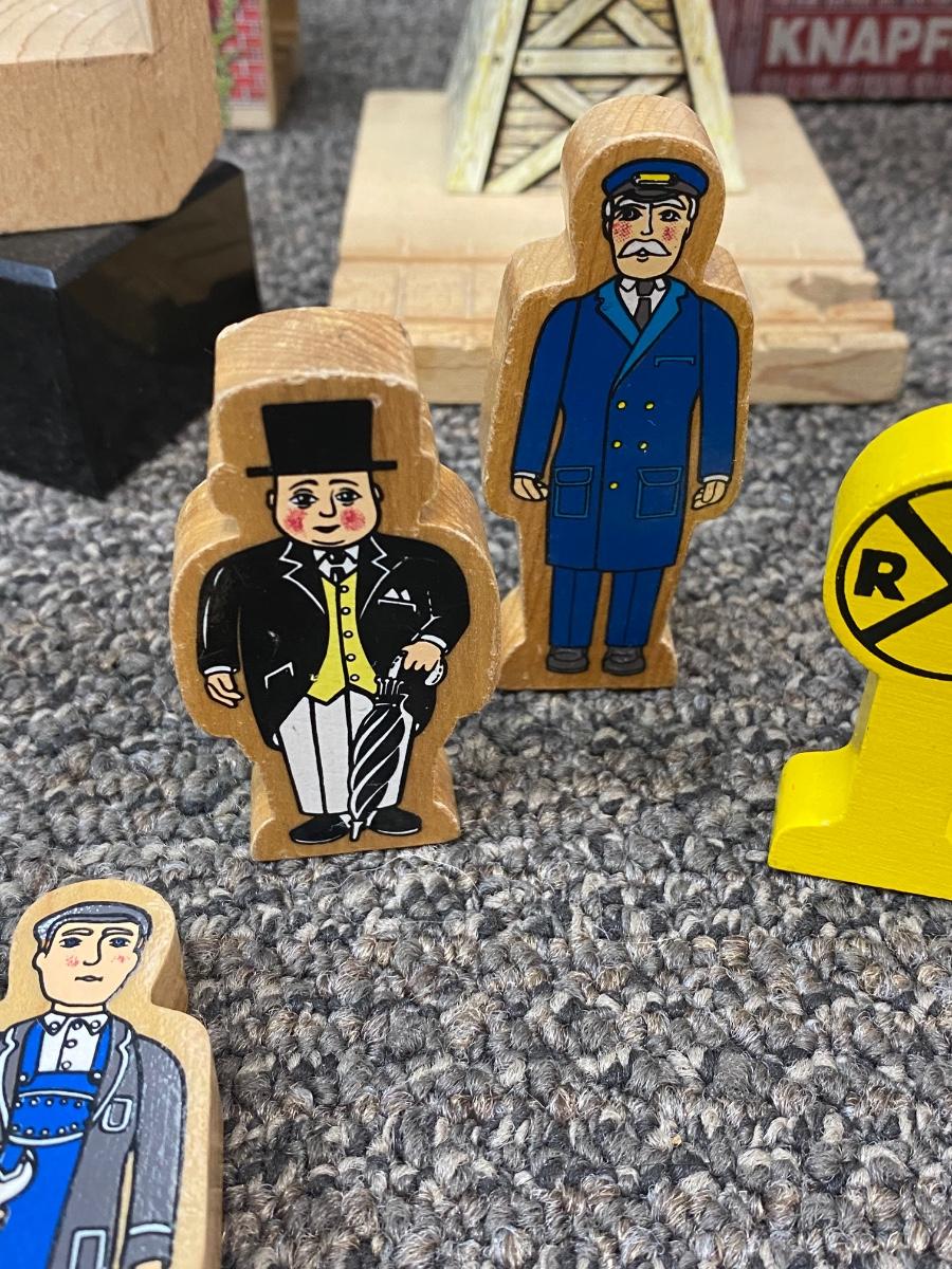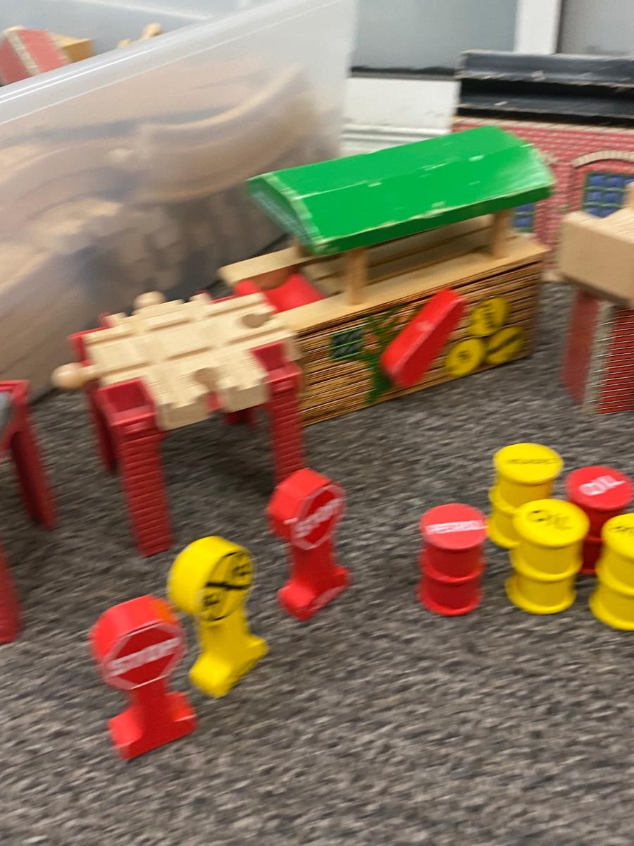 Thomas the Tank Engine & Friends Wooden Train Track Set with Railway Accessories. Includes Sir Topham Hatt. Tons of track pieces. Booklet included with different track set ups and illustration of pieces needed. See Photos.