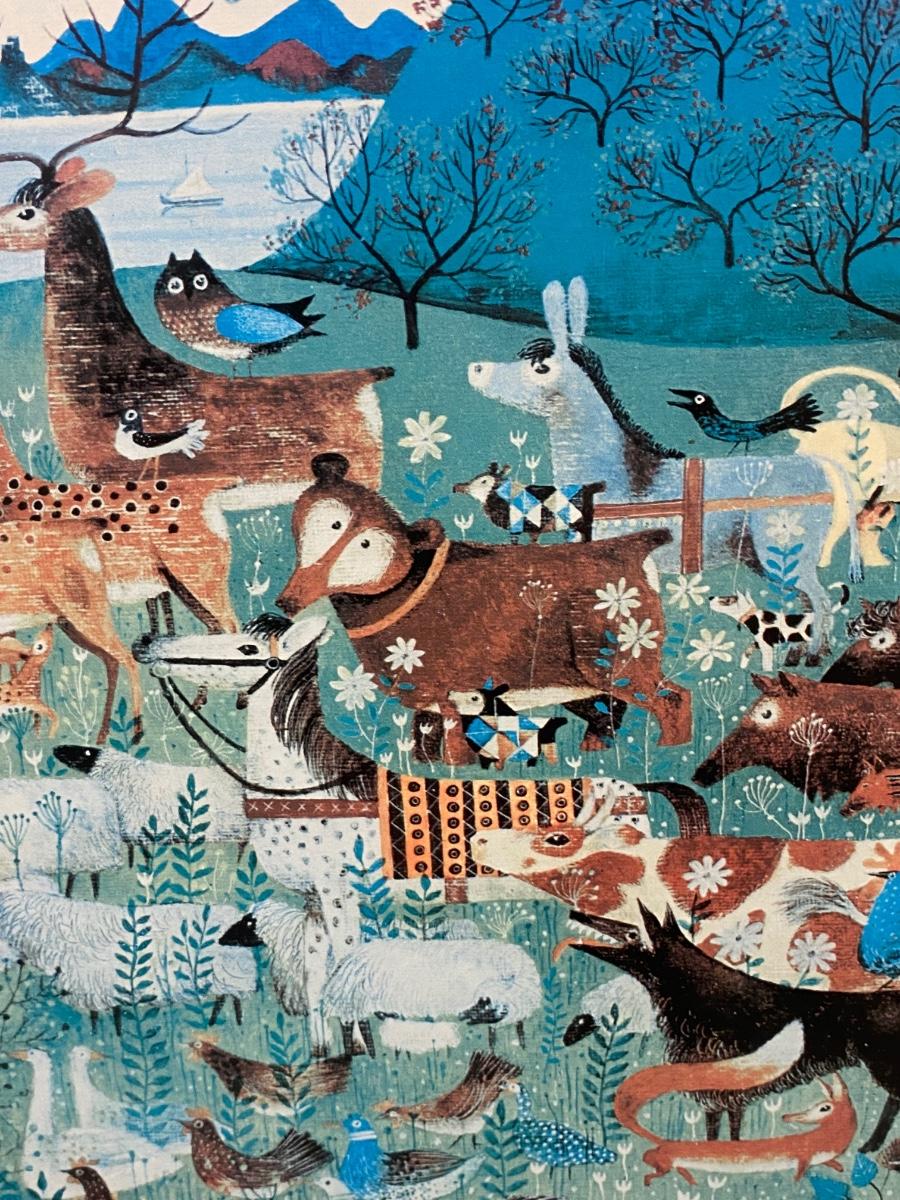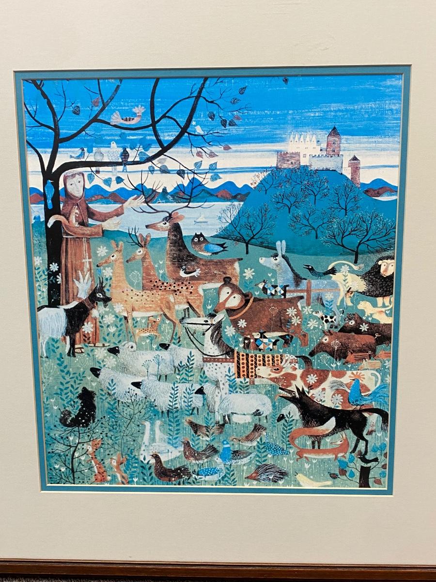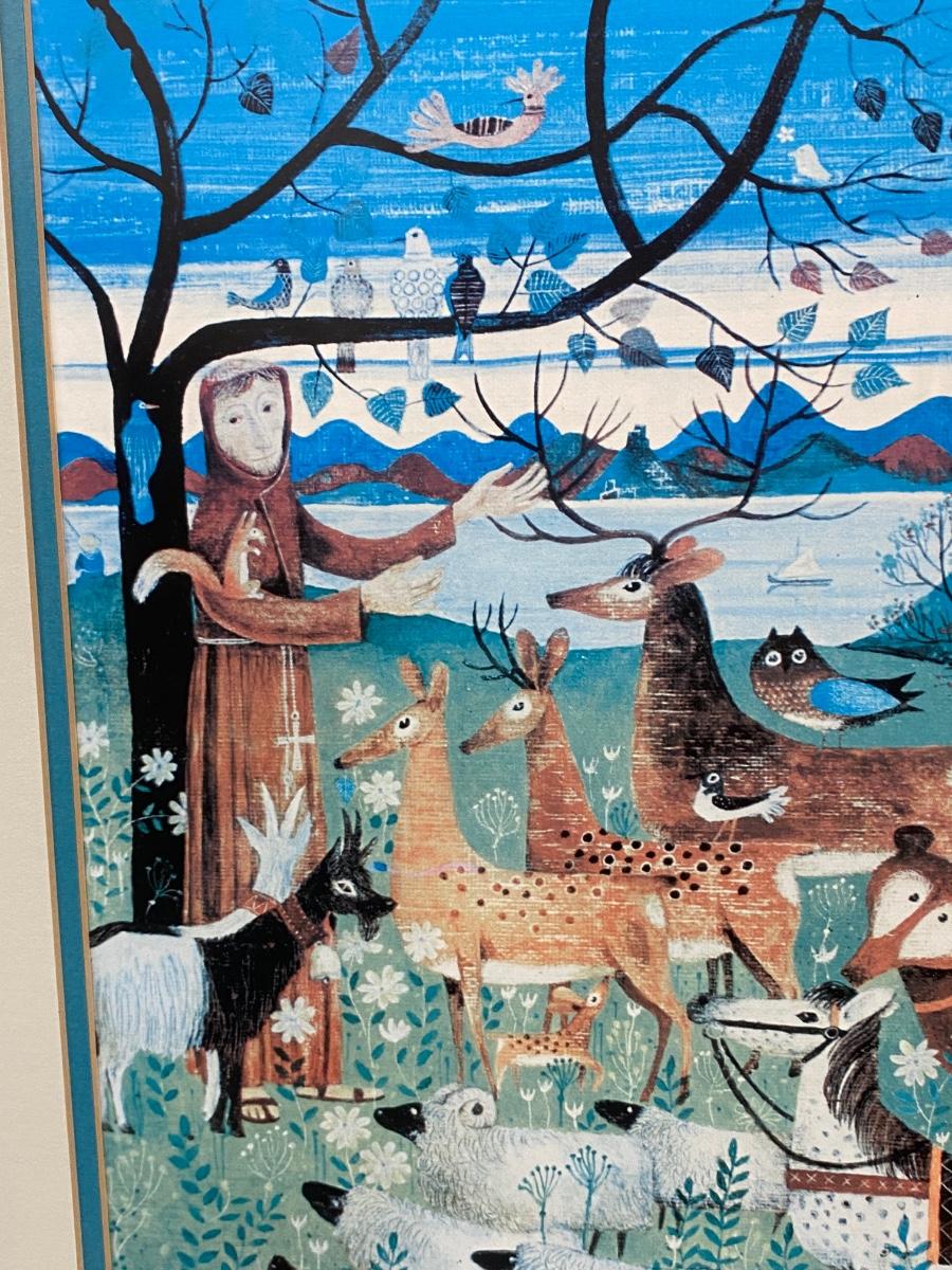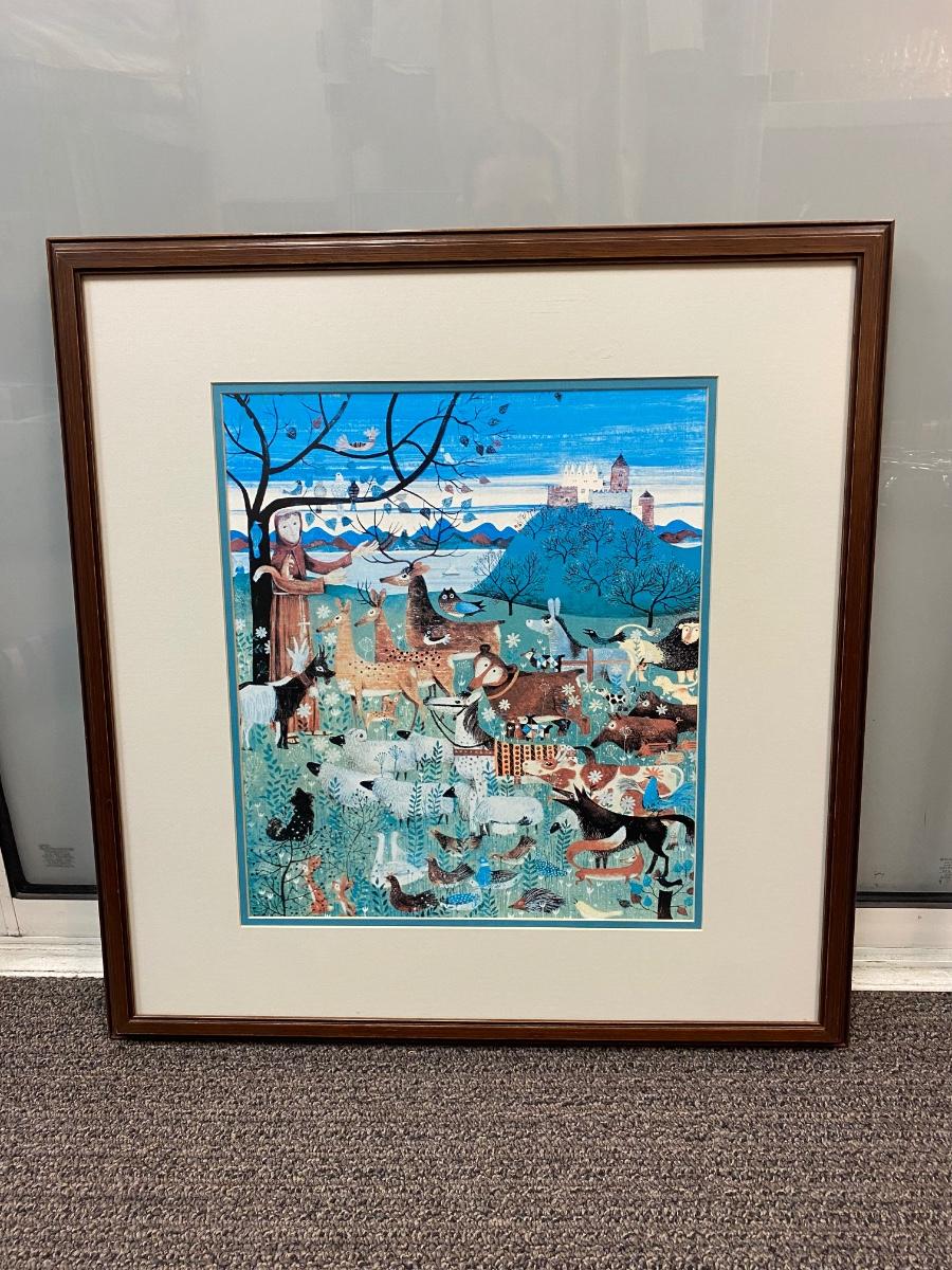 Colorful Framed Art Monk with Animals. No signature. 22"x23" framed size.