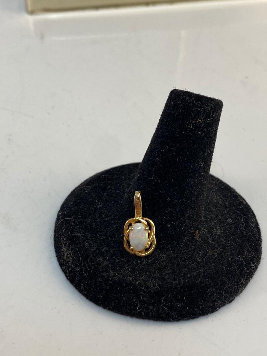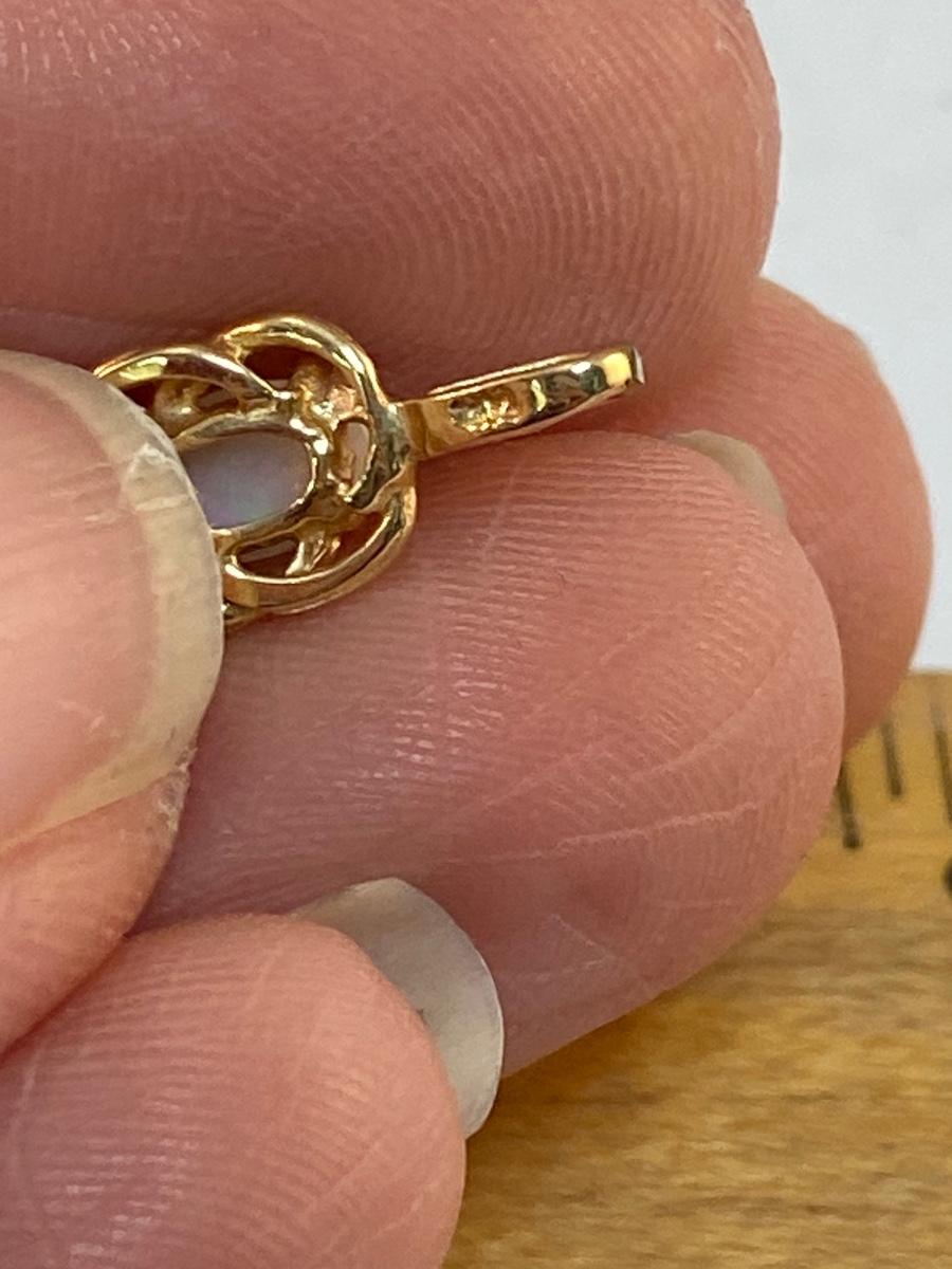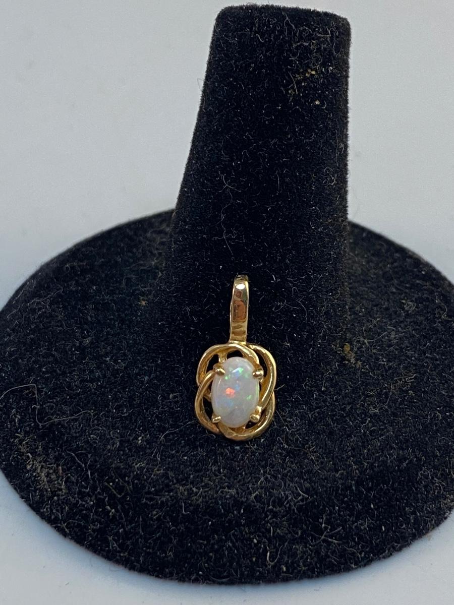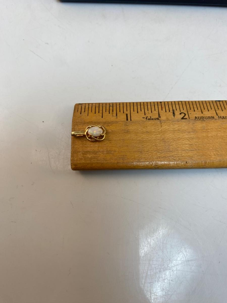 14k Yellow Gold & Opal Pendant Charm. Oval shaped opal cabochon in yellow gold setting. Marked 14k on pendant loop. About 1/2" size. 0.76g tw.