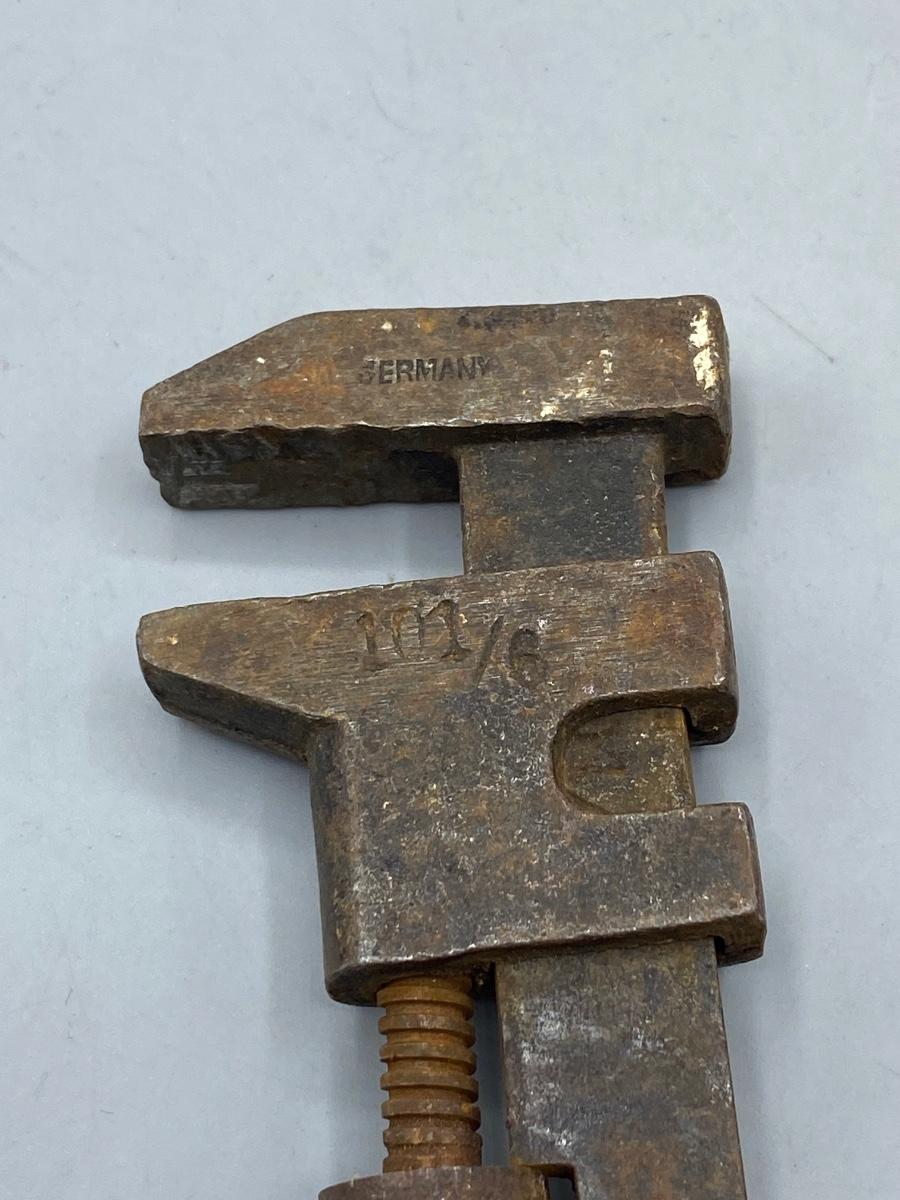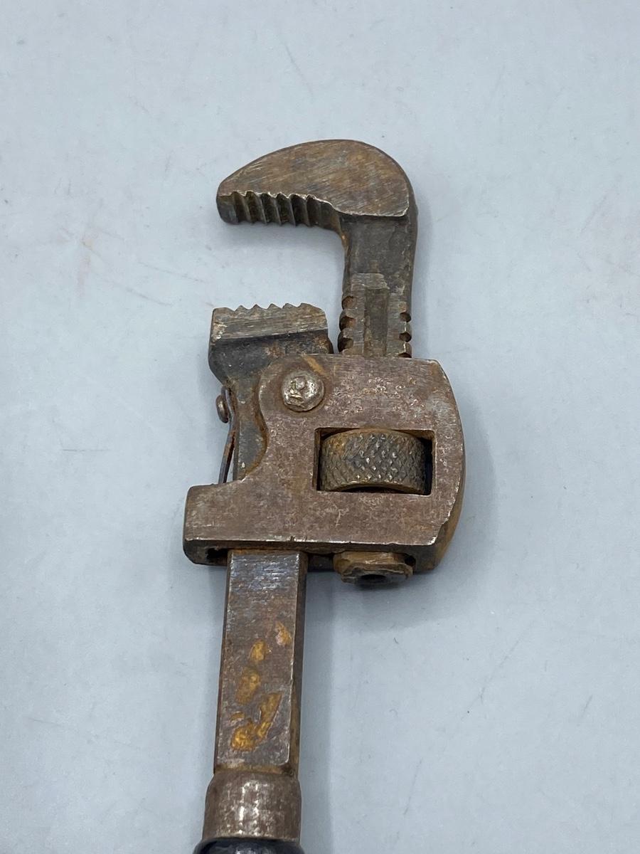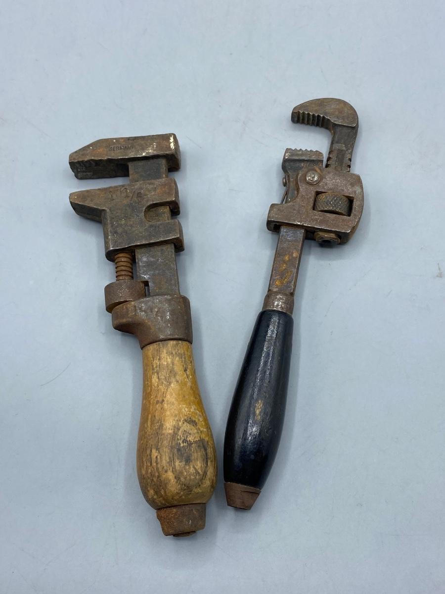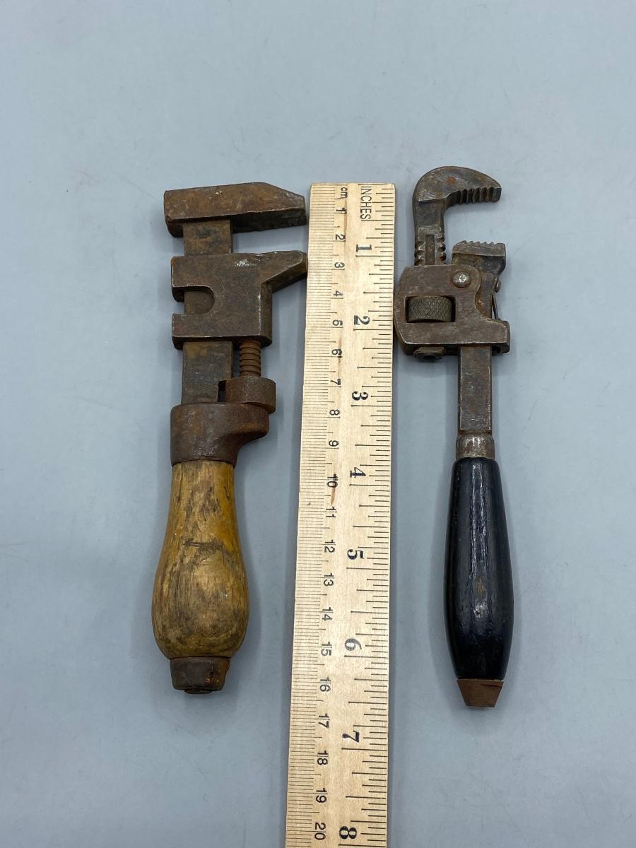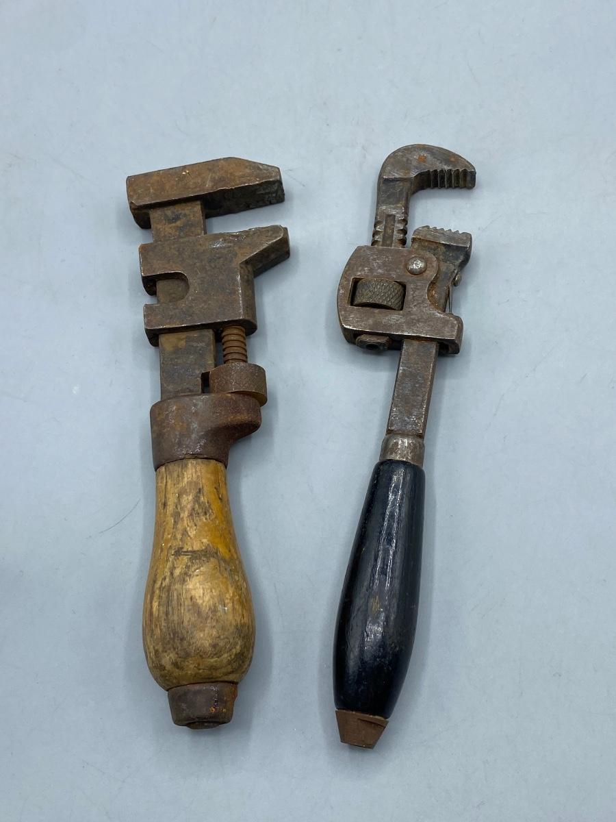 Pair of Vintage Small Adjustable Pipe Monkey Wrenches with Wood Handles. A little weathered but useable. Can be adjusted not rusted tight. 6.5" size.