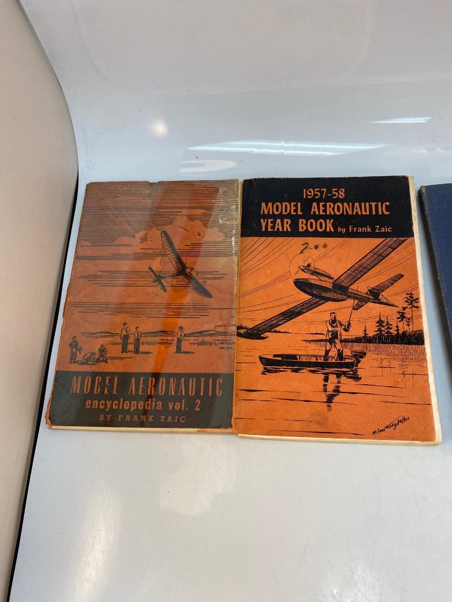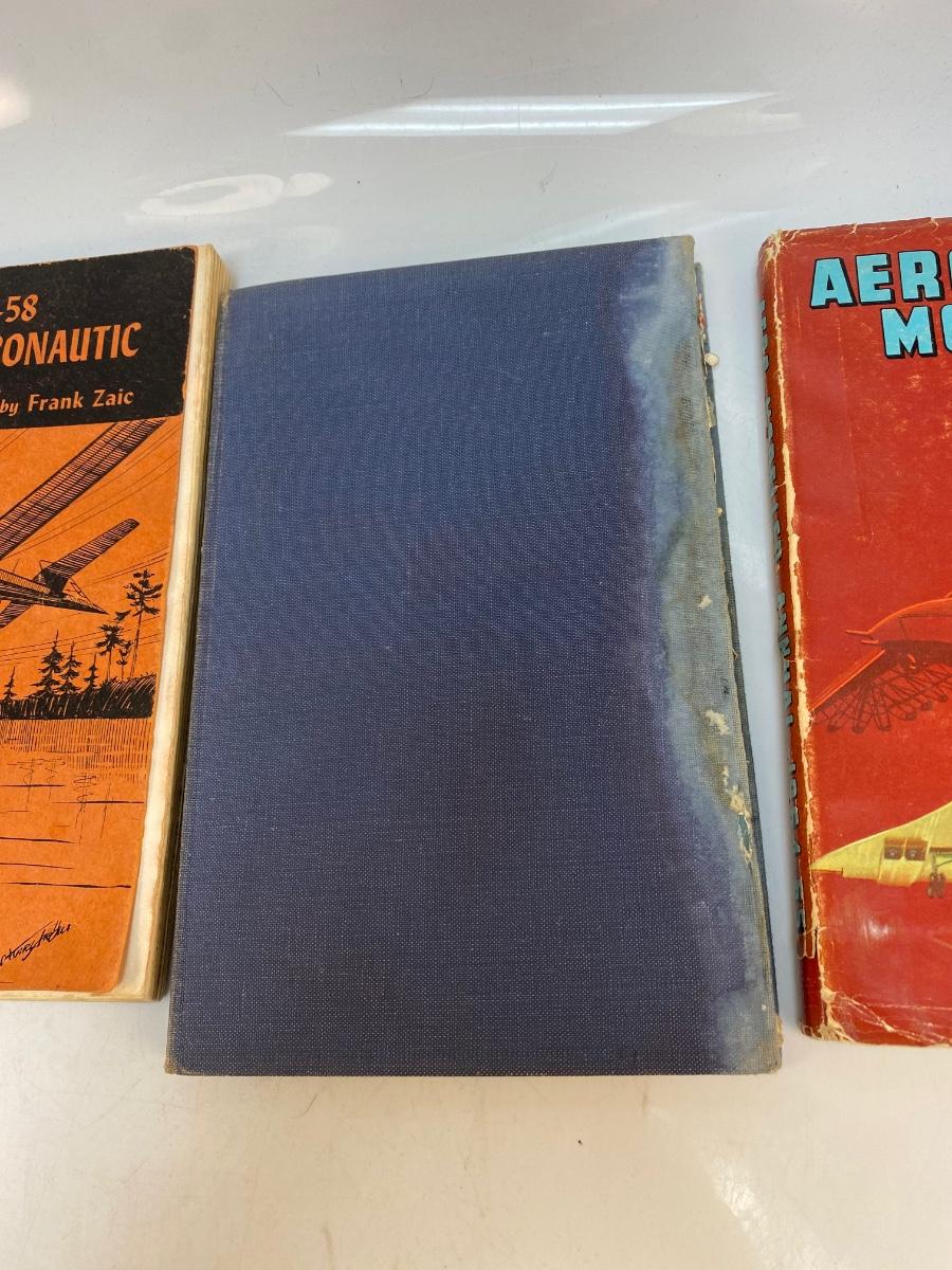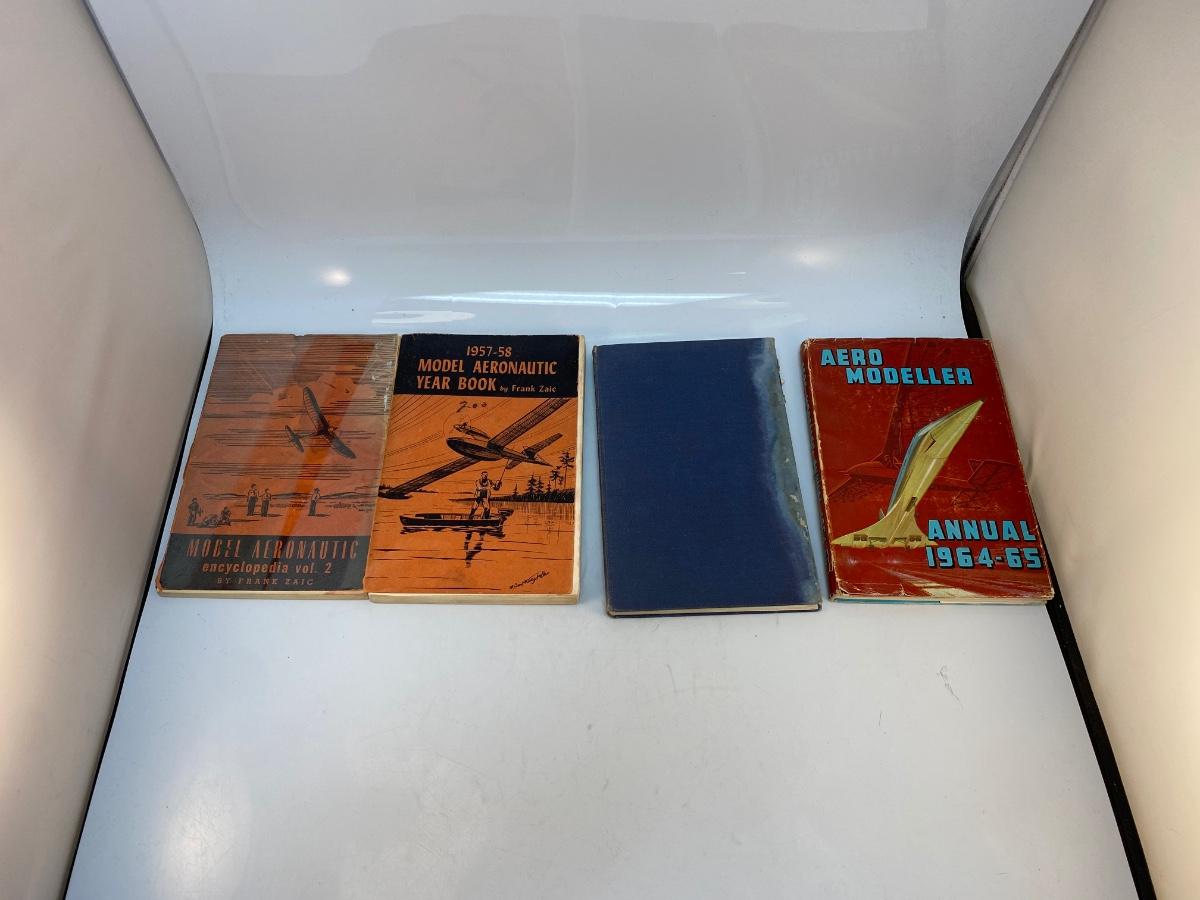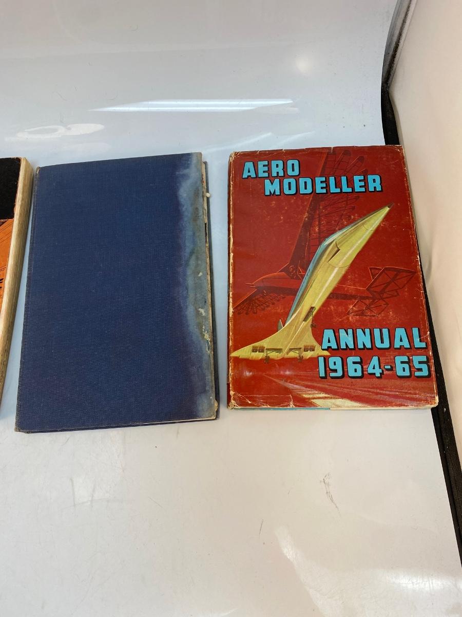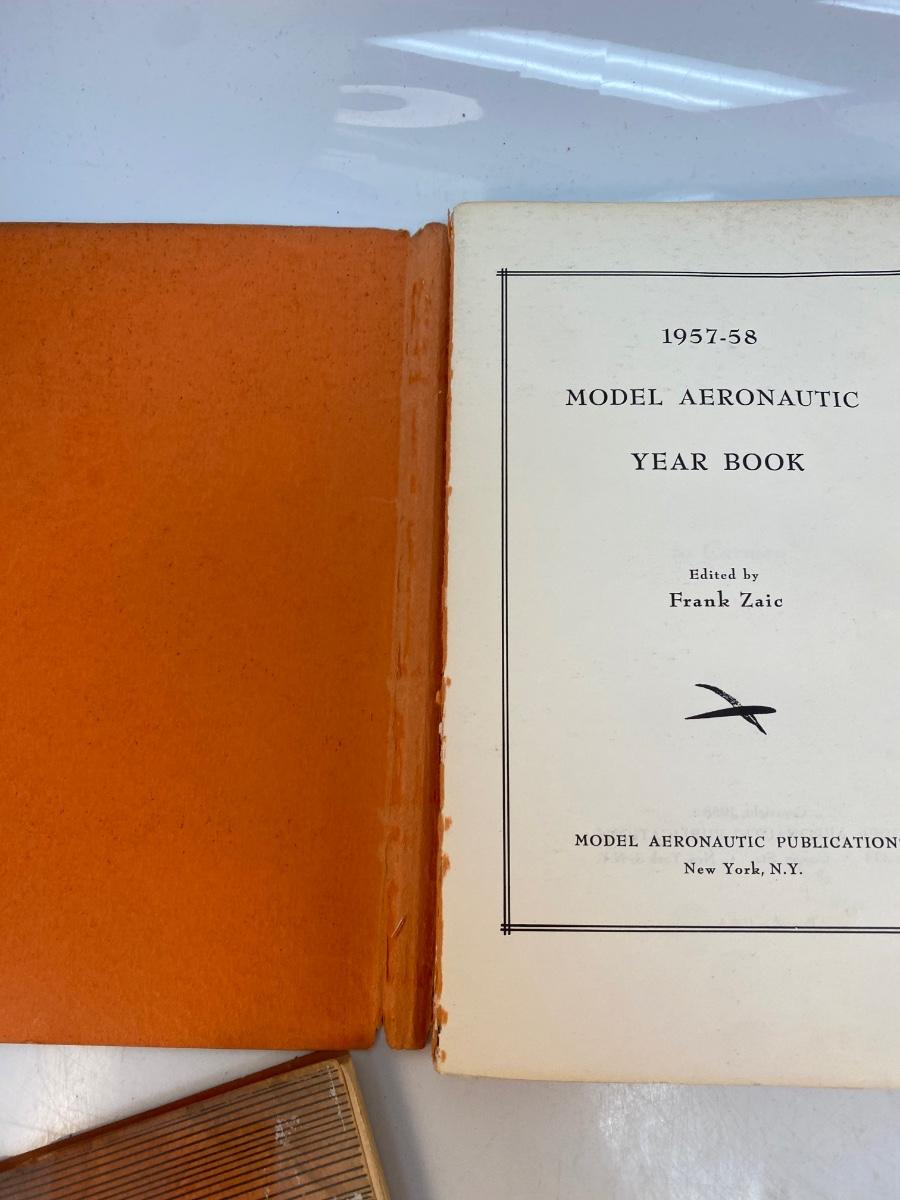 Lot of Vintage Model Aeronautics Annual Year Books Model Planes 1950s 1960s. In aged condition. The dark blue one has the most damage along the edge of first half of pages.