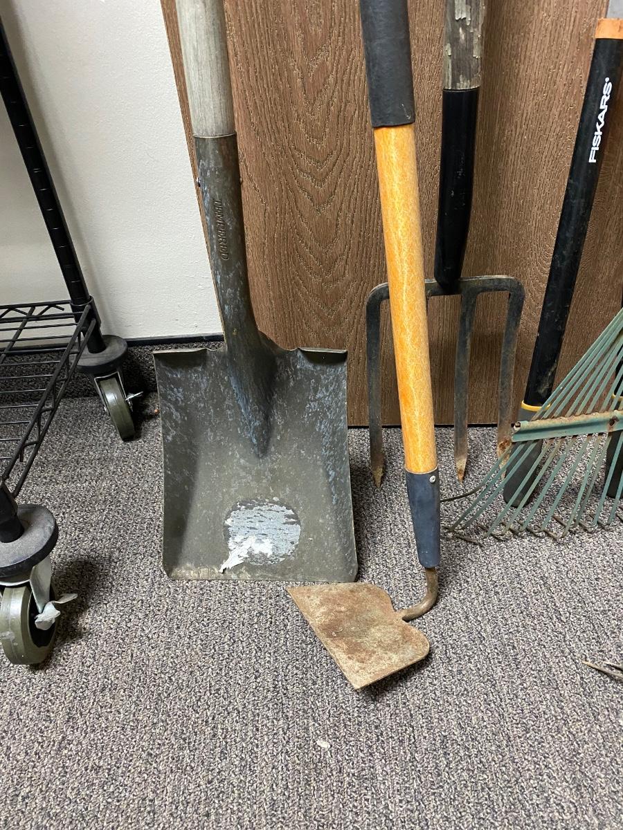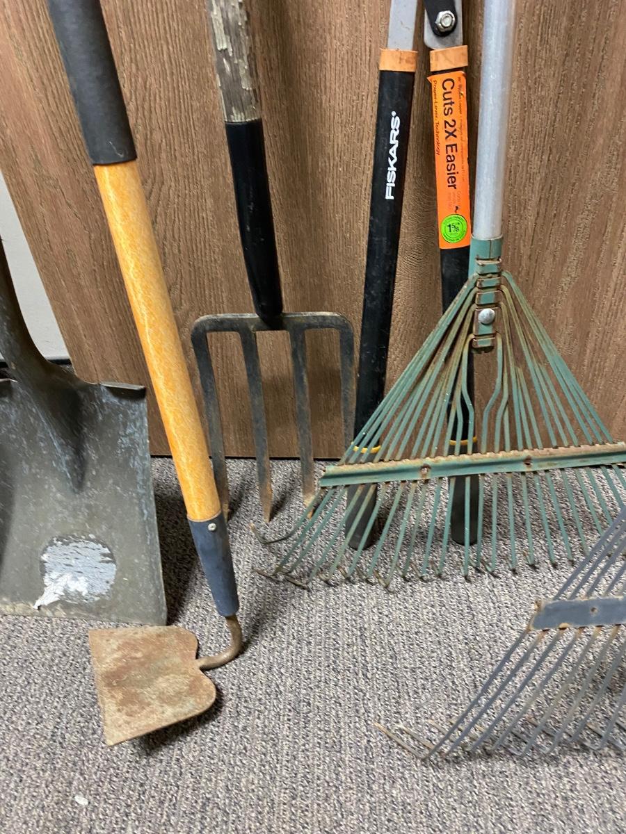 Garden Yard Hand Tool Lot Shovel Rakes Pitchfork Hoe Branch Cutters. In good used condition.