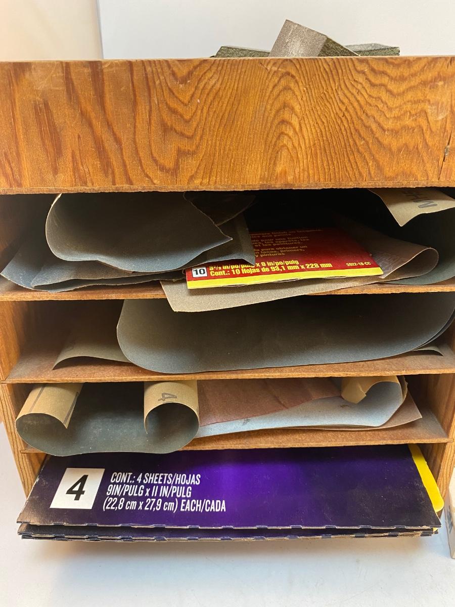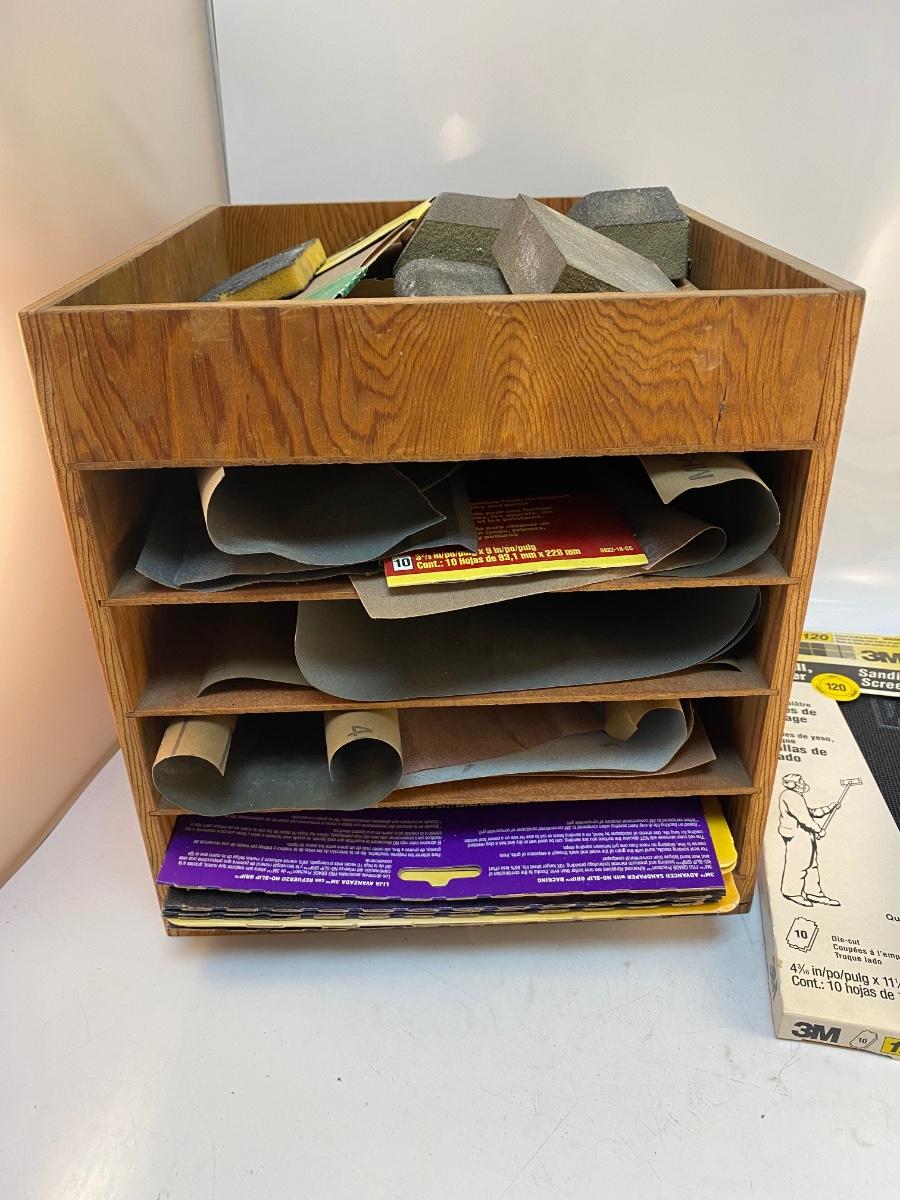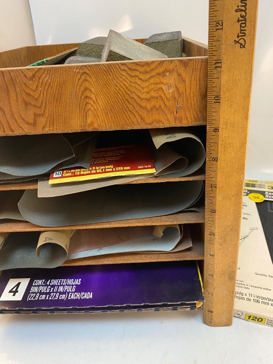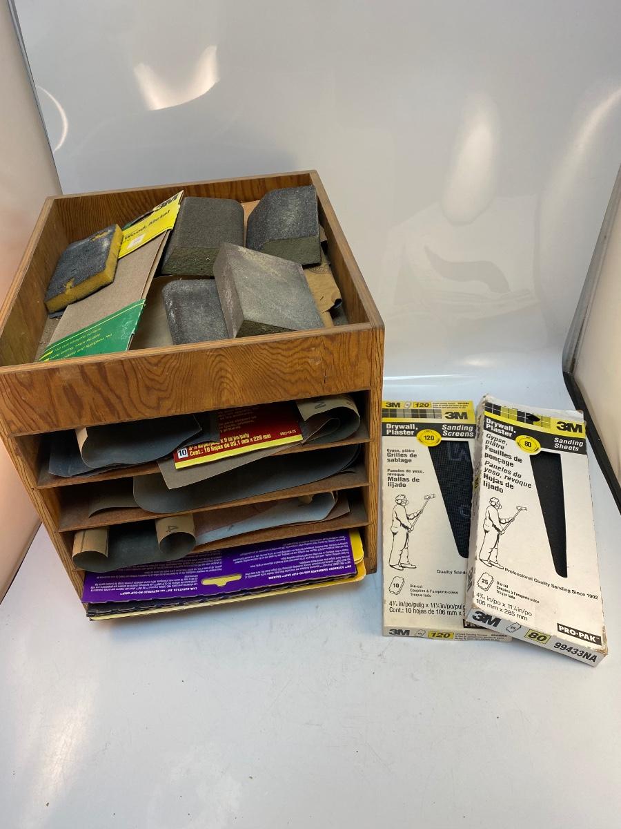 Mixed Lot of Sandpaper with Wood Storage Shelf