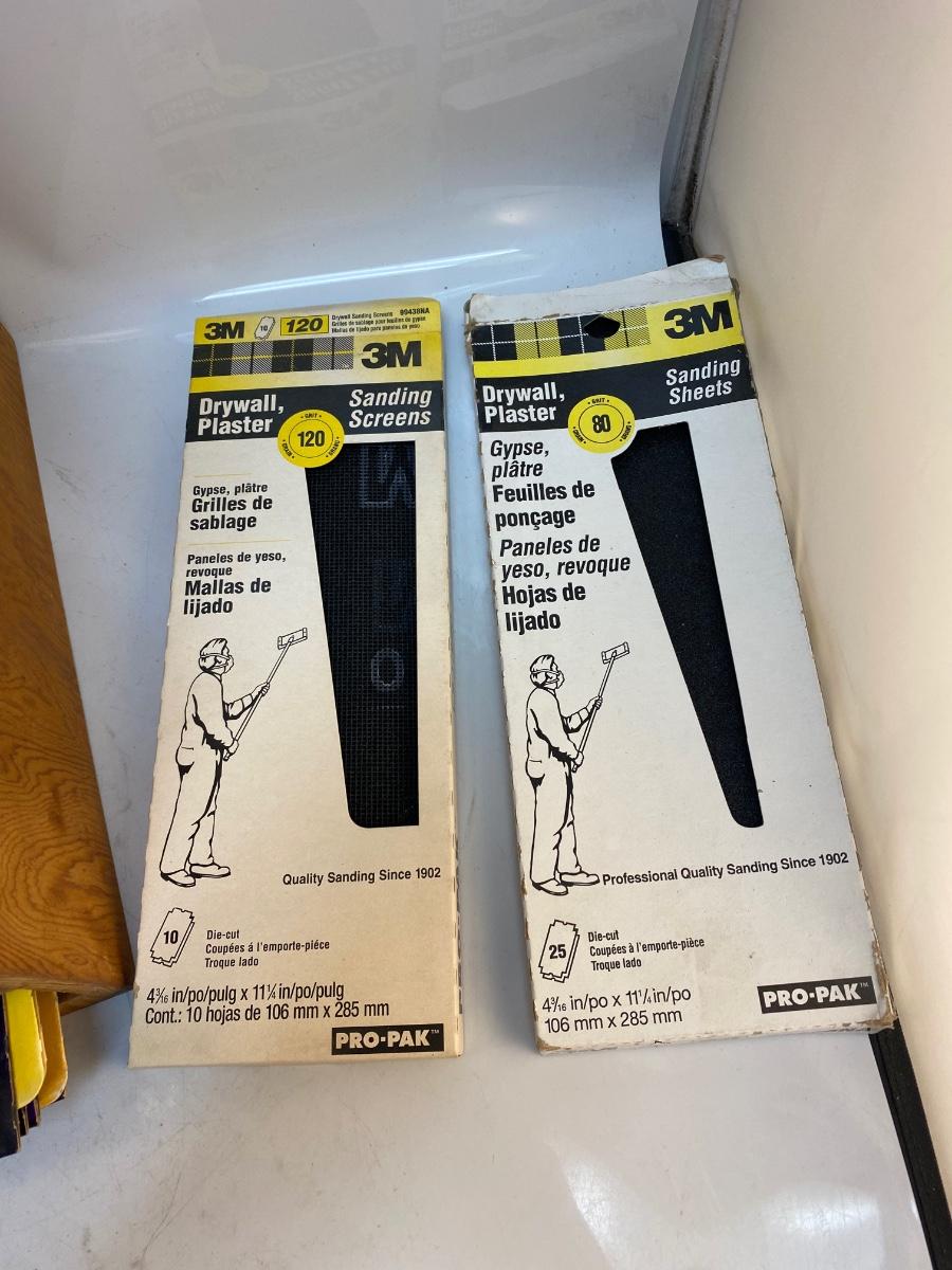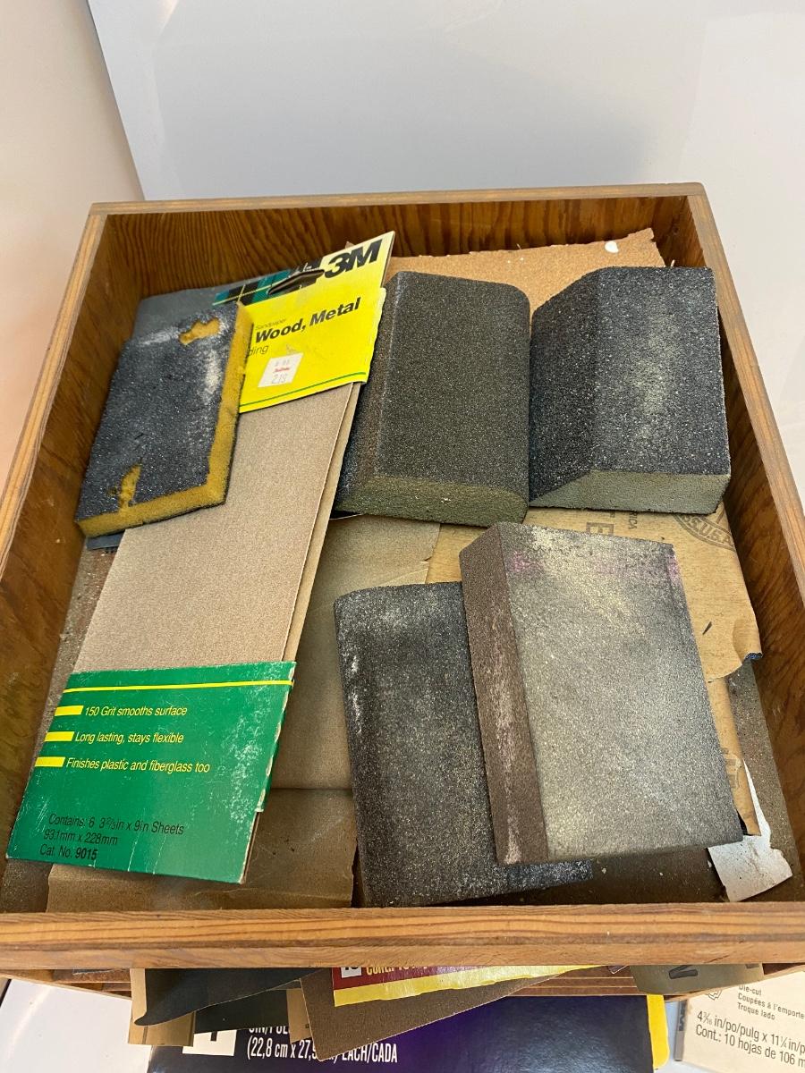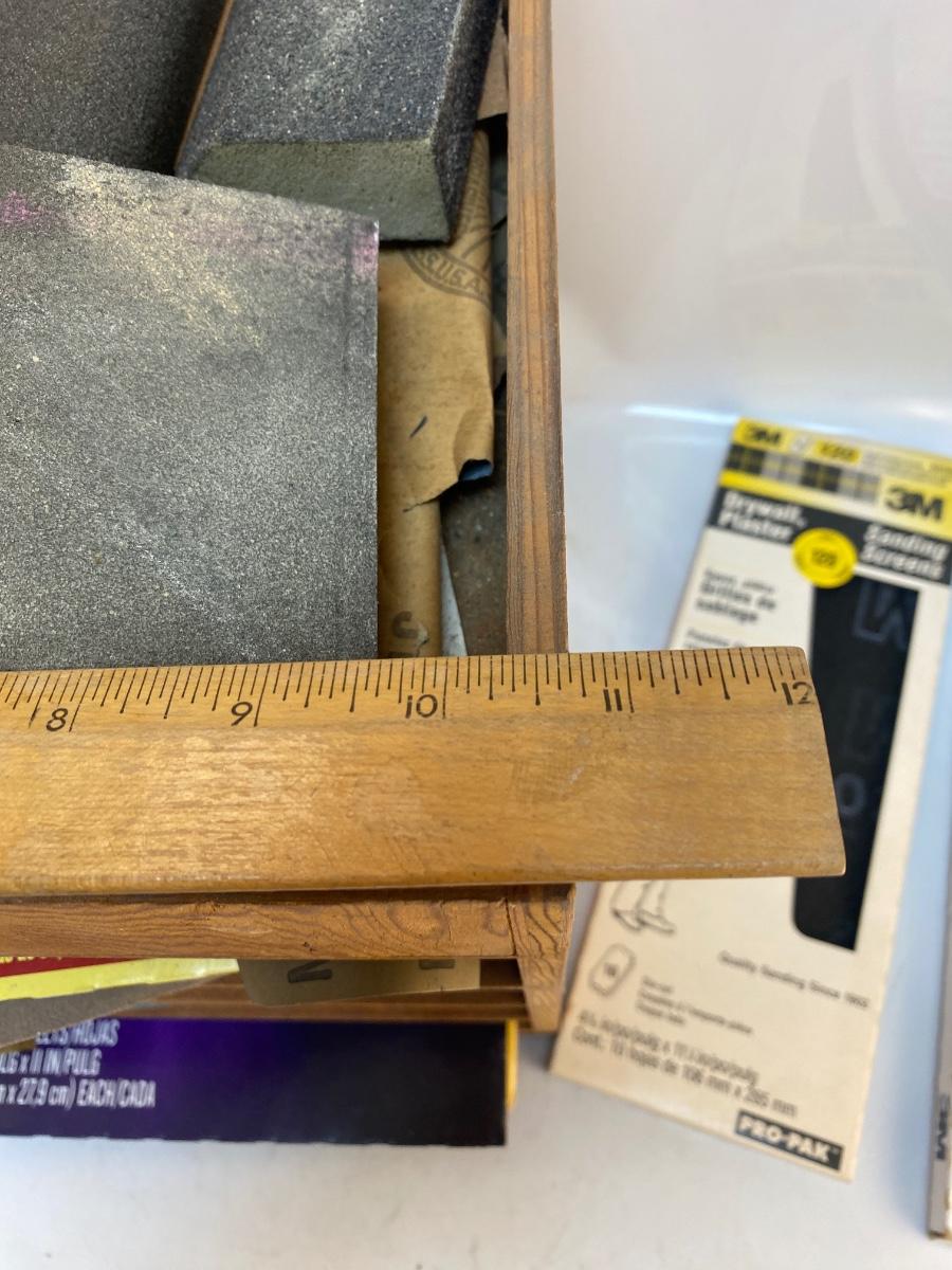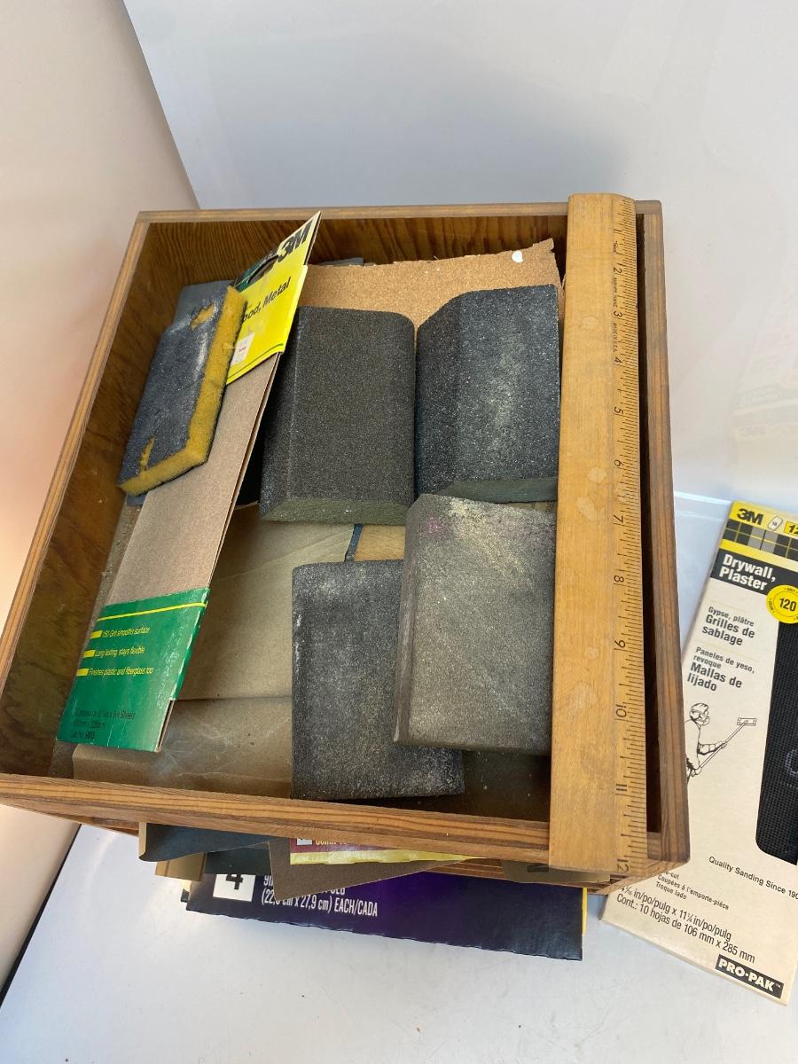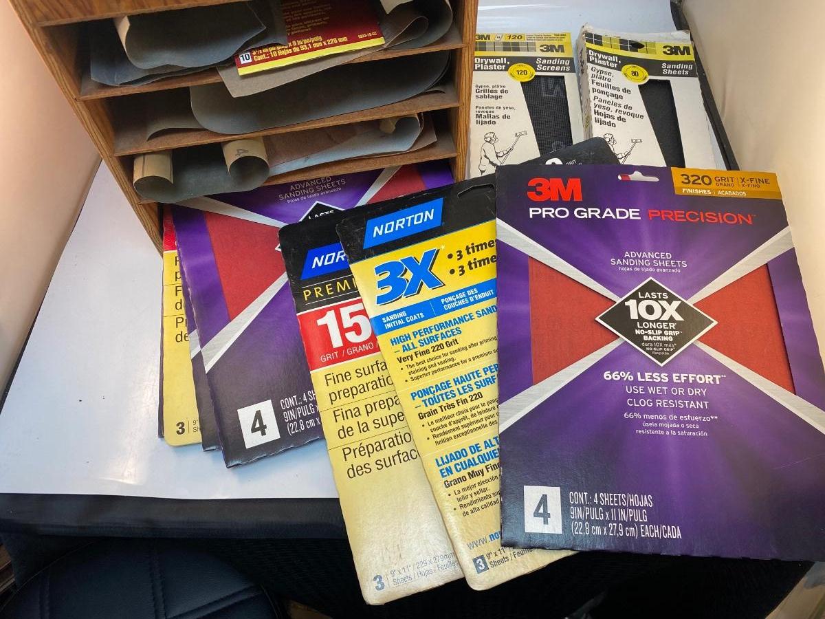 Mixed Lot of Sandpaper with Wood Storage Shelf