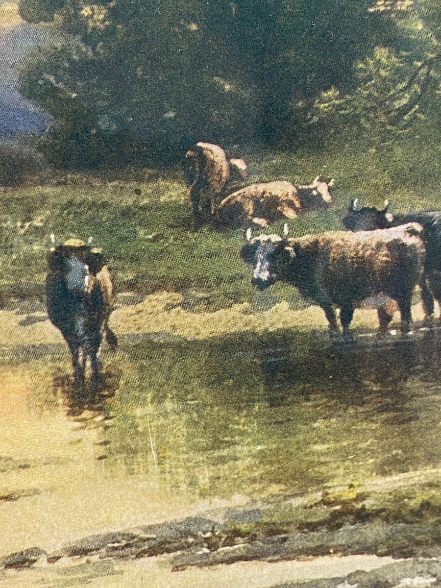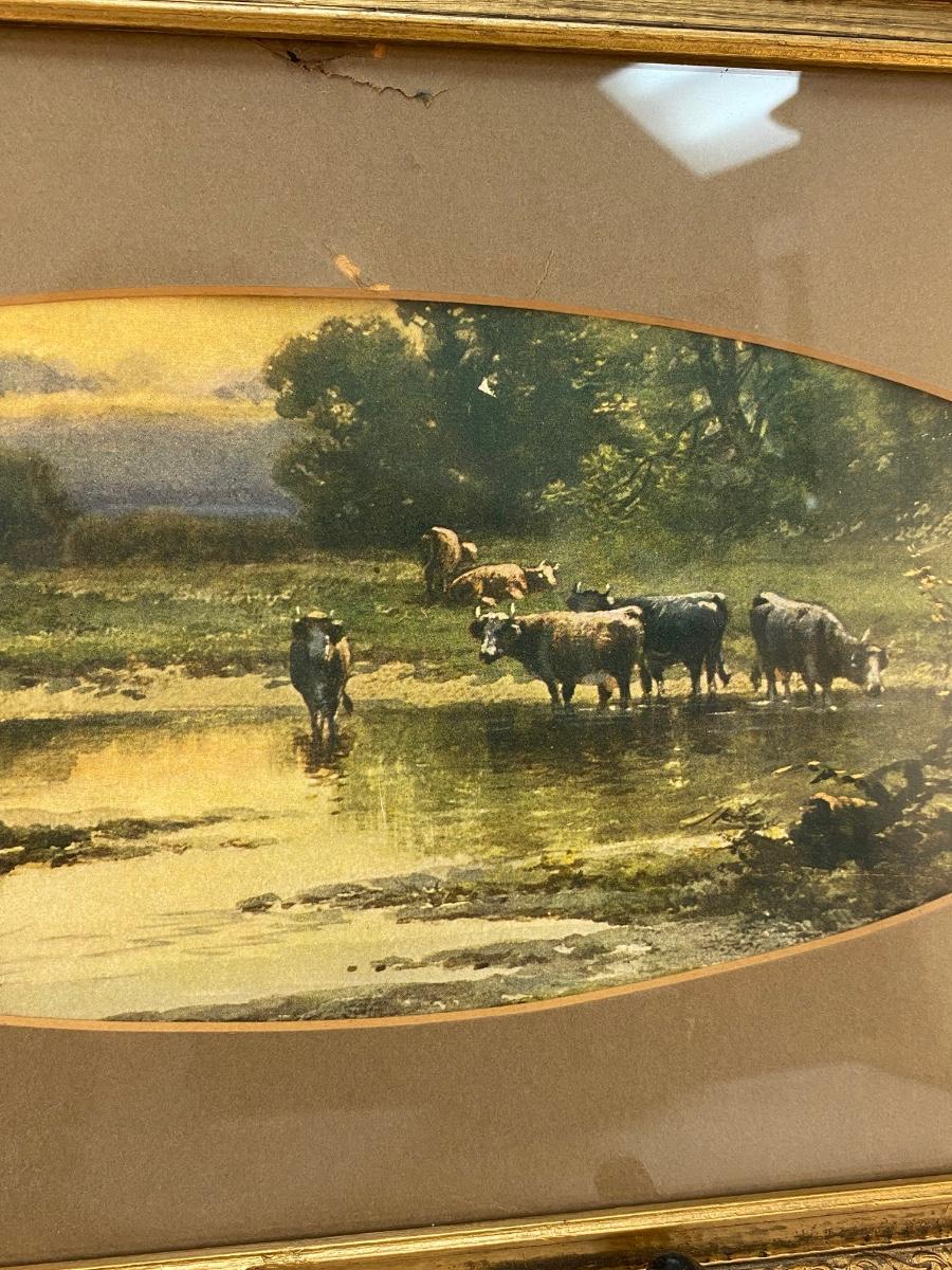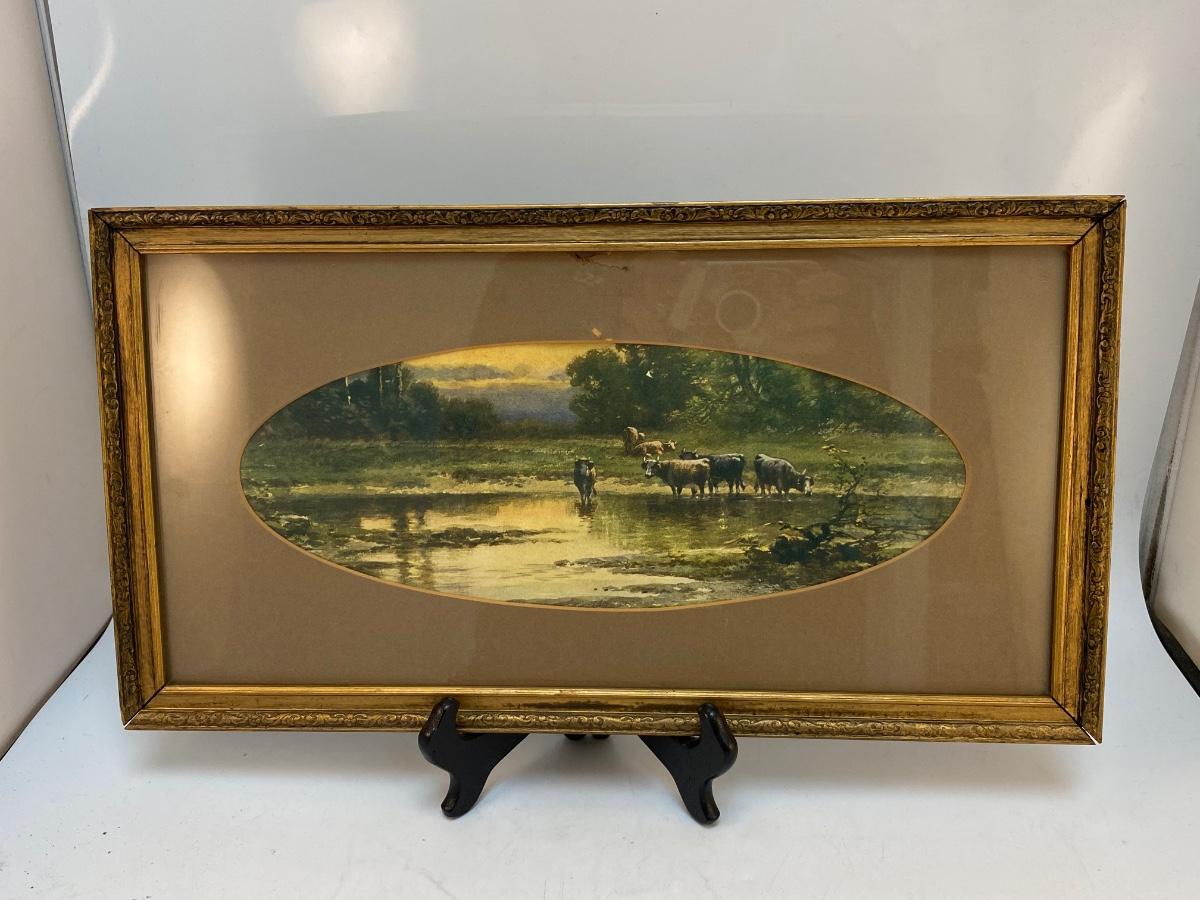 Vintage Framed Print Herd of Cattle by The Water. About 17.5"x9.5" size. There is some damage to matting near the top center and a chip in lower right corner of glass.