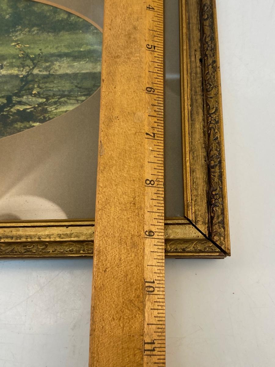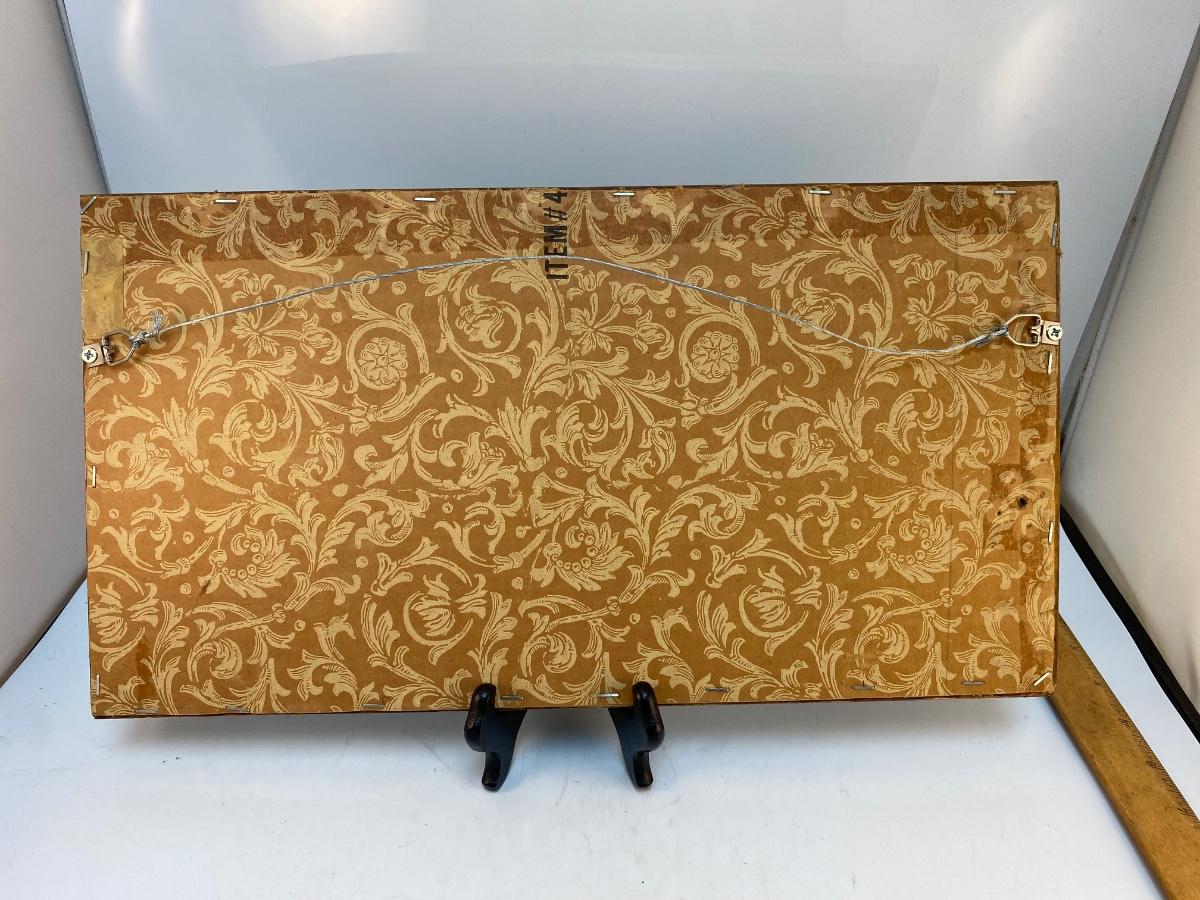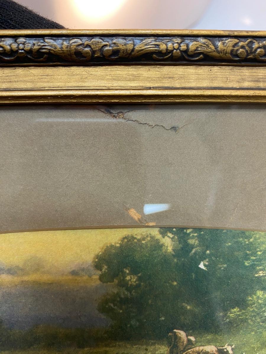 Vintage Framed Print Herd of Cattle by The Water. About 17.5"x9.5" size. There is some damage to matting near the top center and a chip in lower right corner of glass.