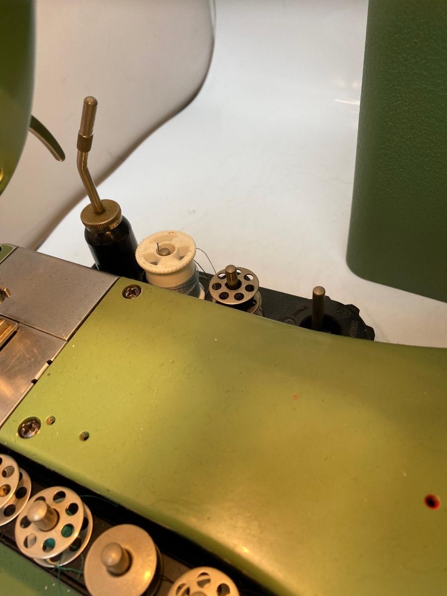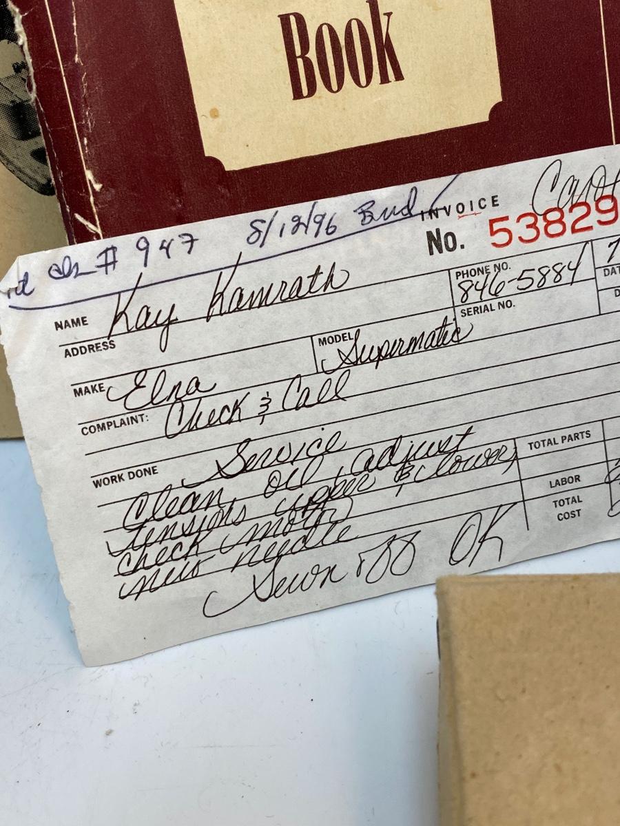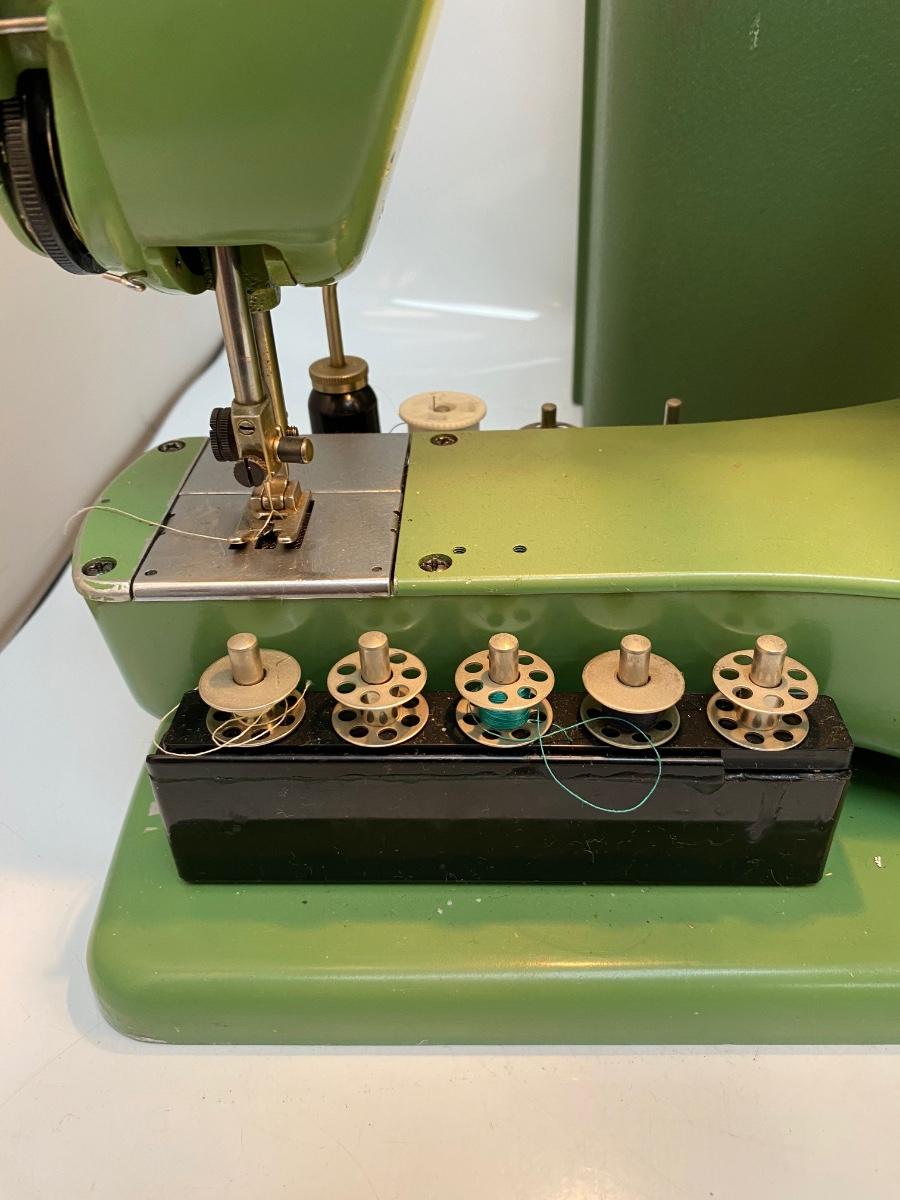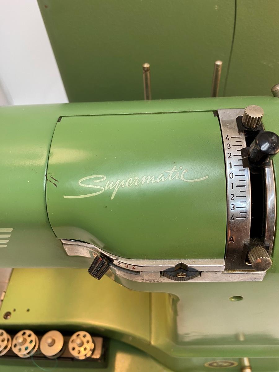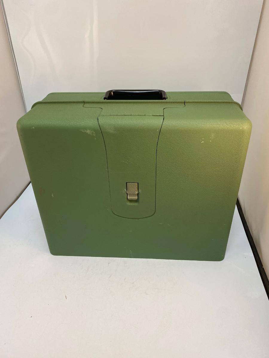 Vintage ELNA Supermatic Jungle Green Sewing Machine with Case. In very good vintage condition. Works. Comes with various accessories and sewing feet, booklet, and receipt of last service. Does seem to be missing knee lever, but you can find replacement online. Did turn wheel and move switches and all seems to be in working order. Last serviced and oiled in 1996.