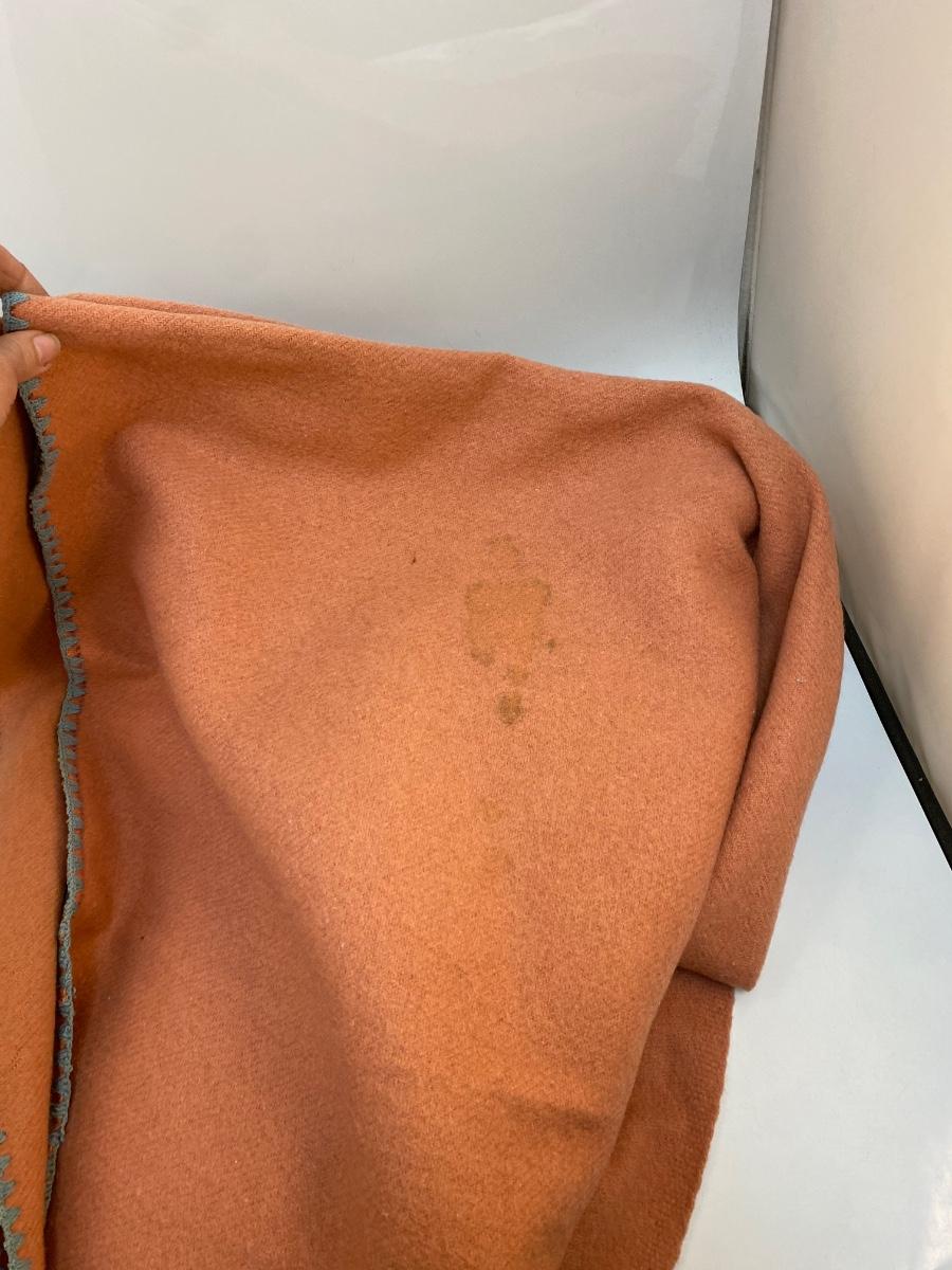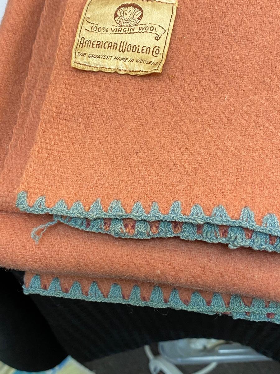 Vintage Coral Pink with Blue Stitched Edge Wool Twin Size Blanket. In vintage condition. There is one spot noticed and may have some light discoloration from age. Seems to be twin sized. Made by American Woolen Co.