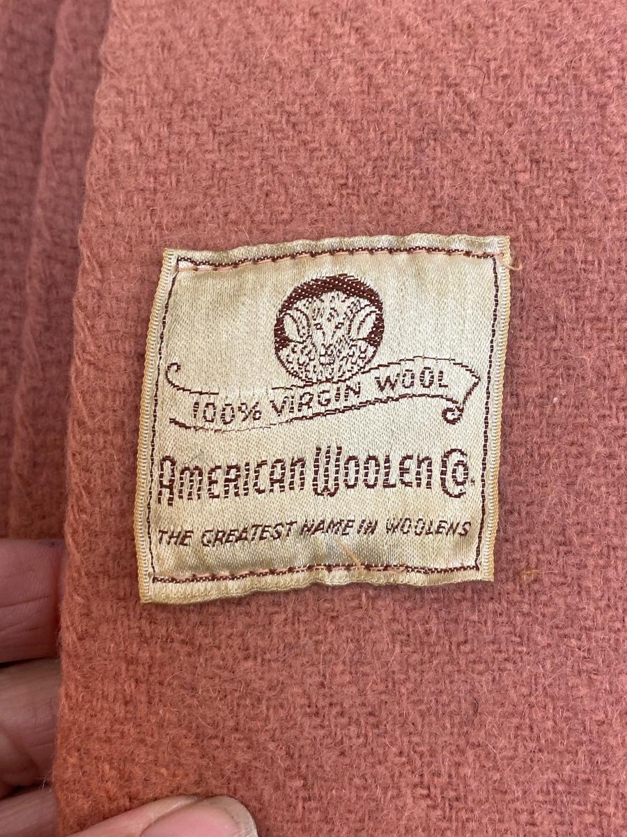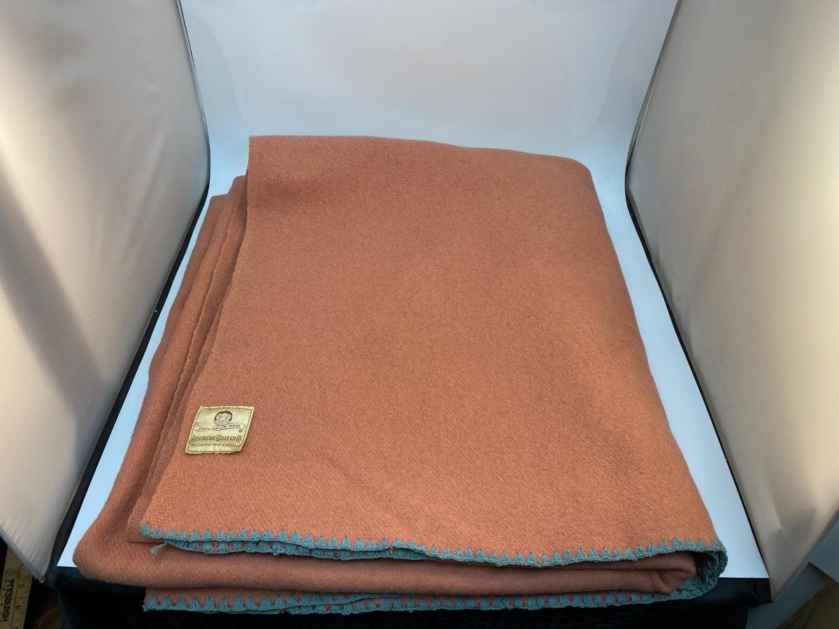 Vintage Coral Pink with Blue Stitched Edge Wool Twin Size Blanket American Woolen Co.