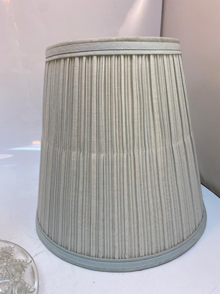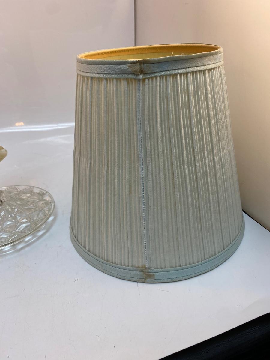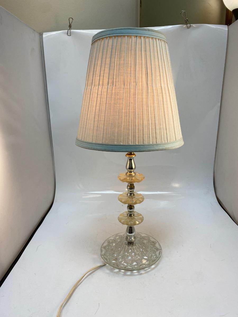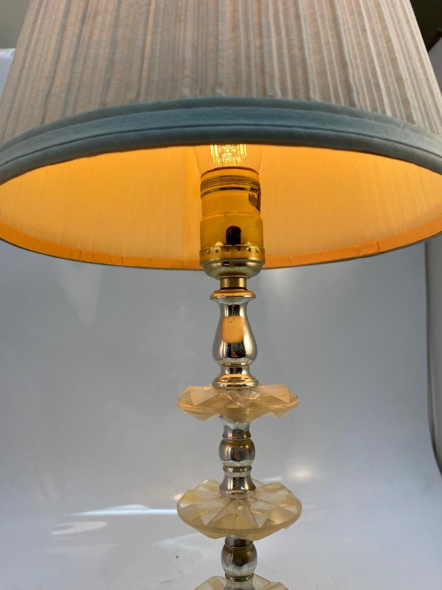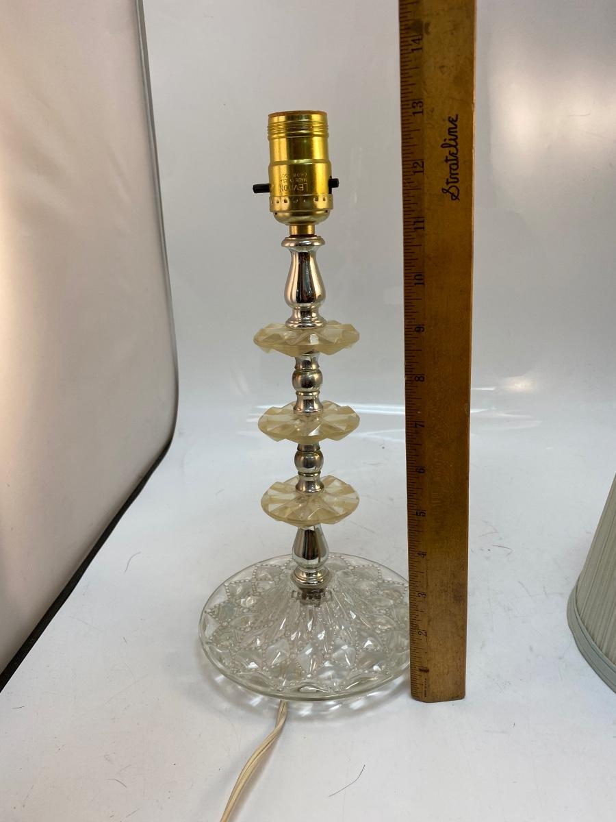 Vintage Shabby Chic Hollywood Glam Pressed Glass and Lucite Dresser Vanity Table Lamp. In vintage condition. Tested with bulb and works. Comes with bulb sitting shade. Shade has an odd crease in fabric and a couple discolored spots at seam. Base is dainty dot pattern pressed glass with silver tone metal and lucite accents. Lucite has yellowed slightly from age. About 13" not including shade.