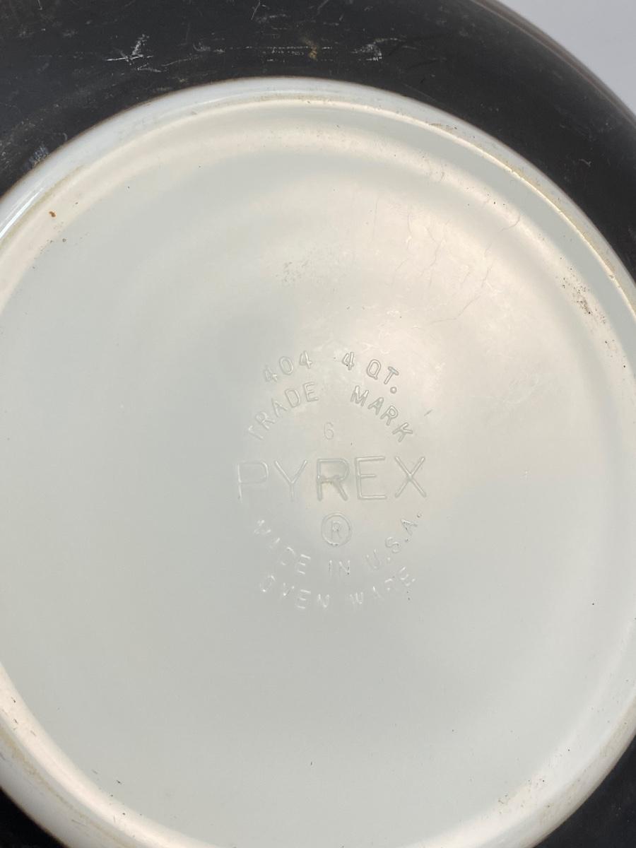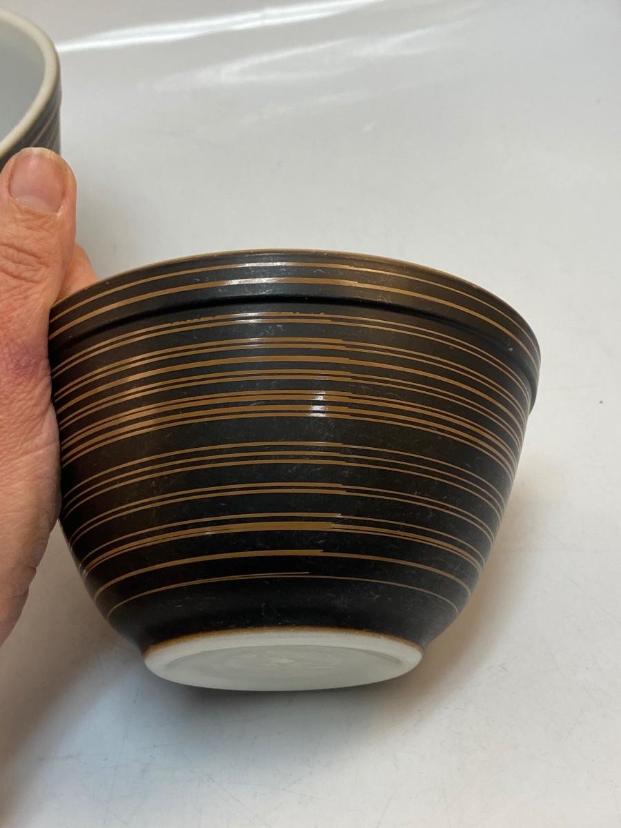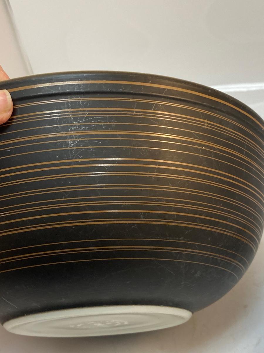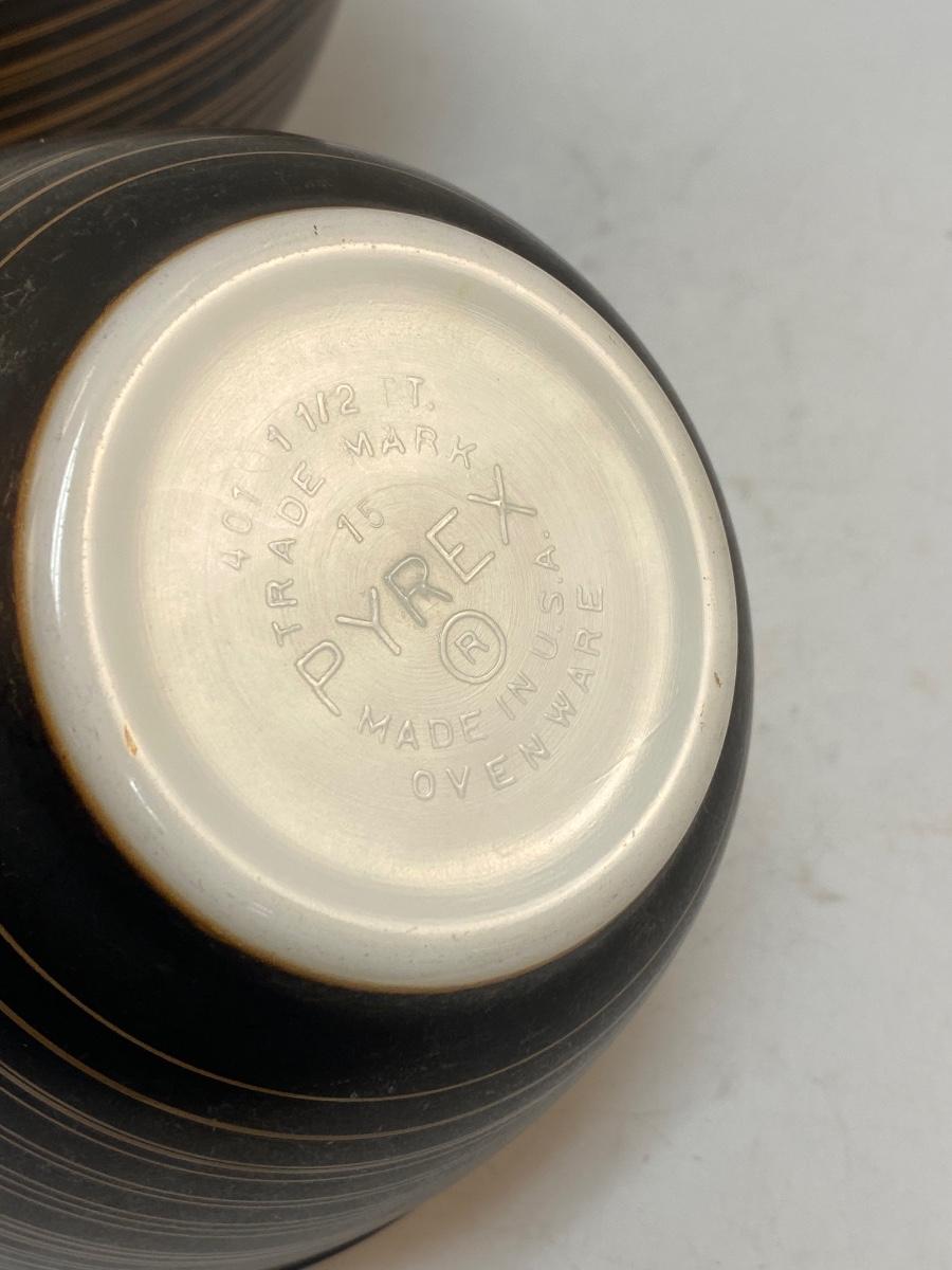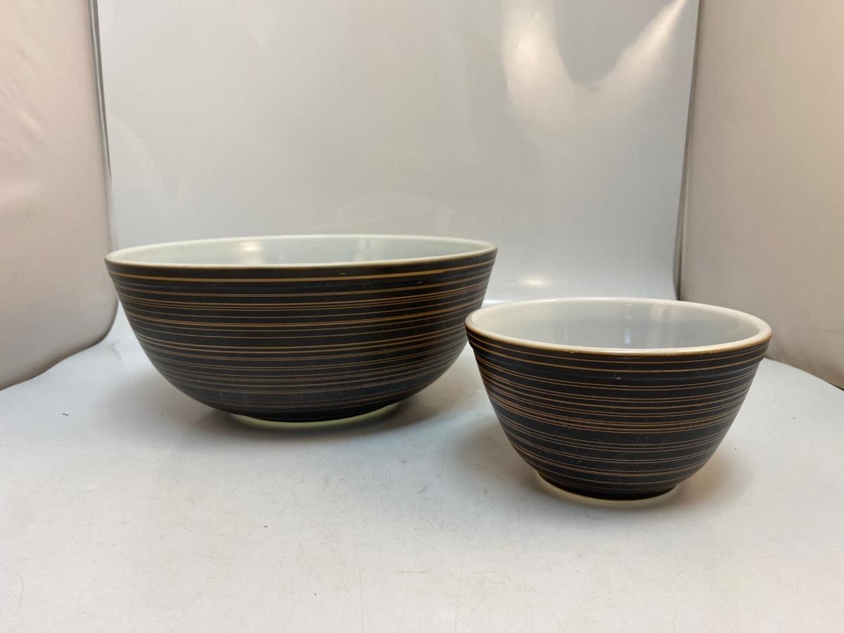 Pair of Vintage Pyrex Terra Black & Brown Stripped Mixing Bowls. In good used condition. Some light wear to the finish, no chips. Large and small sized mixing bowls.