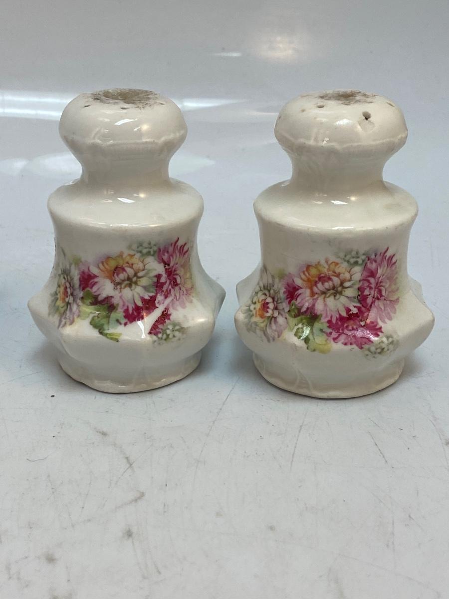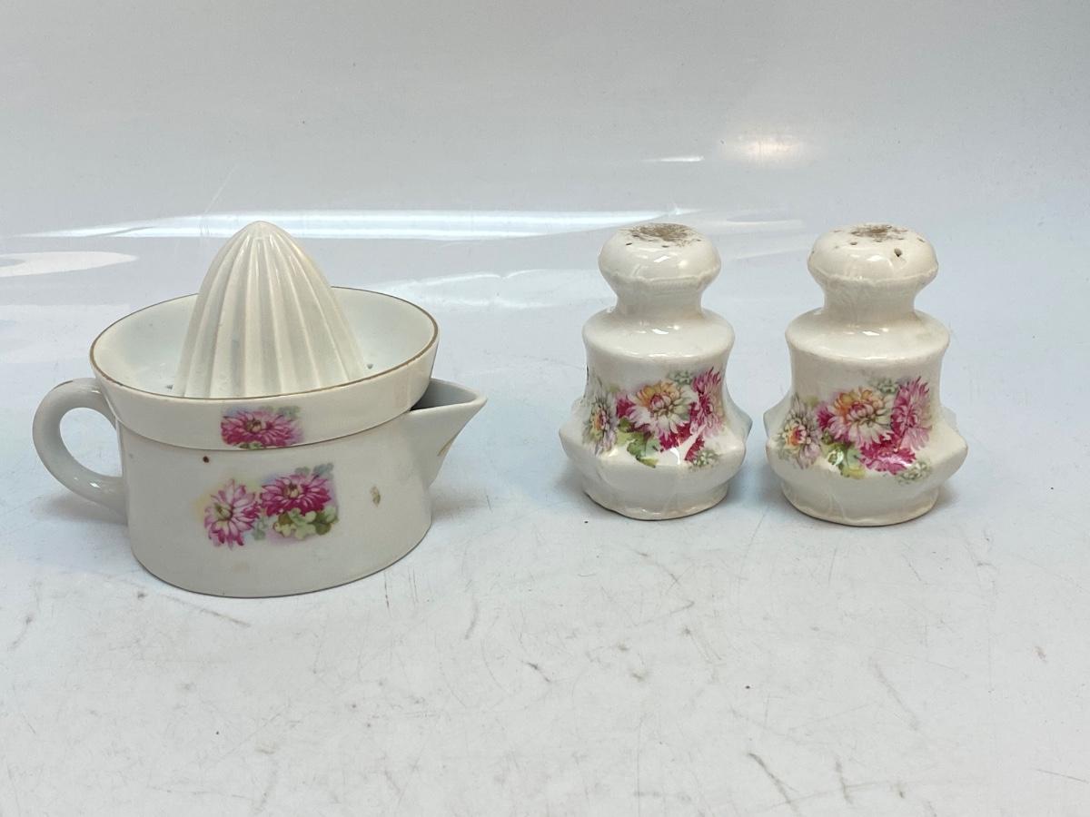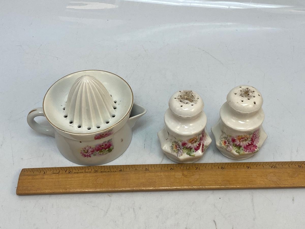Vintage Pink Rose Floral Ceramic Porcelain Mini Juicer and Shaker Set. All pieces are in good vintage condition. No chips, some pattern wear on the shakers and gold accent. Shakers are missing the stoppers as well. Unbranded.