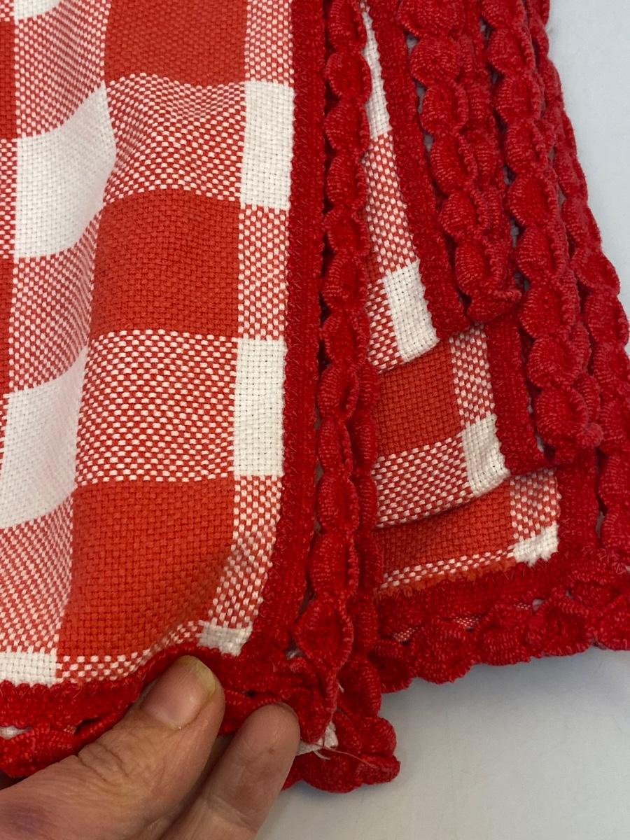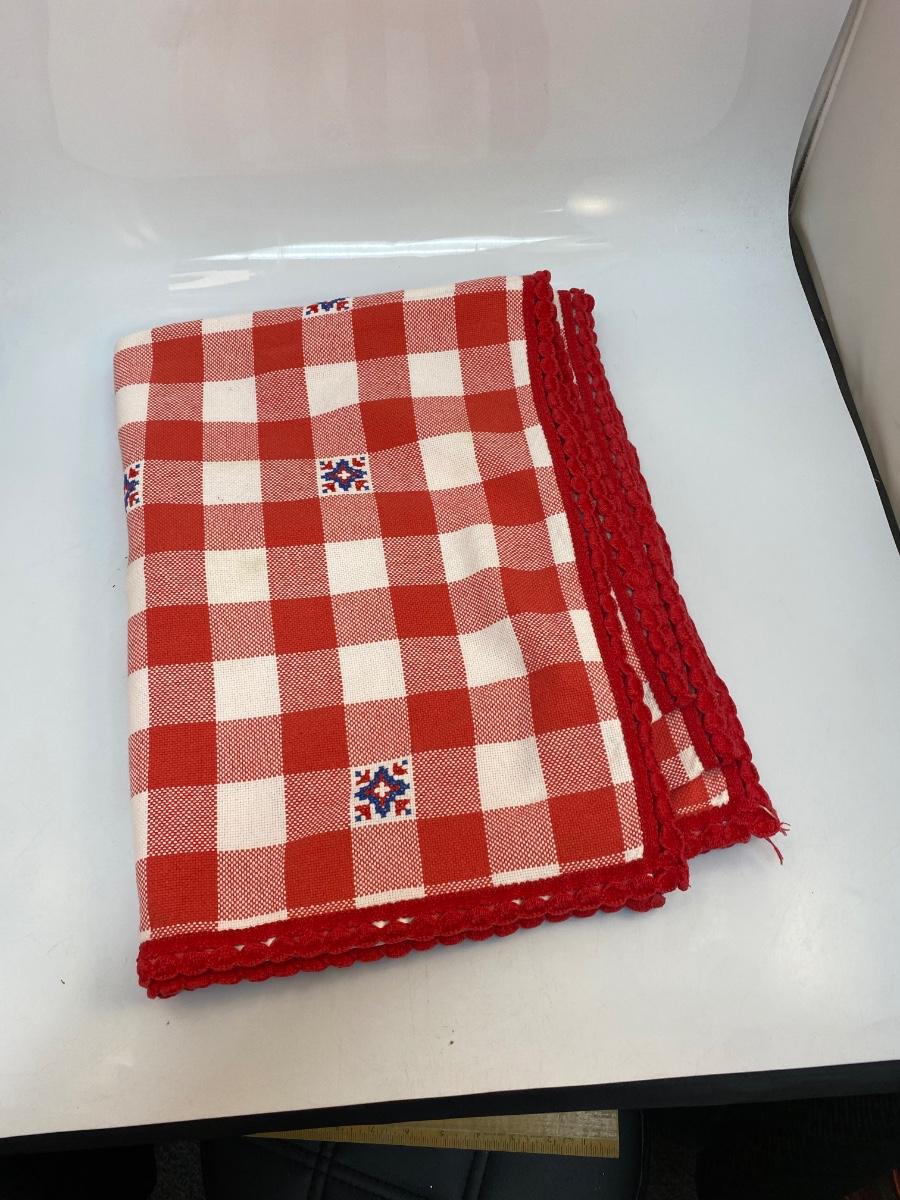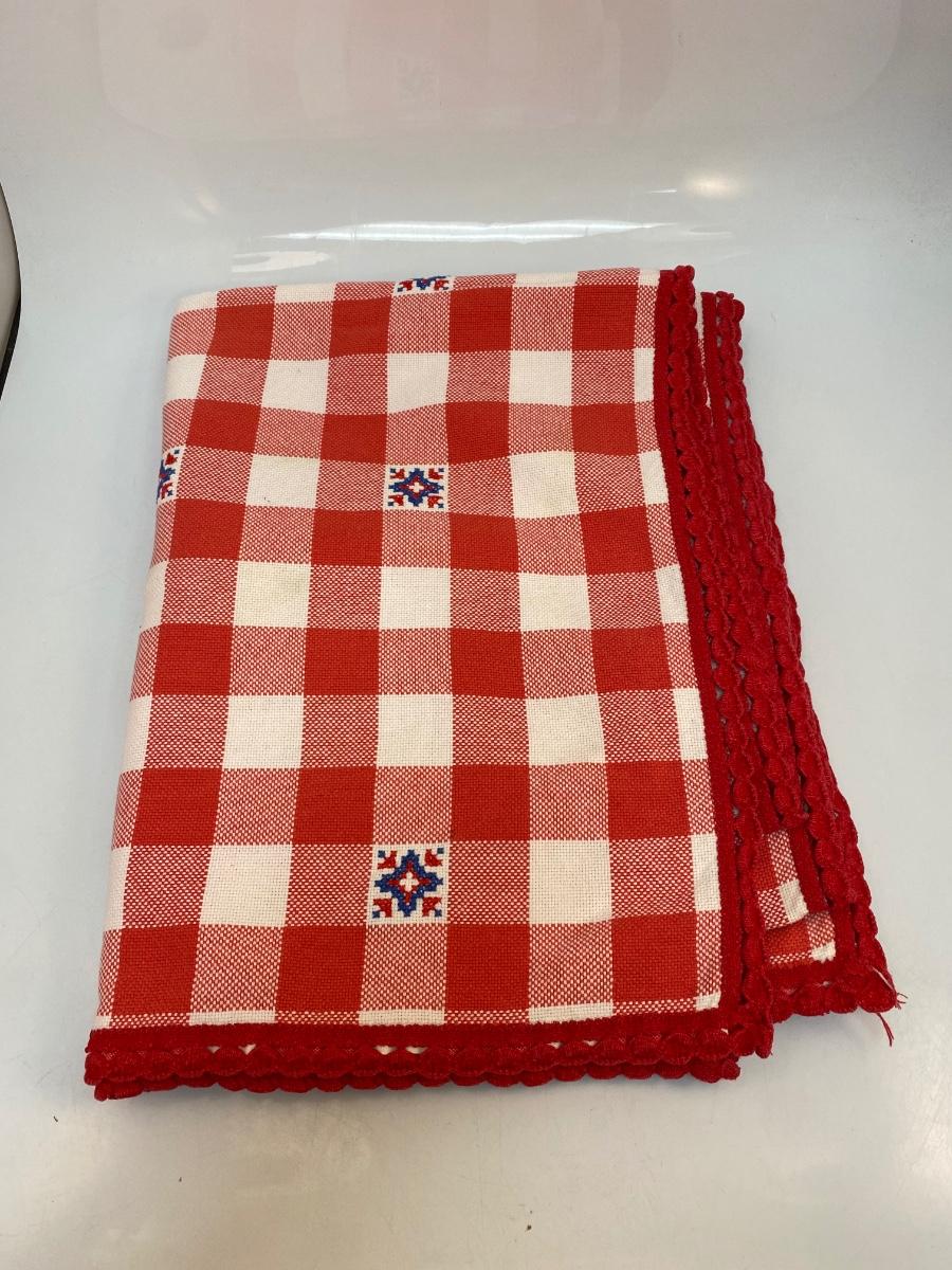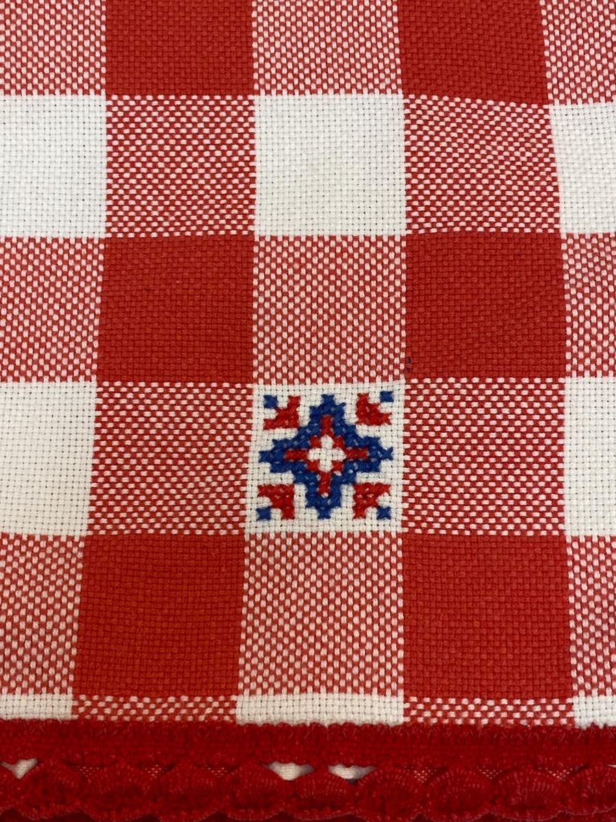 Vintage Red and White Checkered Tablecloth with Random Blue Embroidered Detail Squares