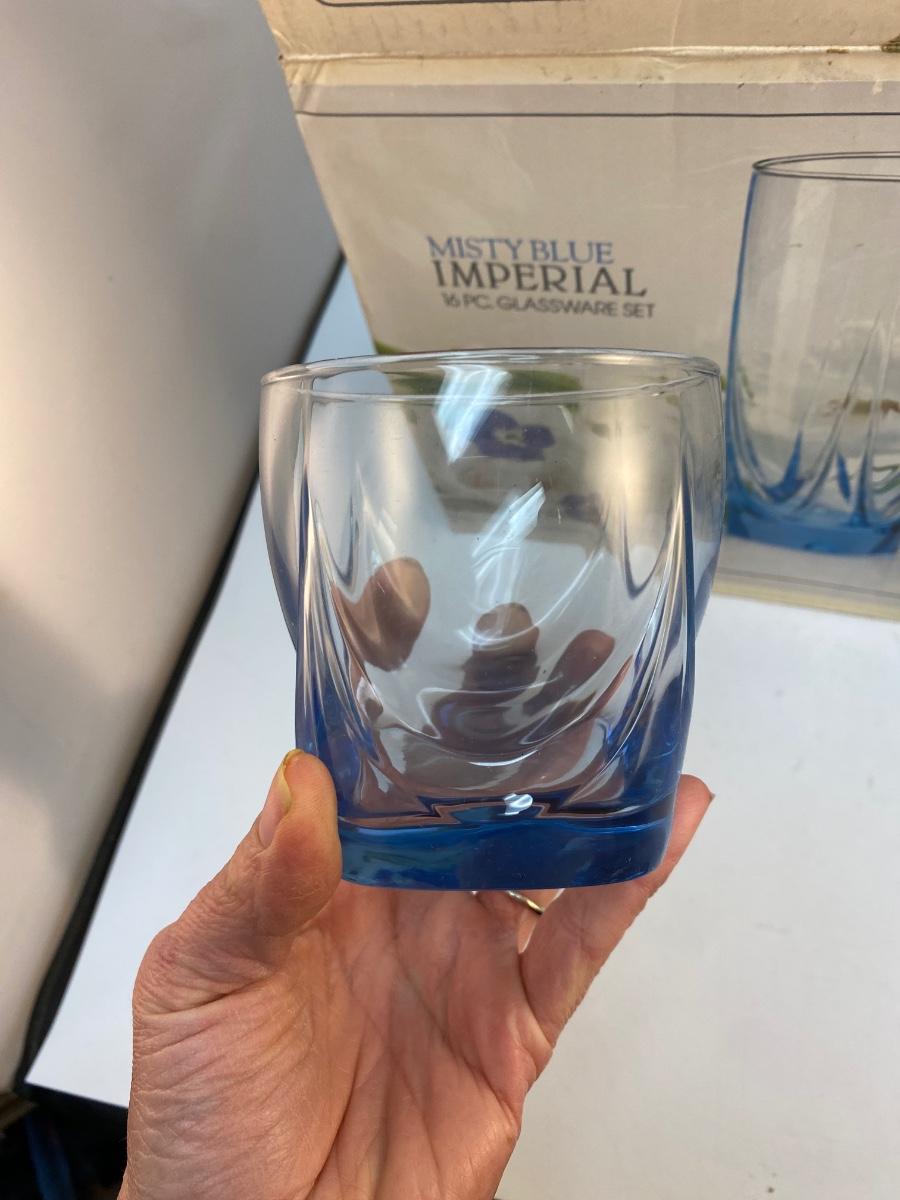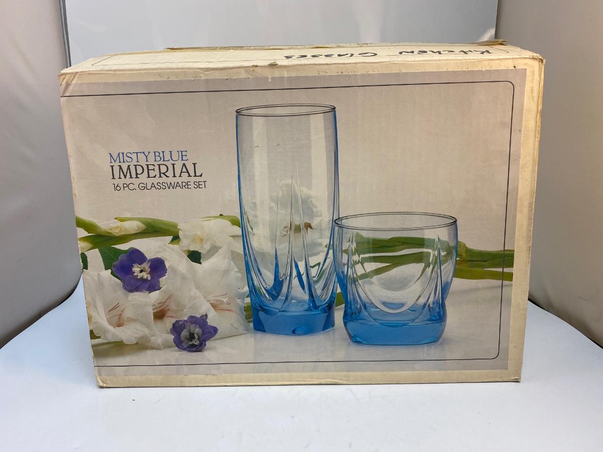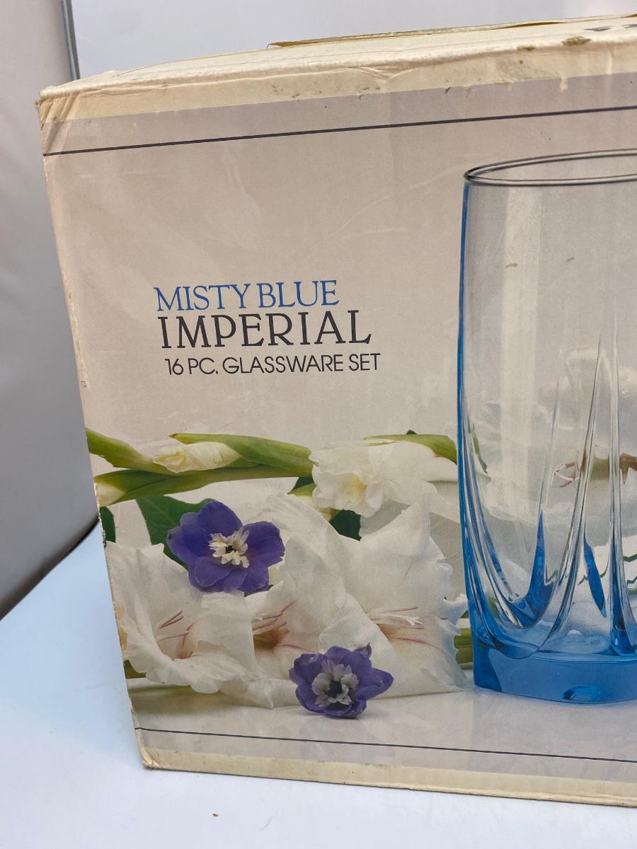 16 Piece Boxed Set Misty Blue Imperial Drink Glasses Glassware Two Sizes. In good condition. Unsure if they have been used previously or just open box.