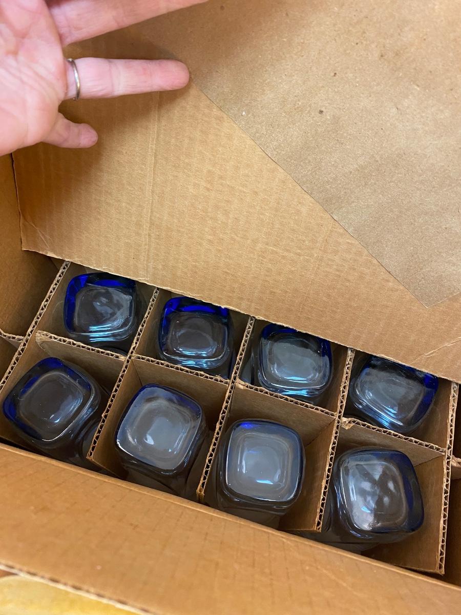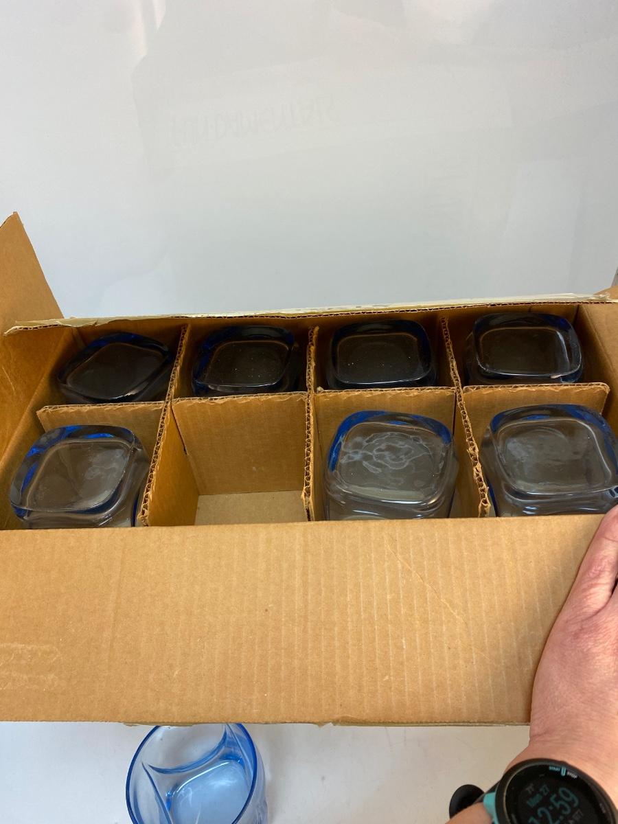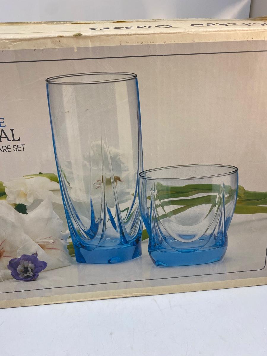 16 Piece Boxed Set Misty Blue Imperial Drink Glasses Glassware Two Sizes. In good condition. Unsure if they have been used previously or just open box.